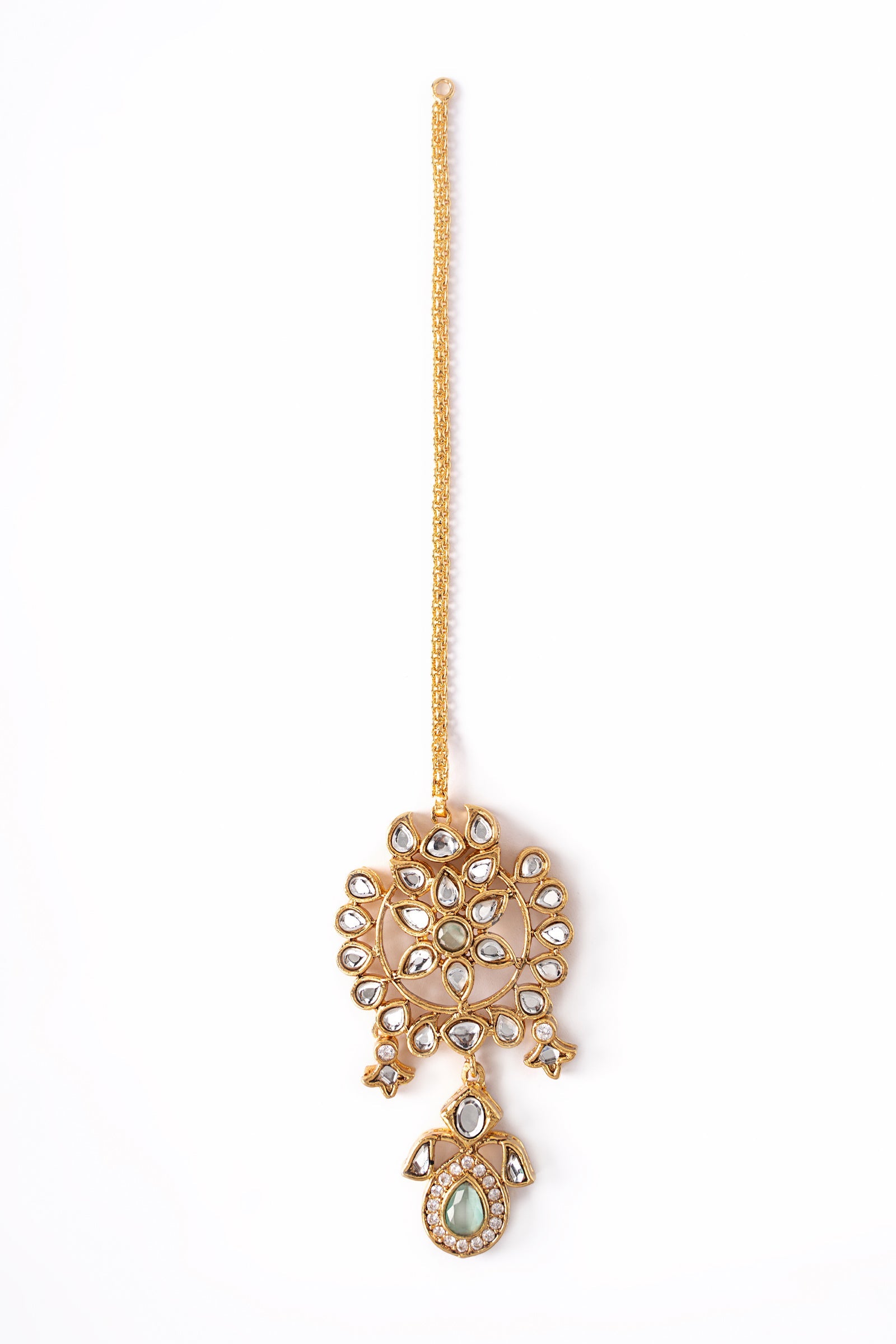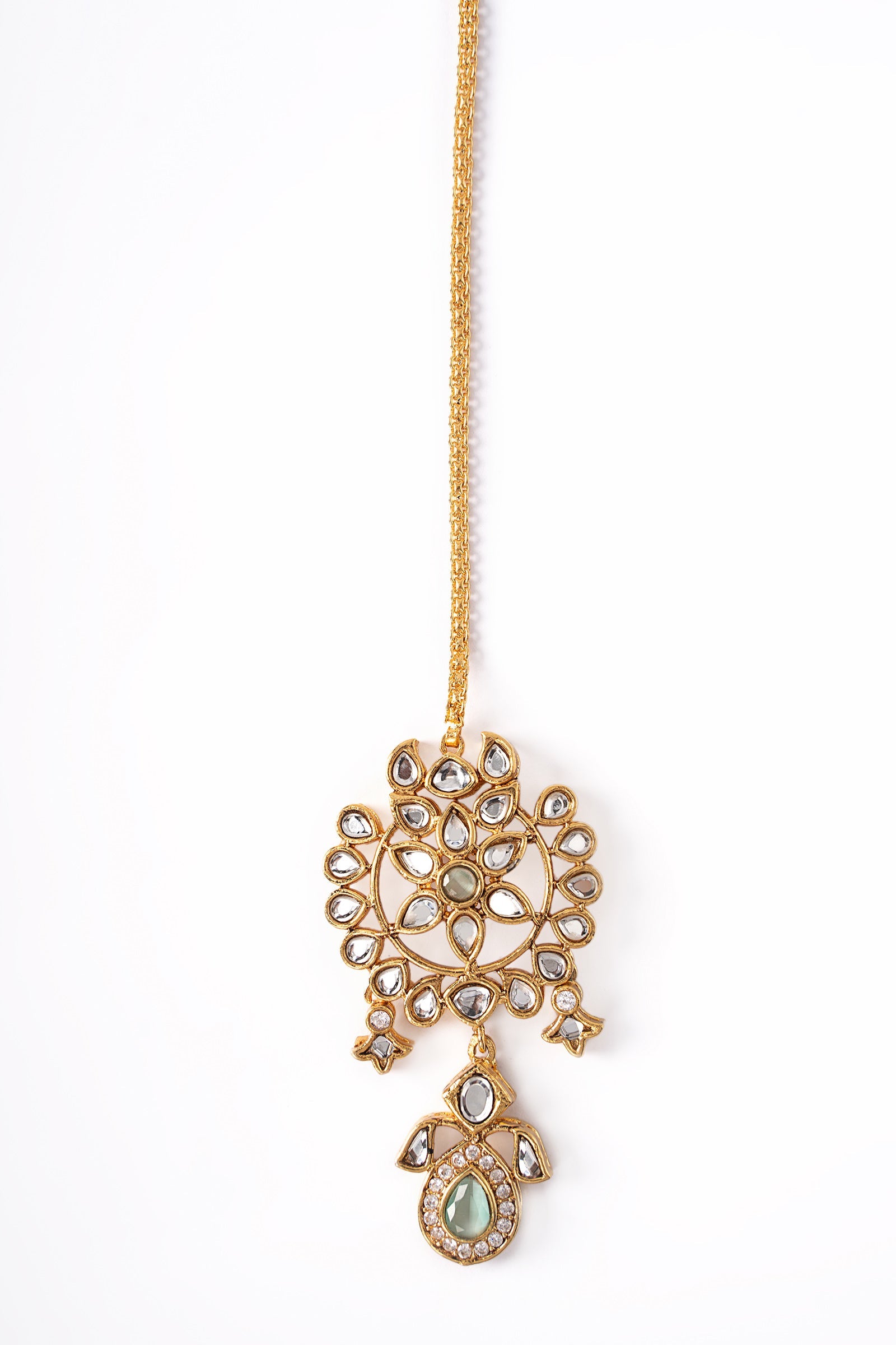 Shine bright with our exclusive bridal Gehna Tikka - Made with premium handcut glass stones with mint green cats eye and white zircons. This masterpiece is perfectly versatile yet traditional to add to your wedding look.