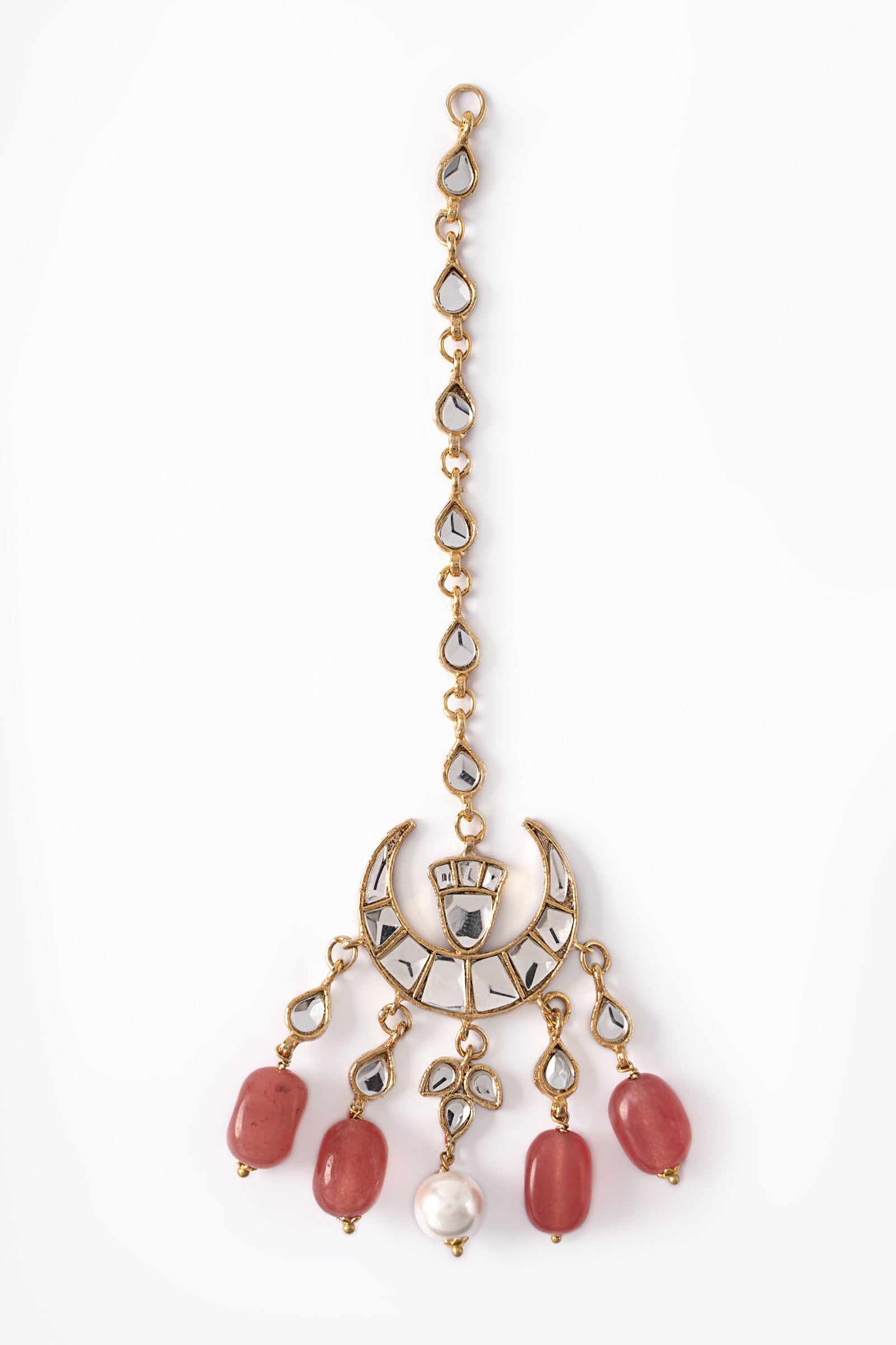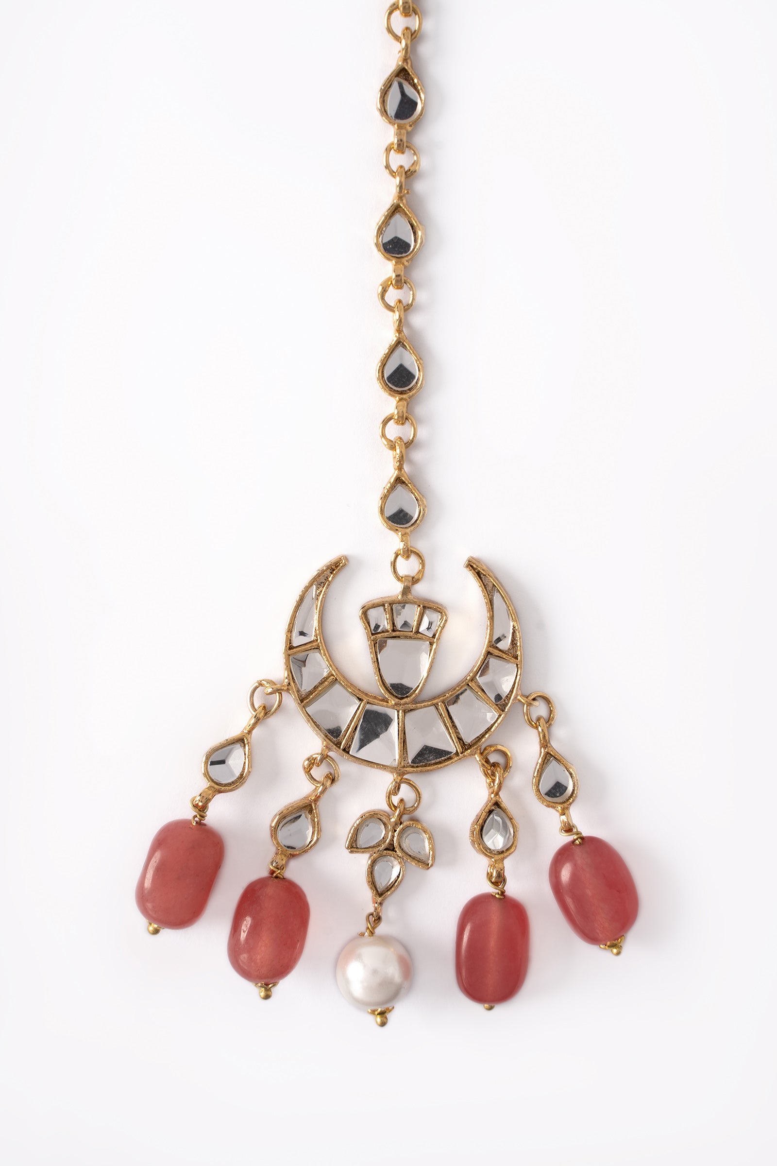 With this bridal Tikka, you add a touch of modern luxury design infused with the love of classical heritage. Studded with handcut glass stone with white pearls pyroi, and pink quartz hanging, it is perfect to add grandeur to your big day look.