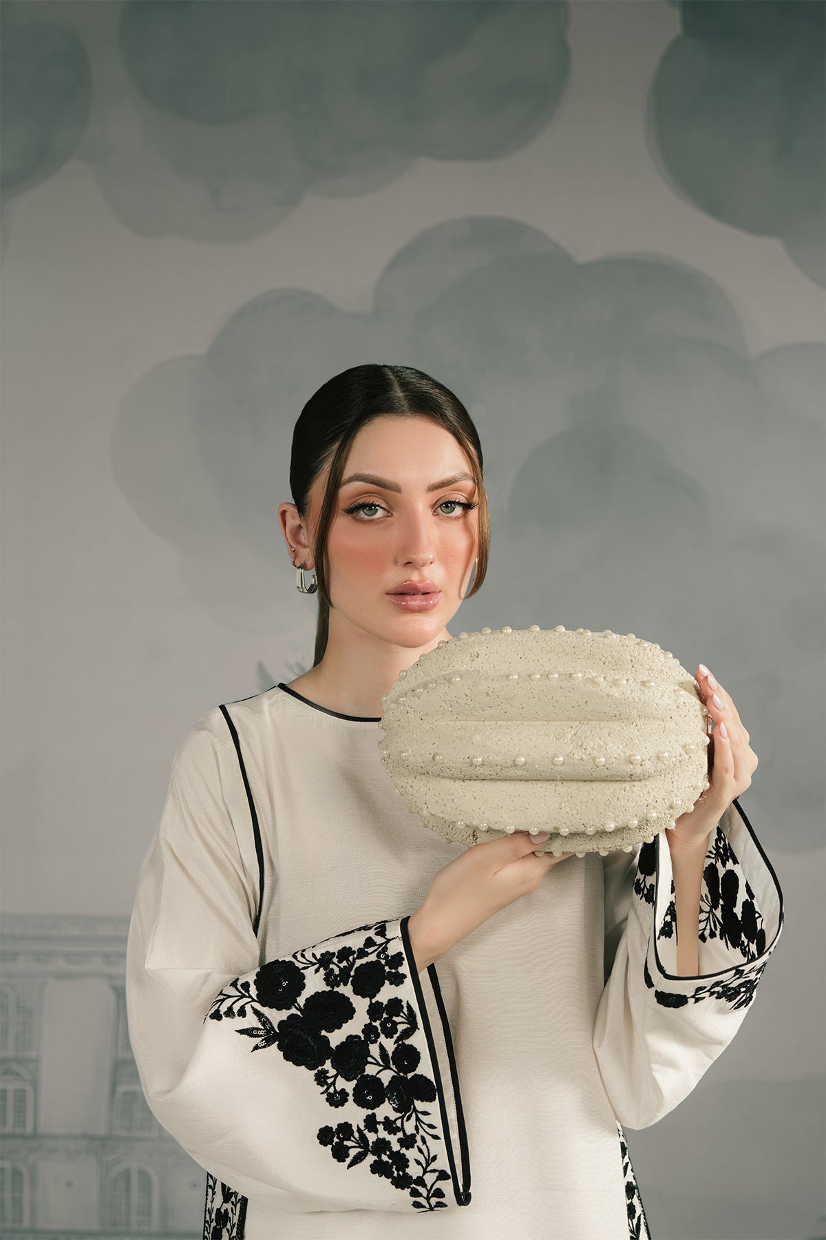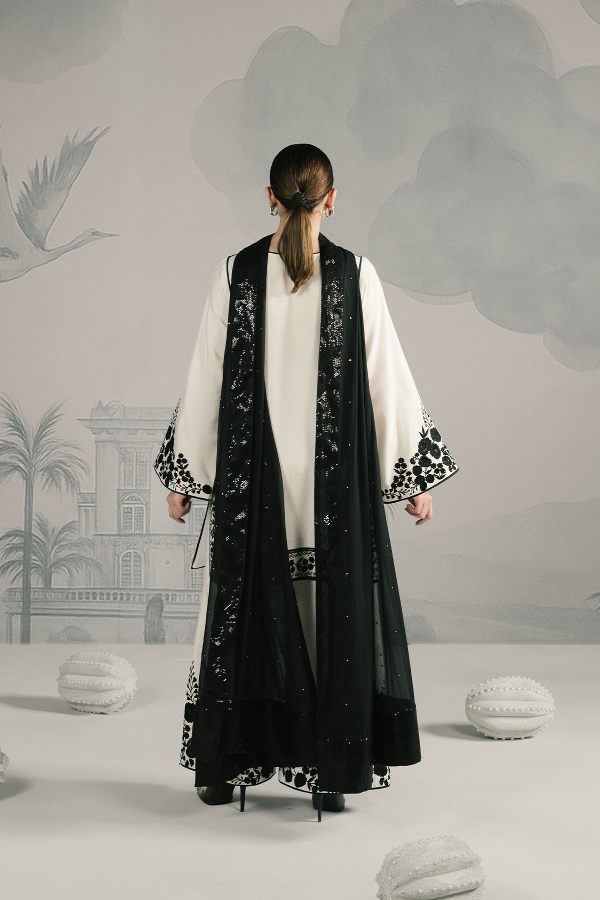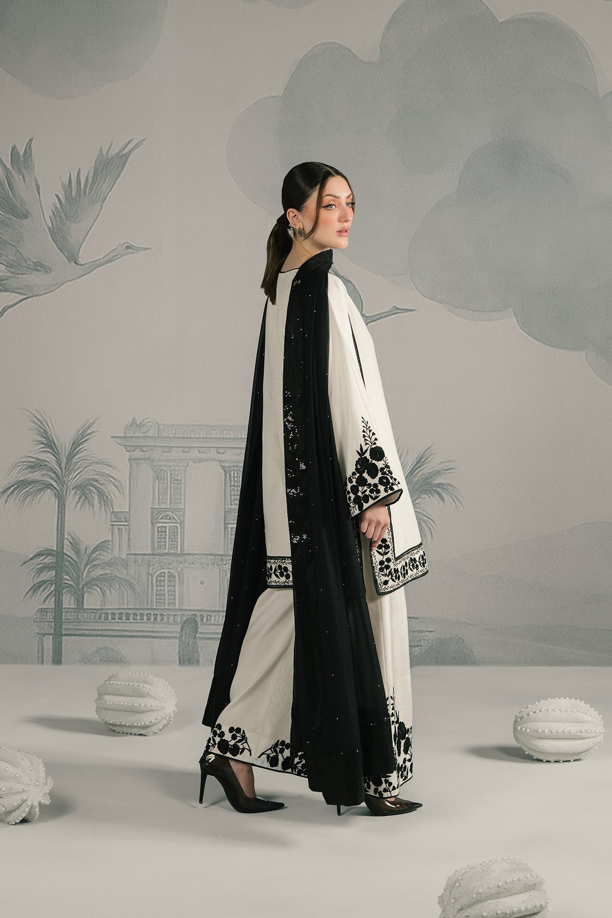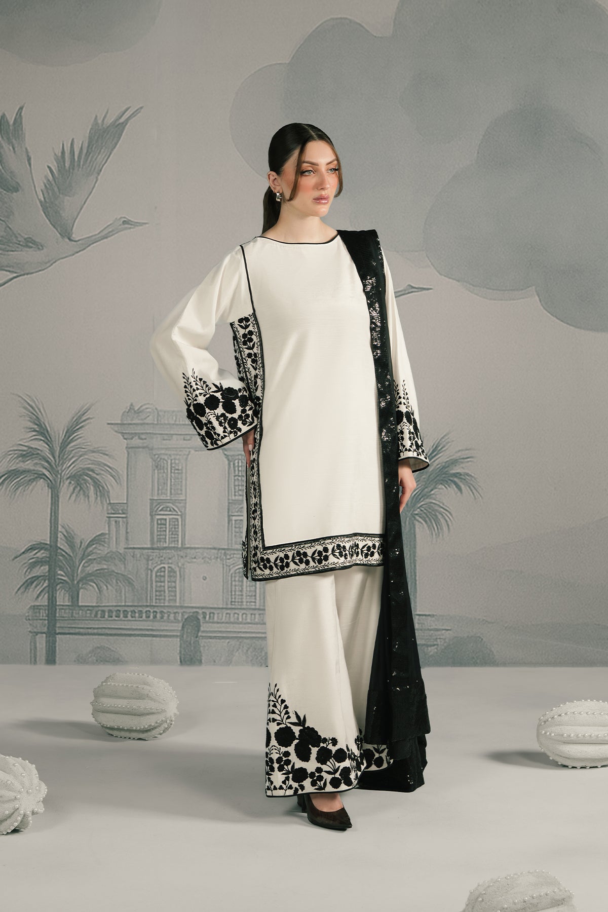A pristine white raw silk shirt with bold black embroidered borders on the hem and sleeves, paired with wide-legged trouser carrying matching detailing. Styled with a contrasting black silk chiffon dupatta featuring delicate floral embroidery, the ensemble strikes a perfect balance between minimalism and statement elegance.