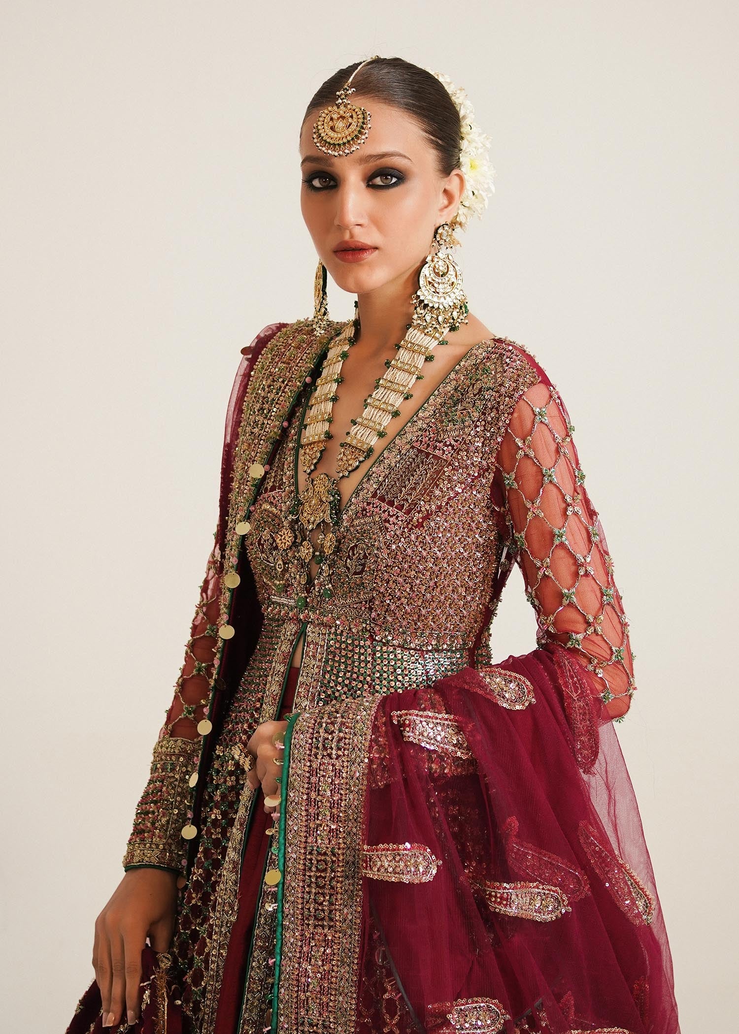 Exuding elegance this 3 piece pinkish red ensemble comes in with heavily embellished with pretty gold adda work net bodice adjoining a full circle skirt creating a perfect peshwaz with gorgeous borders at hems and a jaal on the panels. It has been paired with stunning satin silk lehenga with a pretty border and Botis throughout. To create a perfect bridal showstopper it comes with a regal net dupatta intricately embellished with gold adda work on all borders finished with a contrasting facing and beautiful motifs throughout.
