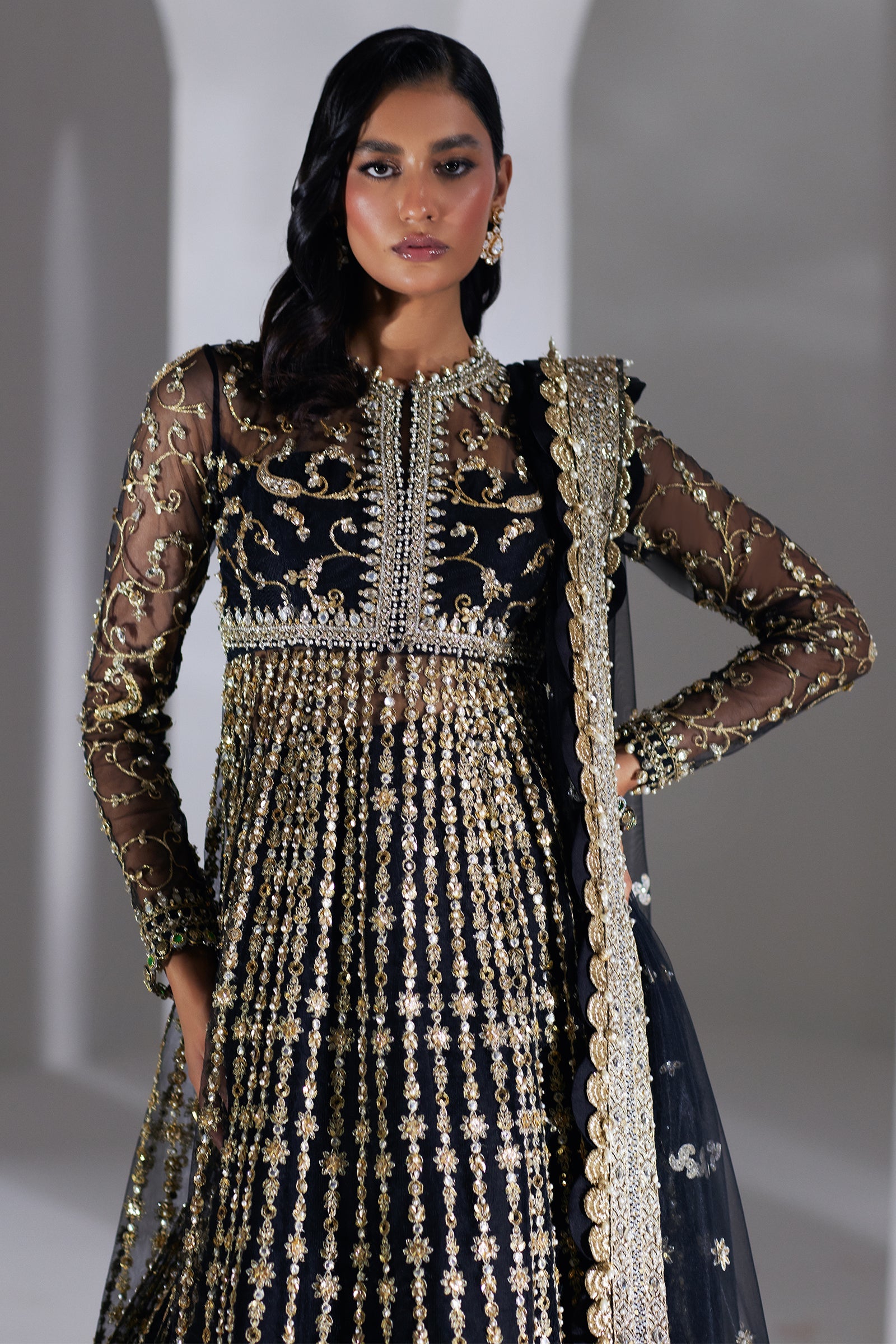 Introducing ‘Lueur Dorée,’ an extraordinary ensemble destined to command the spotlight with its opulent elegance. This luxurious masterpiece, crafted from a sumptuous obsidian canvas, is adorned with an exquisite array of sequins, crystals, GOTA, and ebony pearls, all accentuated with scintillating gold to create a striking and unforgettable statement. The intricate embellishments form patterns that resemble verses of gilded poetry, meticulously woven into the fabric. Paired with a diaphanous organza dupatta, framed by an exquisitely embellished border, this ensemble epitomizes the pinnacle of refined design and style. Ensuring the wedding festivity is transformed into a vision of sophistication and charm, ‘Lueur Dorée’ stands as the quintessential highlight of any celebration, embodying timeless luxury and unparalleled beauty.
