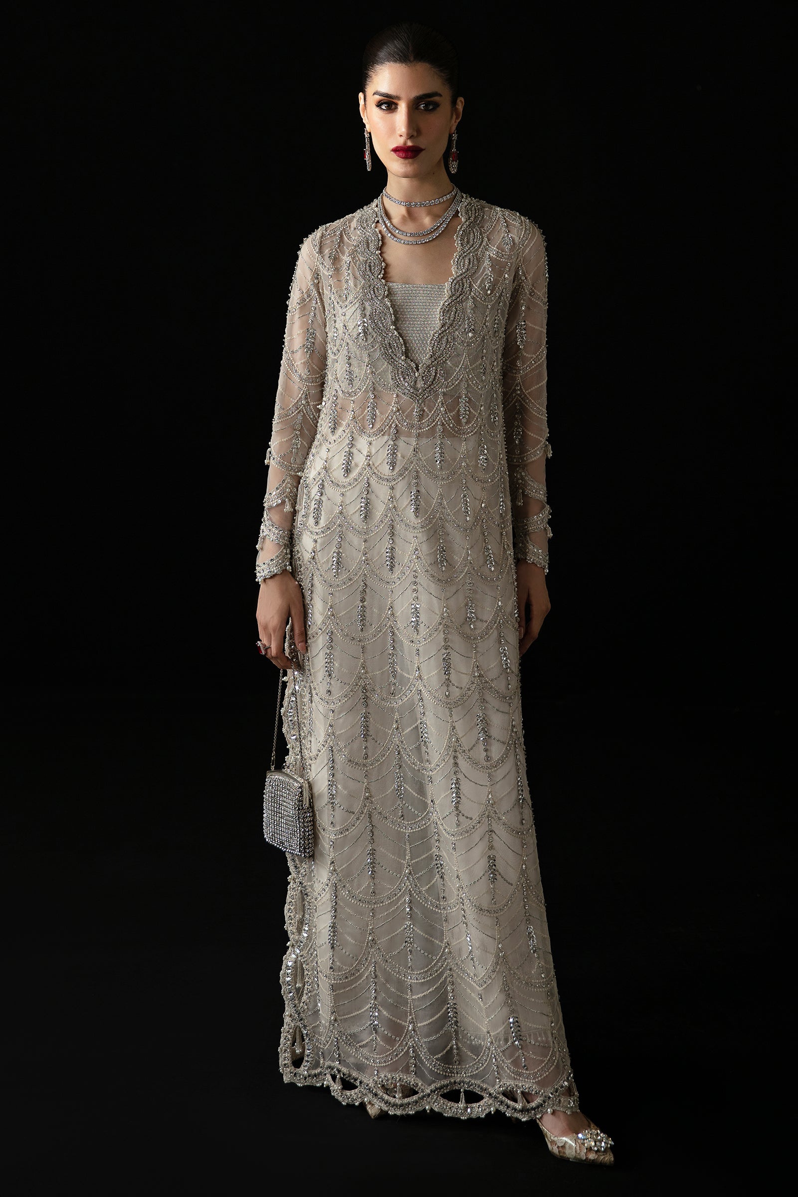 Immerse yourself in unparalleled opulence with Lumière de Neige—a breathtaking masterpiece adorned in a symphony of radiant crystals, lustrous pearls, and intricately crafted cutdana. This ensemble reveals a refined, elongated silhouette, with a shirt that is impeccably tailored to evoke an aura of regal grandeur. Paired with flawlessly sculpted trousers and a shimmering bustier, Lumière de Neige exudes an ethereal elegance, encapsulating the very essence of luxury and haute couture. Every meticulously curated detail of this silhouette speaks to an unmatched level of sophistication, commanding attention and captivating all who behold it. Lumière de Neige is the epitome of timeless allure—an unparalleled statement of high fashion