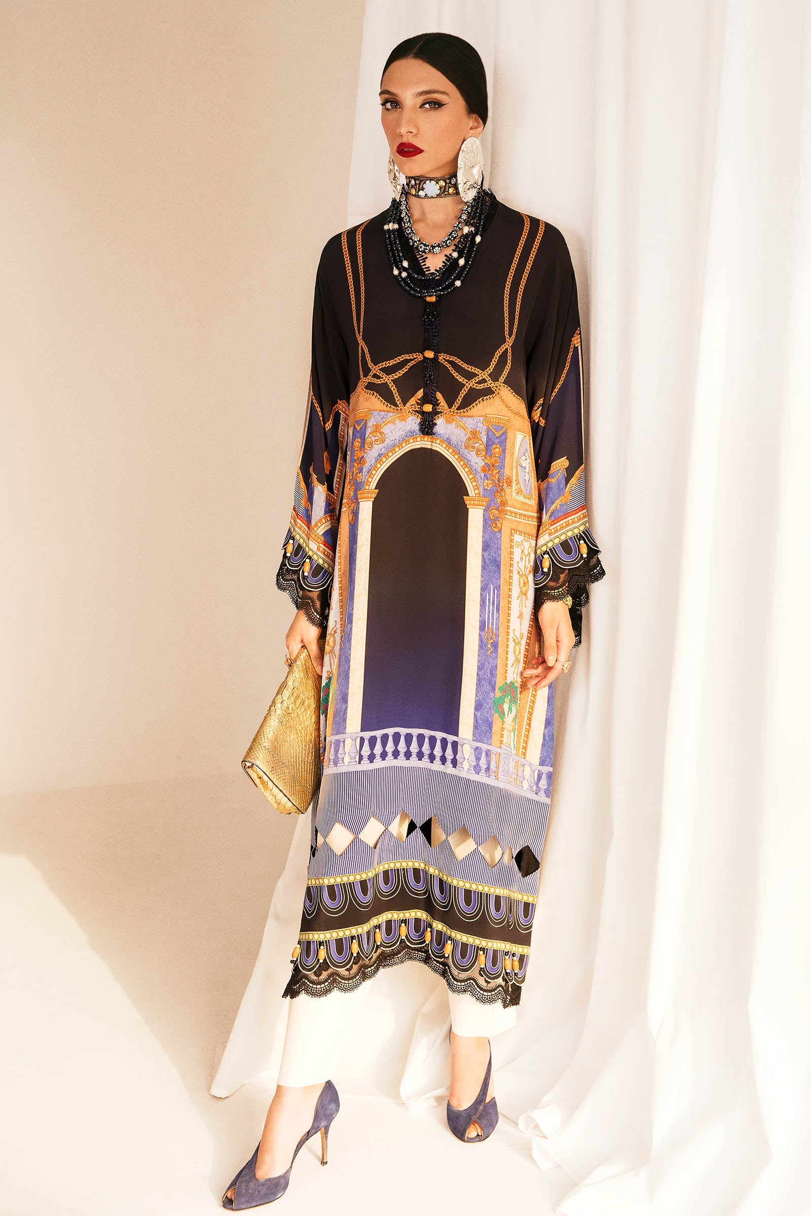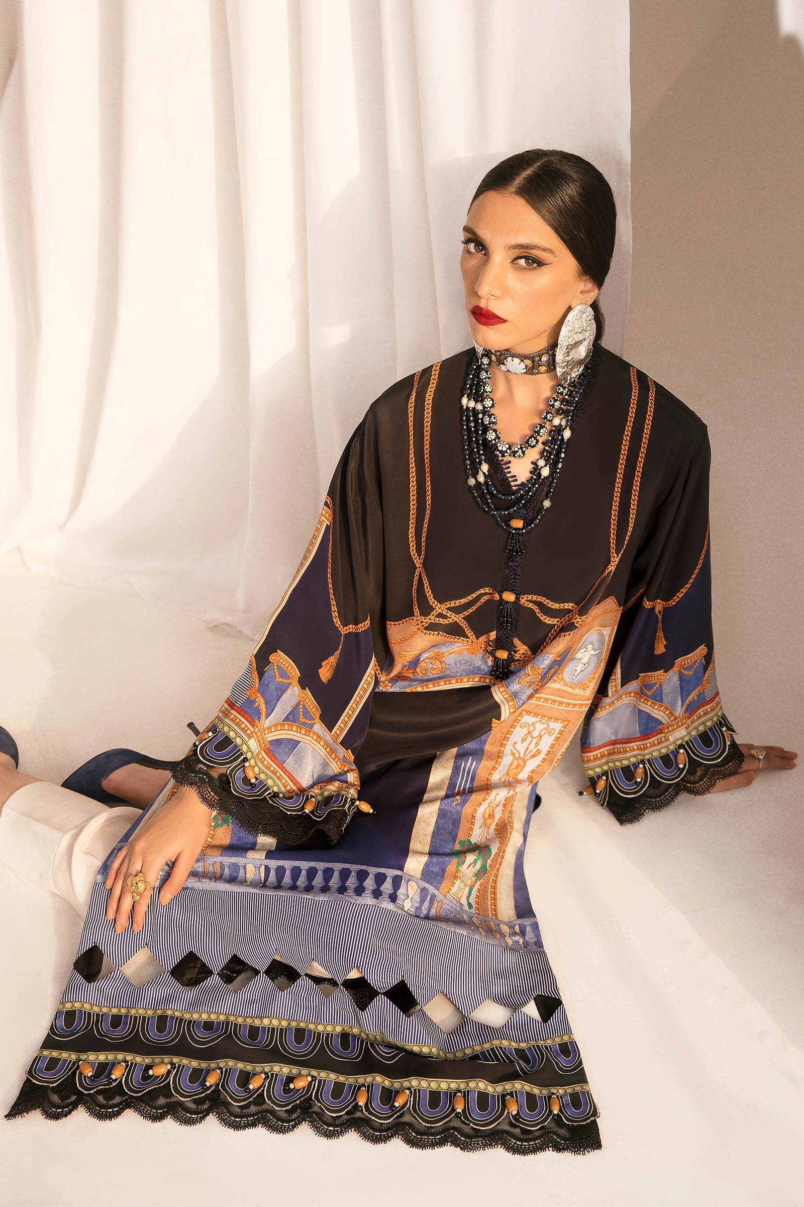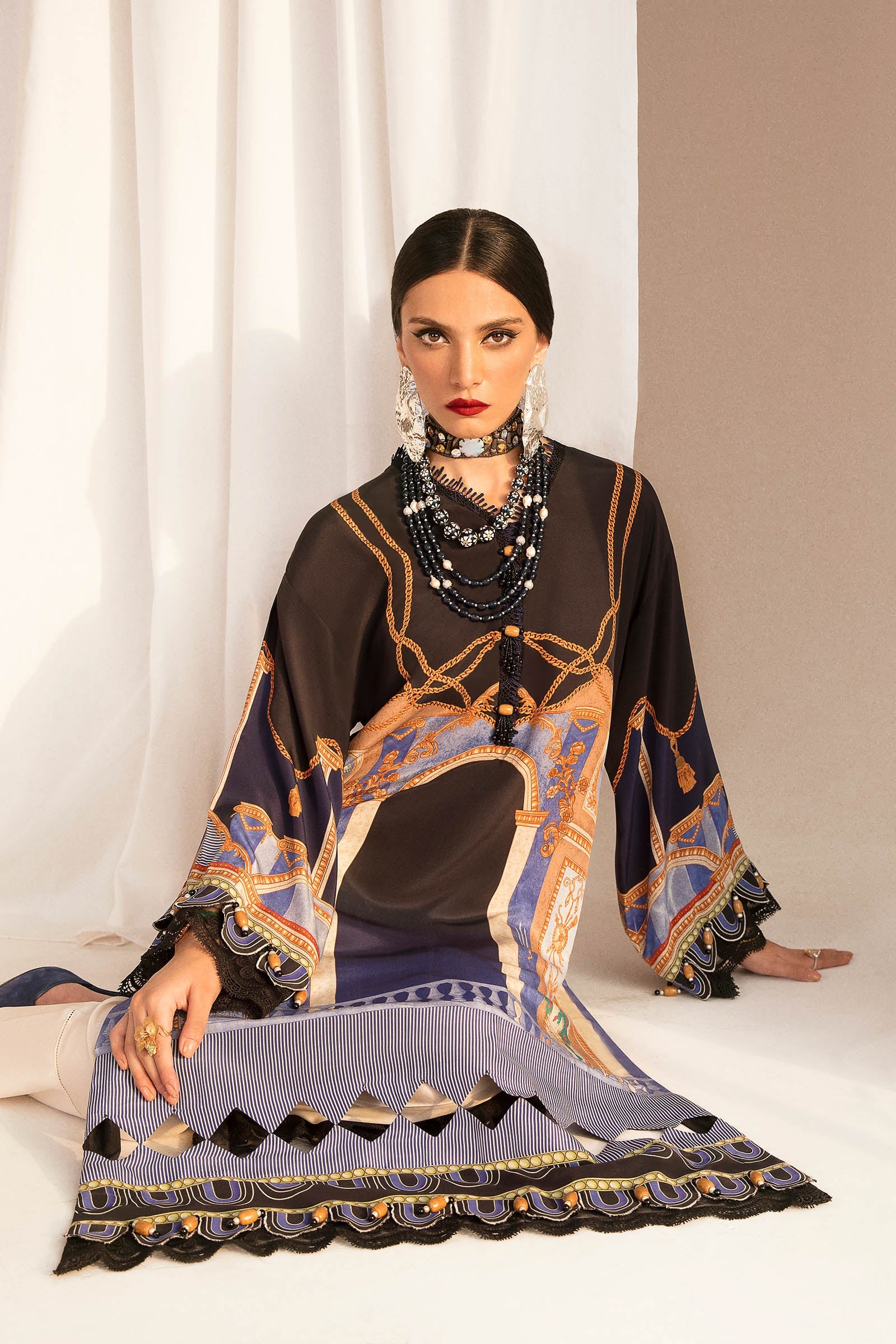 ‘Hana' - an iconic, flowing design that makes an instant statement. This obsidian shirt is crafted from premium silk color blocked with indigo and accents of sandstone and ivory to create an artsy composition. This is a perfectly apt look for a woman who wants to make all heads turn!