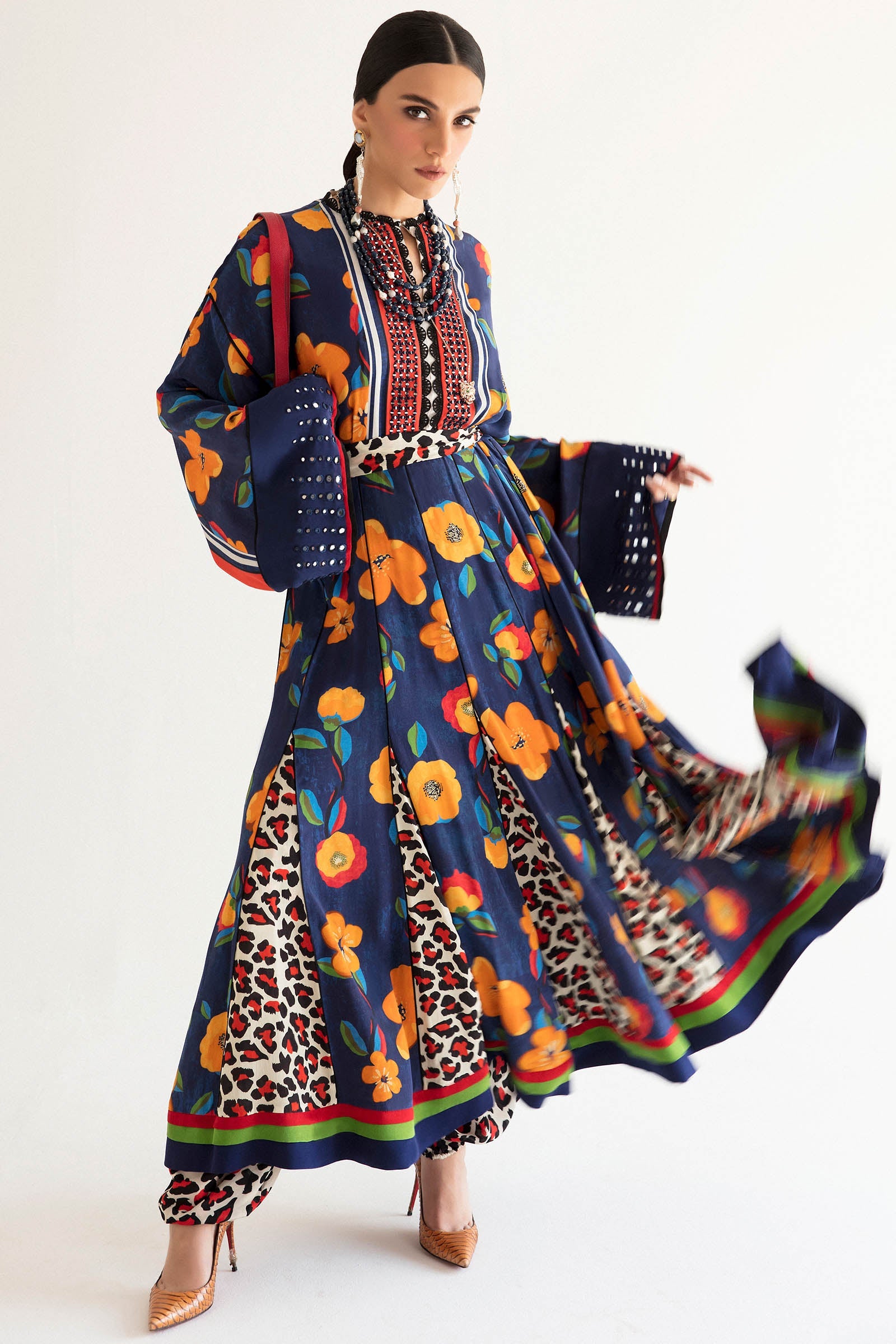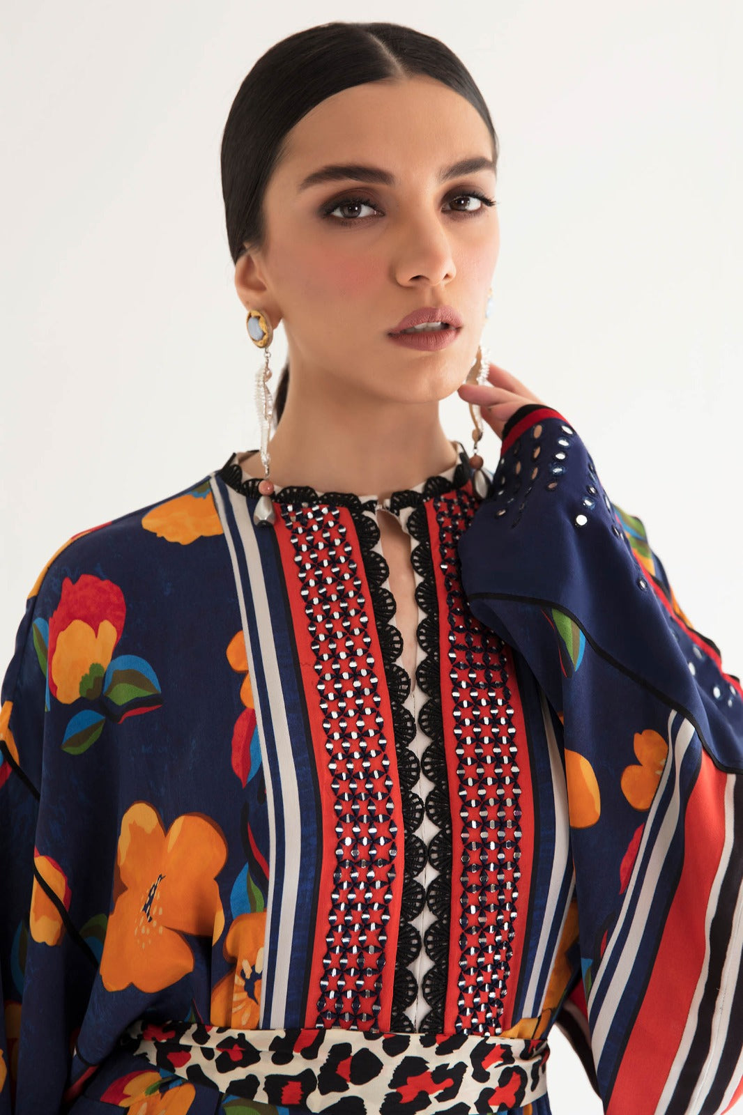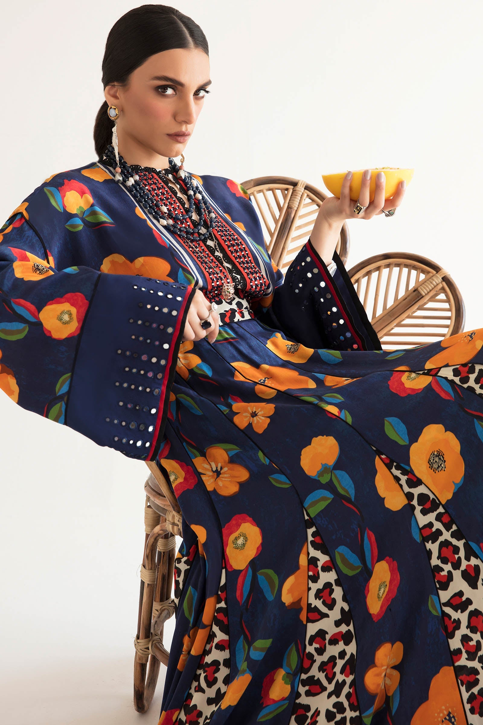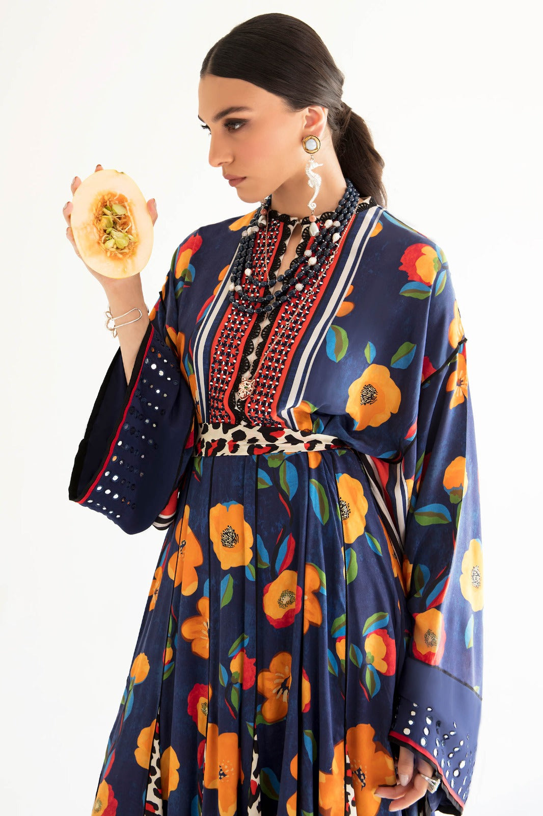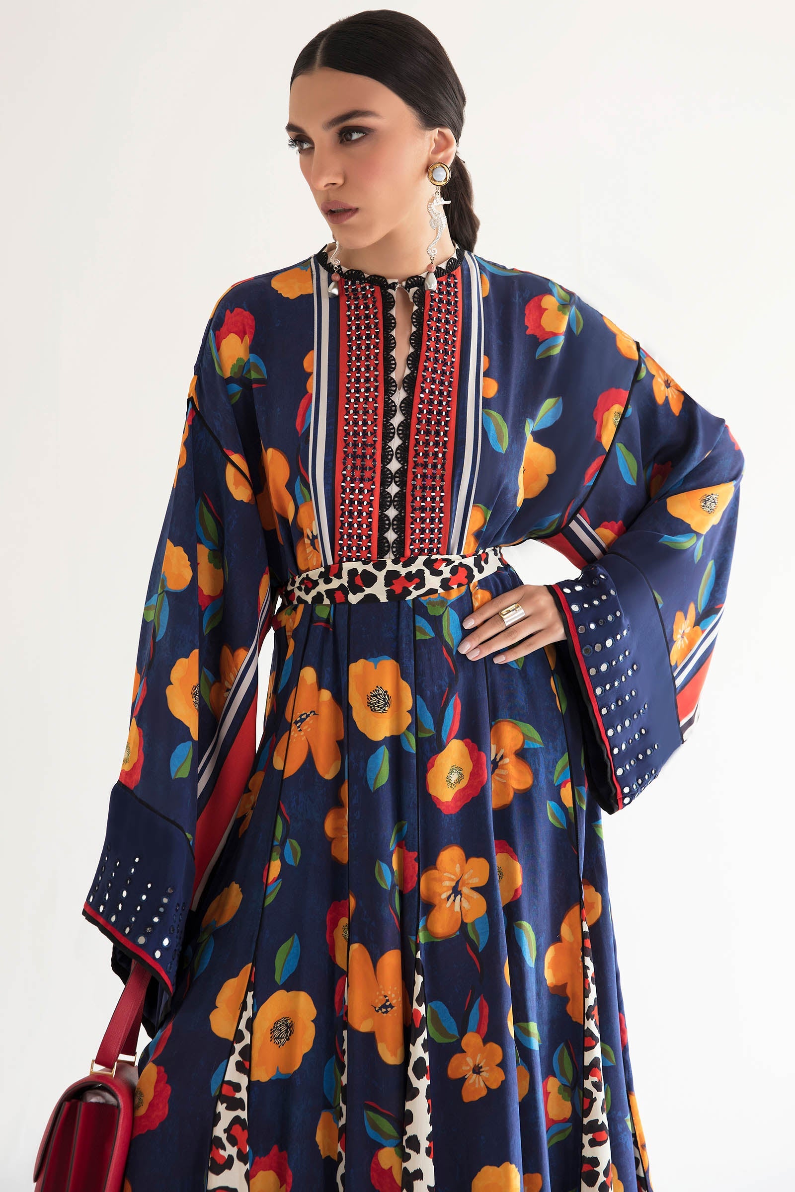 Glorious flora depicting shades of cyber yellow swirl with bright sage leaves make their mark as tinges of azure and scarlet add a colourful twist to the midnight blue, silk canvas of 'Lyna'. Accentuated with leopard print panels creating a peek a boo effect, and adorned with scintillating mirrors placed on the sleeves, this avant-garde design is sure to be a favorite this season!