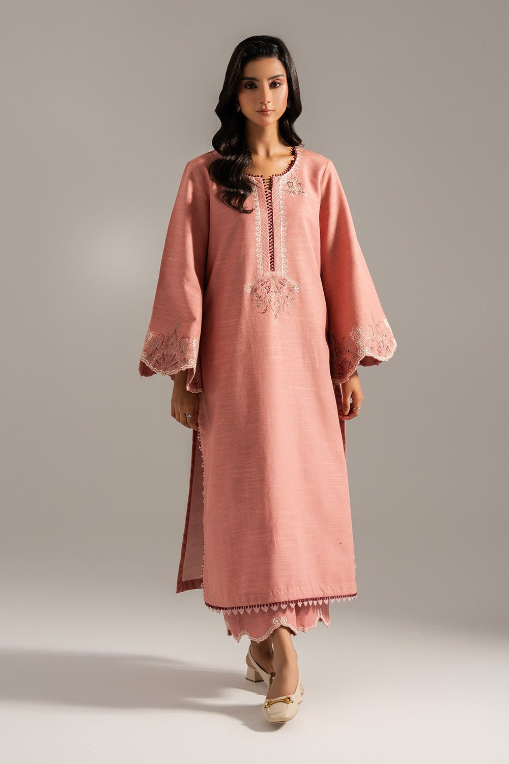 Embrace subtle sophistication in this powder pink 2-piece khaddar ensemble, featuring a lace-embellished round neckline with a front slit. The long shirt and scalloped straight trousers are adorned with delicate lace and embroidery, creating a look of refined elegance.