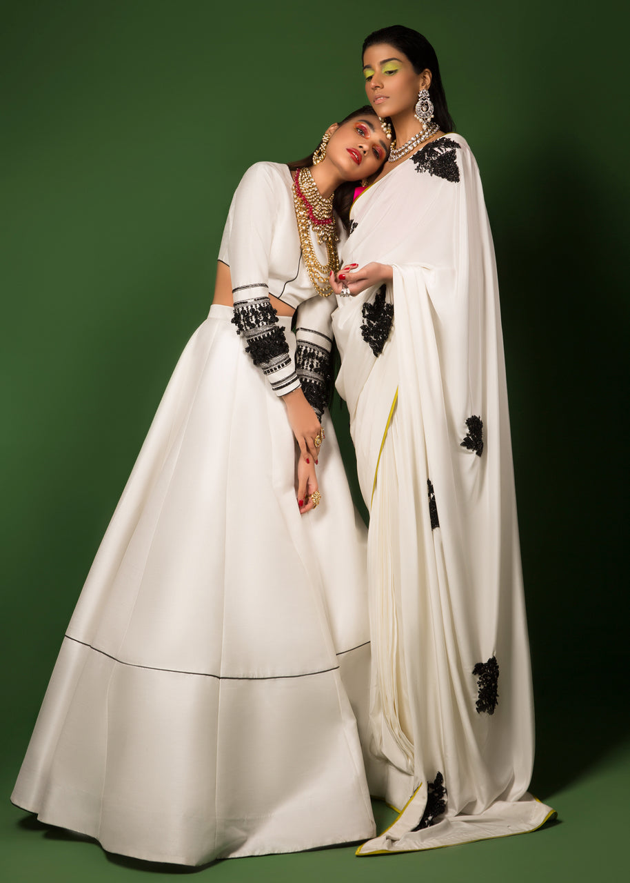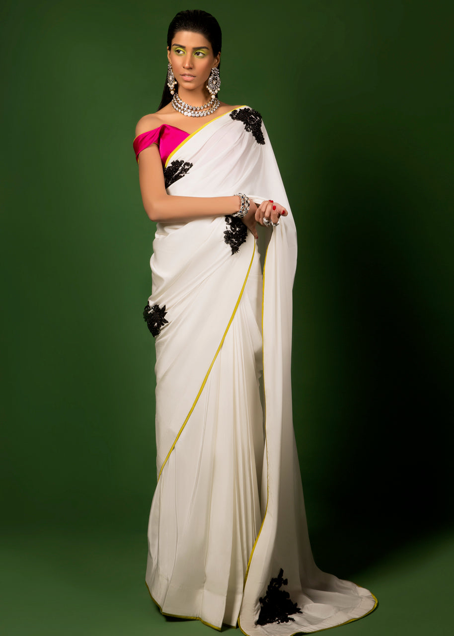 This white grip saree has large black floral motifs asymmetrically placed throughout the fabric length. The saree is finished with lime colored satin silk piping. The off shoulder v neck satin silk blouse is dyed in fuchsia pink.