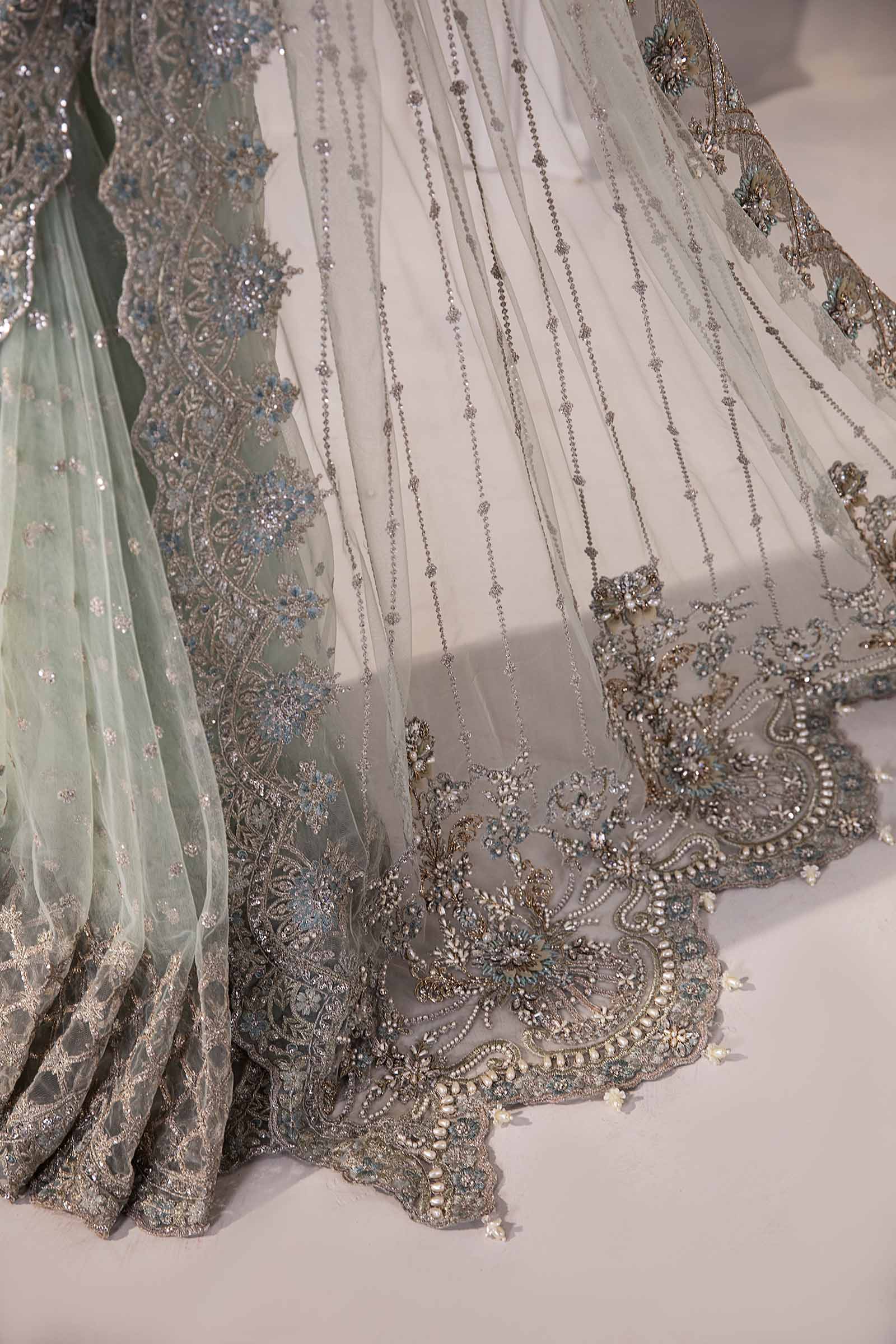 Mariella' is a whisper of elegance & sophistication. Enveloped with threads of gold & silver threads with exquisite 3D floral work, and adorned with shimmering sequin accents, stones & pearls that bespoke sophistication. It is complemented by enchanting cut dana embroidery & dabka naqshi detailing & designed in French patterns making it perfect for a nikah & walima look.