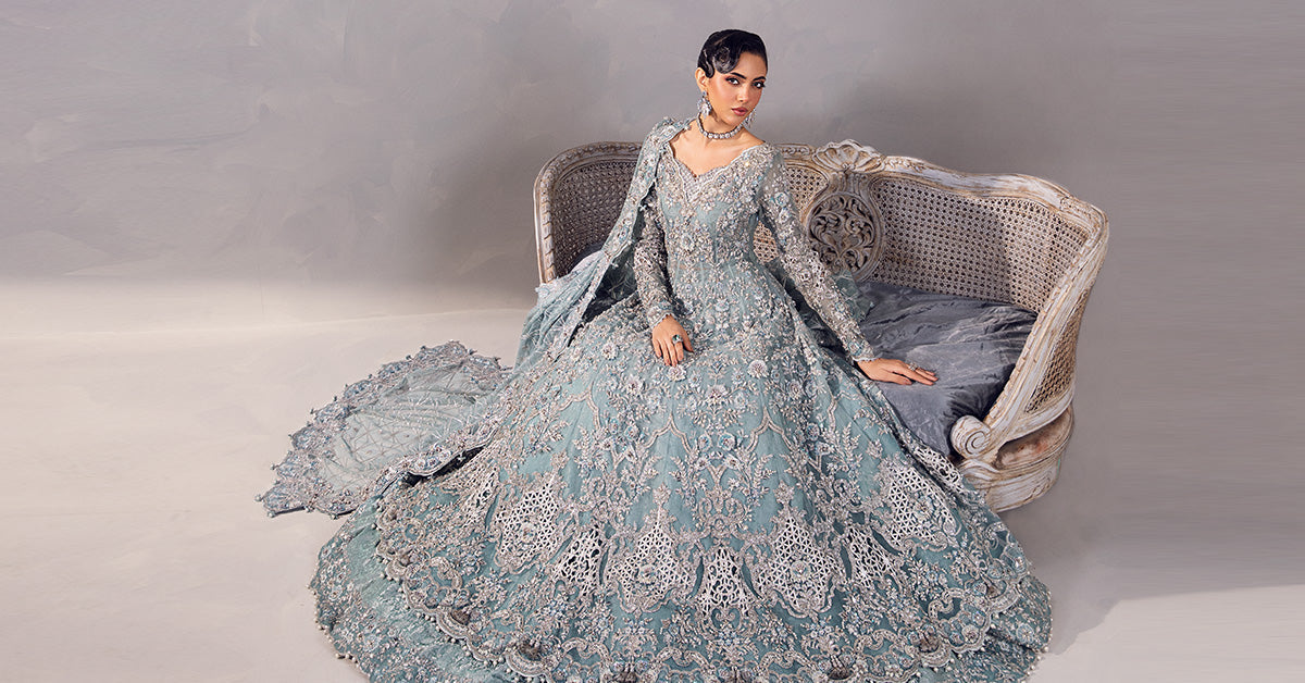 'Fayruz' is a poetic symphony of meticulous craftsmanship - Weaving timeless allure with ethereal 3D floral work from expressions of glistening stones, crystals, pearls & cut dana that embody a living poem of grace. Designed in French patterns, this masterpiece is perfect to grace nikah & walima look.