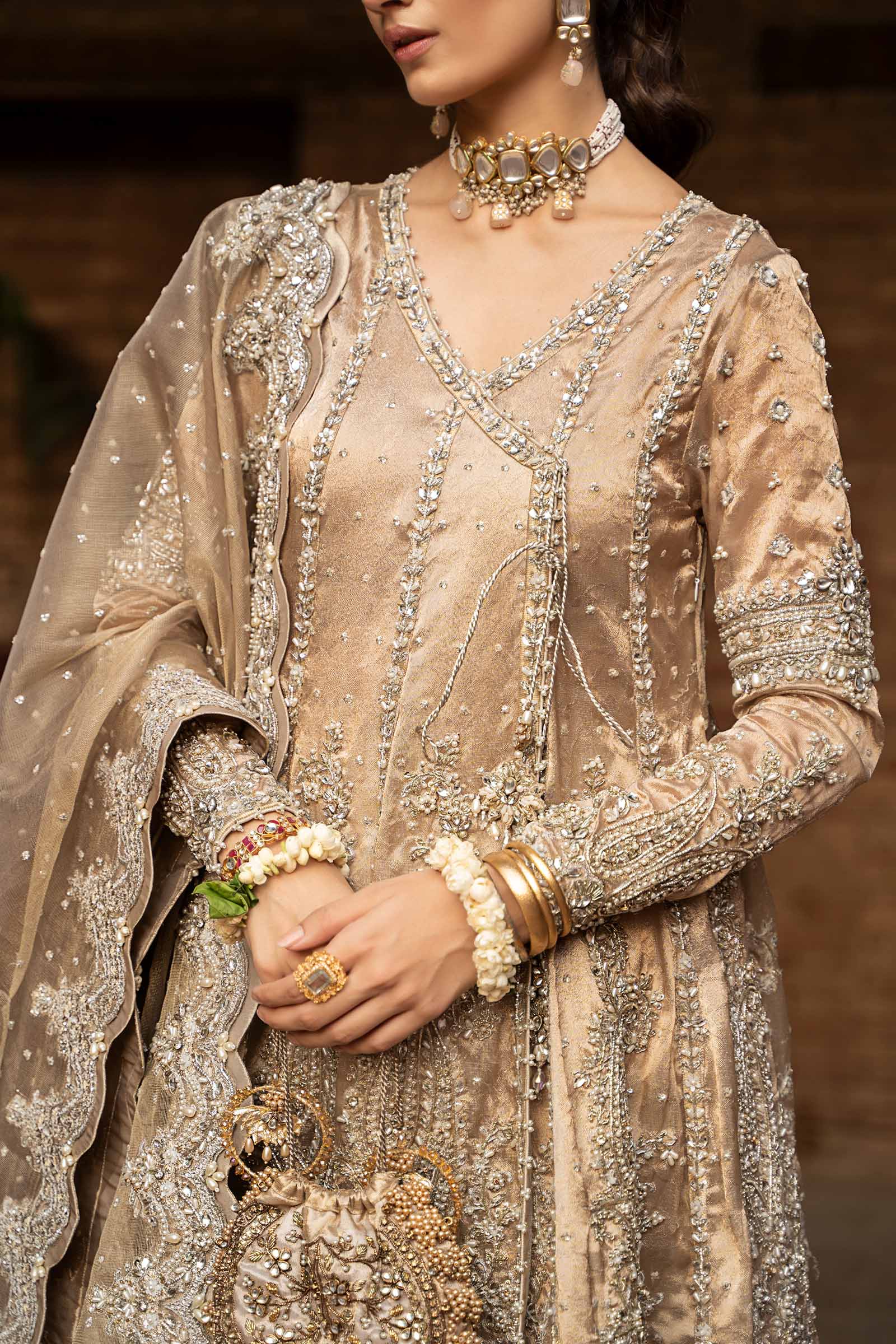 Oriana' short angrakha & gharara set - a masterpiece draped in an ethereal gold palette. It features an unrivaled artistry of dabka & naqshi meticulously crafted with kundan adorned with dazzling lustrous sequins, delicate pearls & luminous milky stones. it crowning glory is the beautiful hand embellished tassels, bordered with mesmerizing detailing. Adding an air of celestial sophistication, the crushed gharara is a celebration to timeless elegance, merging medival tradition with modern elegance that effortlessly compliment your shendi, baraat & nikah look.