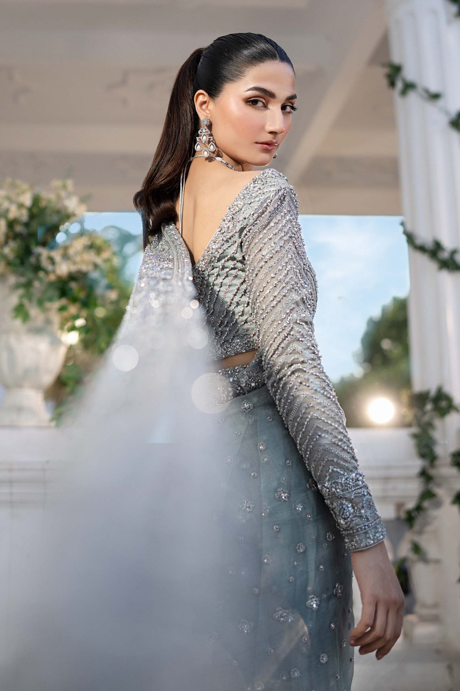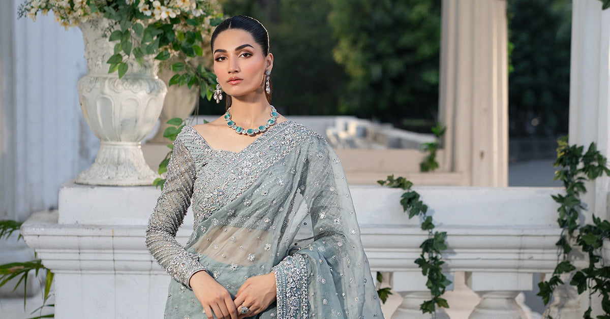The Weaver's Dream. Opulent 3D florals, glittering sitara, and bespoke crystal work meet the regal shimmer of gotta embroidery. A true couture Saree Set, defined by the subtle gradient of ombre pearls.