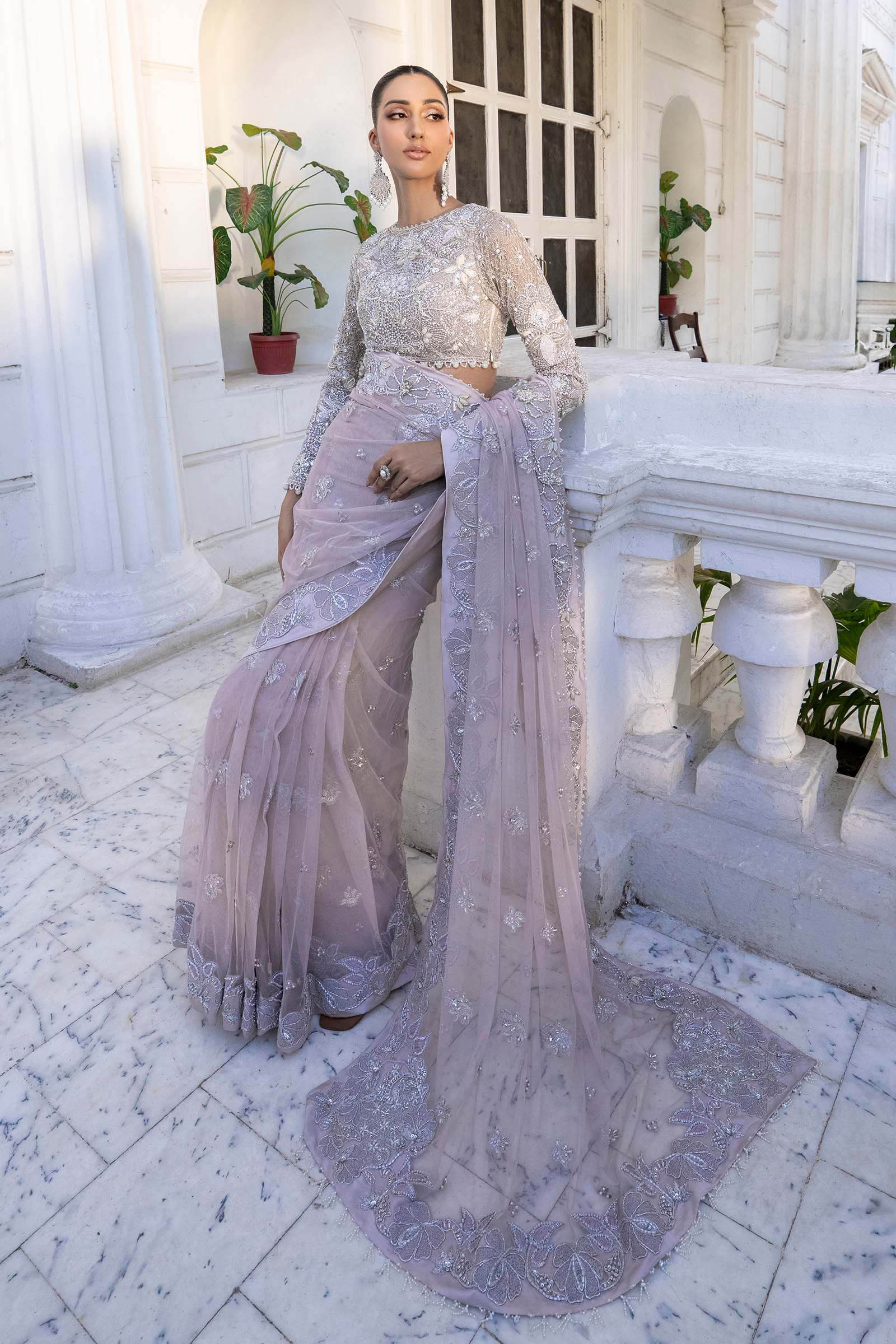 Lilac Garden Dream. This ethereal lilac saree blooms with bold, enchanting floral patterns. The intricate craftsmanship featuring scrolls, diamantes, bethki, and pearls is elevated by traditional dori and gotta work. An opulent masterpiece that's pure magic.