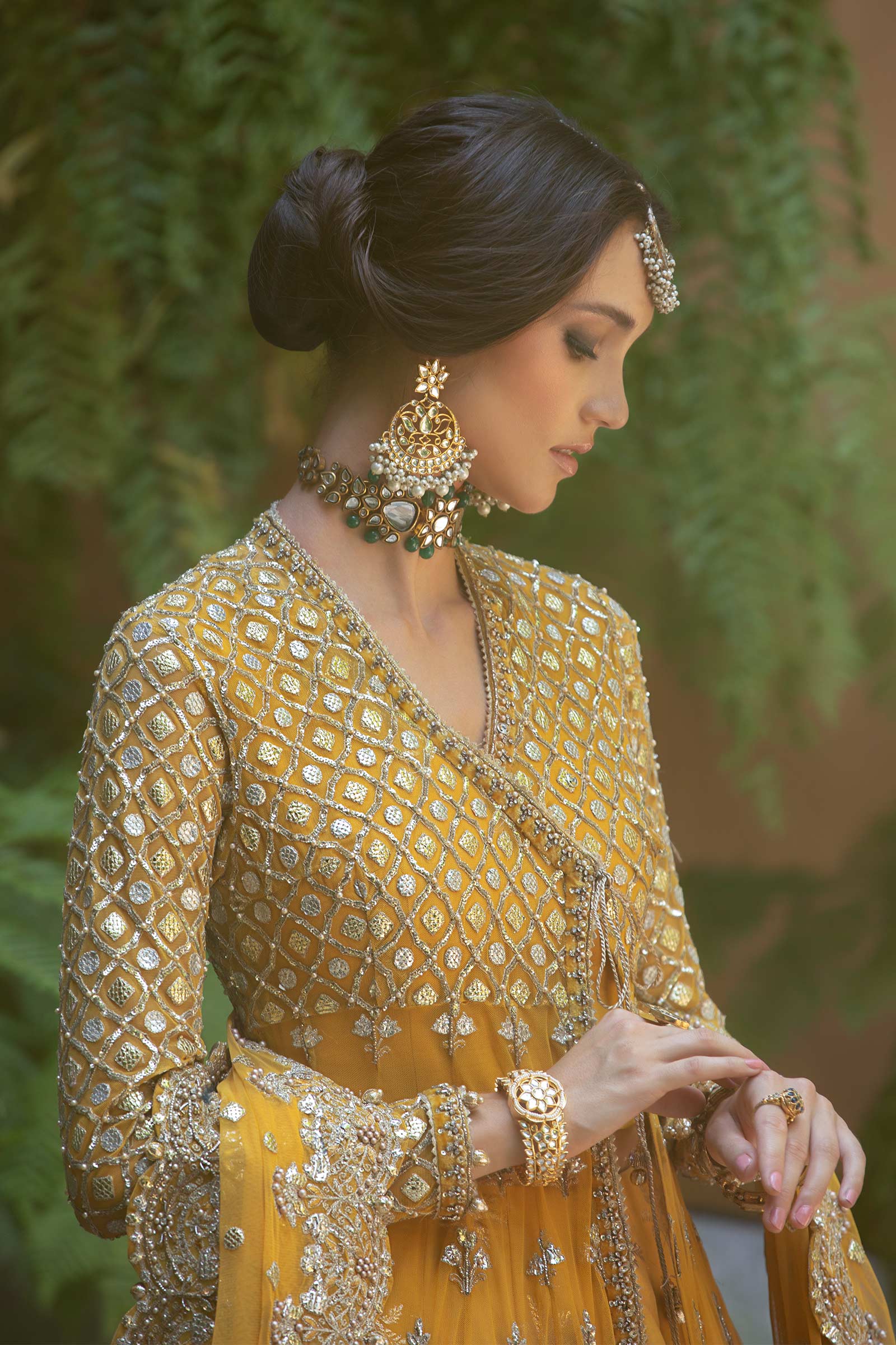 Our ‘NURA’ features a luxurious yellow palette angrakha lehnga set with intricately detailed motifs inspired by the blooming forests and Mughal artistry adorned with our signature craft of gotta, panni, lappa, suchi and kiran all over, so you could sparkle during your festivities.
