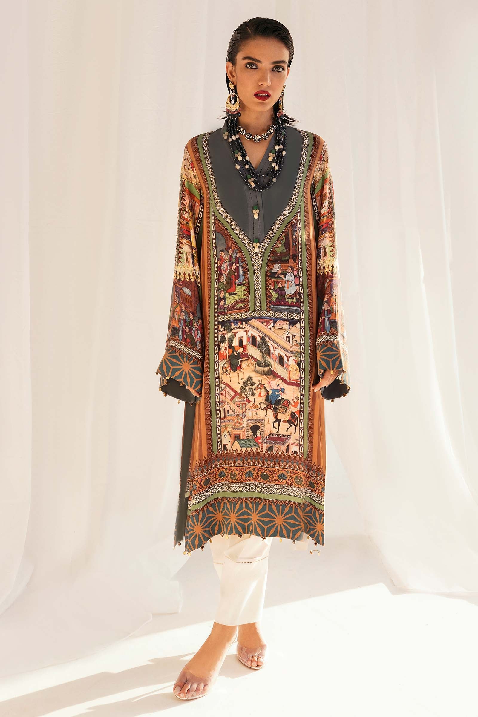 ‘Milica’ is a classic silk tunic featuring a relaxed, flowing silhouette showcasing an enchanting Mughal print. The captivating art work on the plush silk coffee toned canvas is an instant style statement suitable for day and night wear!