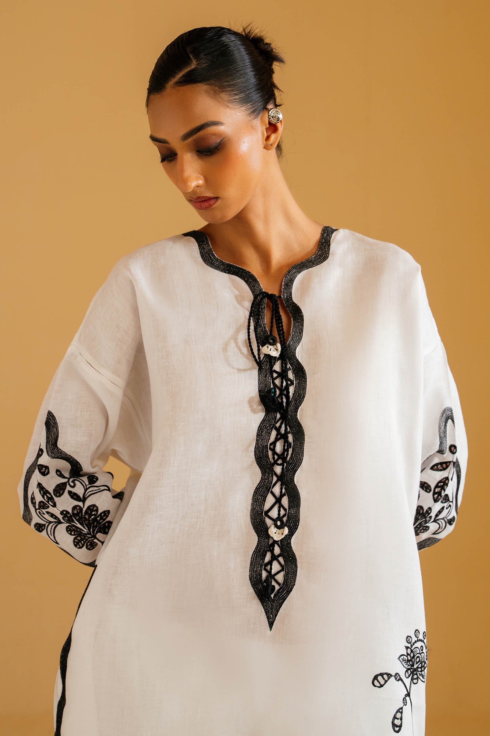 The relaxed silhouette flows in airy, breathable fabric, designed to move with ease and intention. Paired with tonal trousers embroidered with understated motifs, Narmeen becomes a portrait of composed elegance.