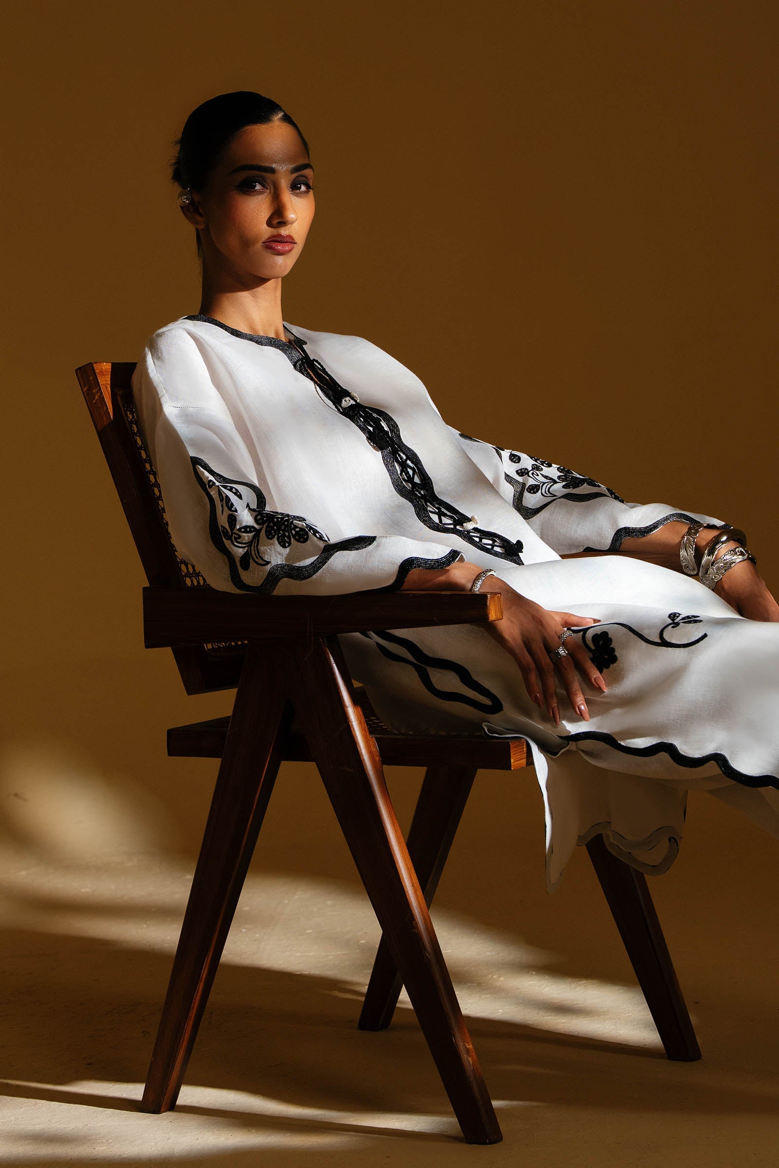 Draped in soft dove white and traced with obsidian floral vines, Narmeen captures the gentle quiet of early mornings and the grace of unspoken moments.