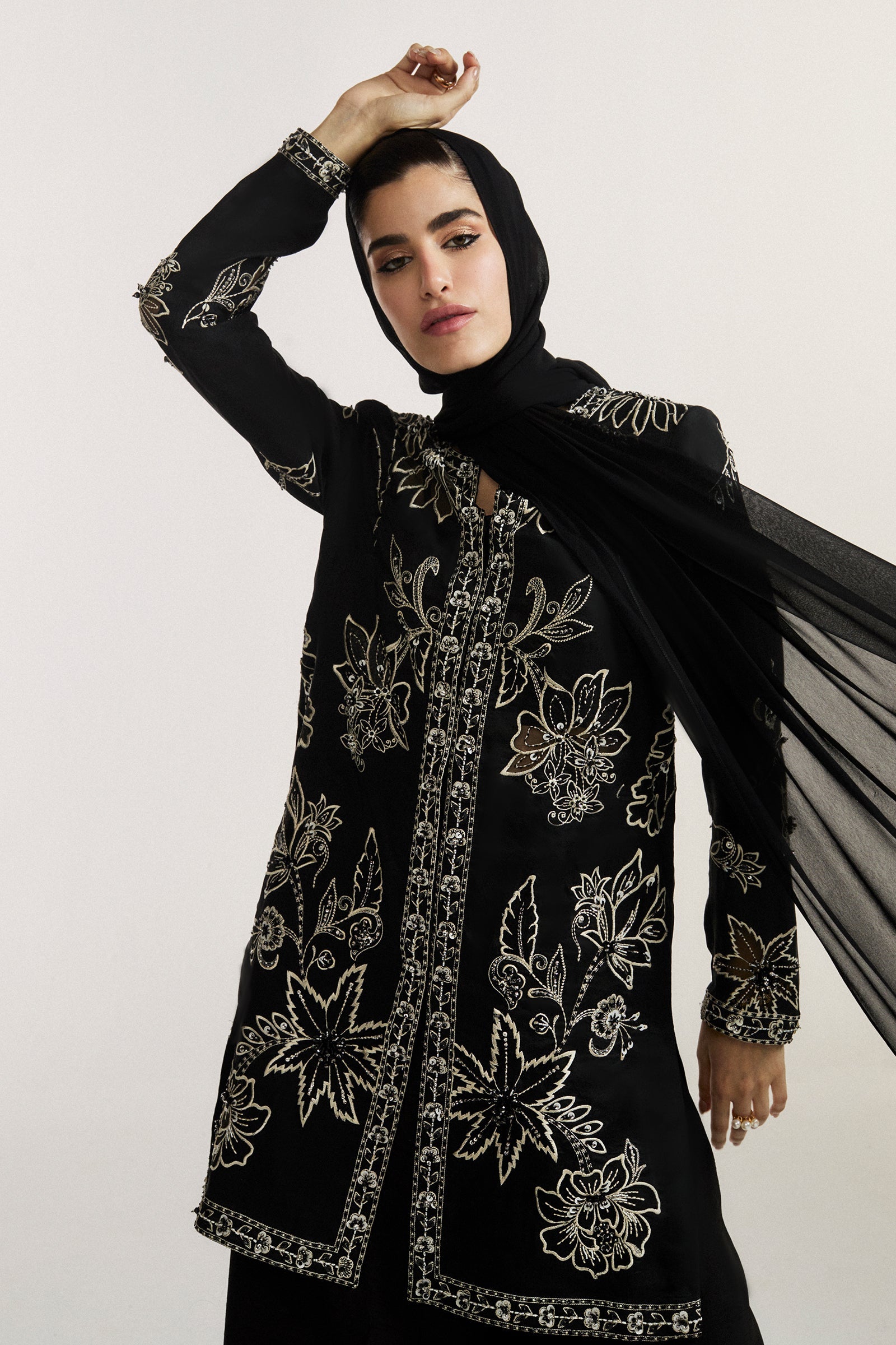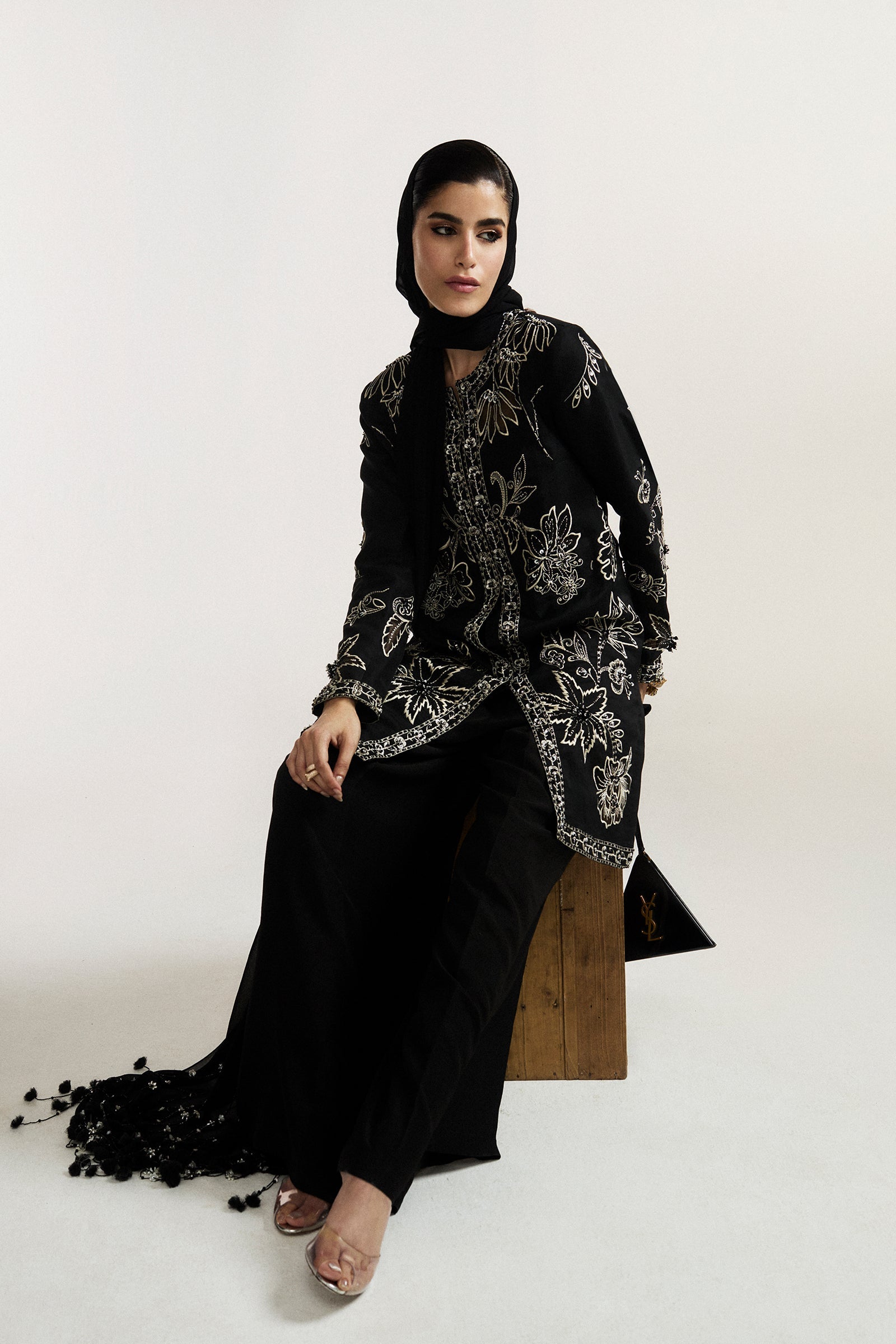 Enveloped in the mystique of midnight, Nocturne Élitaire is an ode to celestial grandeur and exquisite craftsmanship. Draped in lustrous raw silk, the impeccably tailored jacket is lavishly adorned with shimmering crystals, opulent embellishments, and delicately placed floral motifs, exuding an ethereal luminosity against the deep onyx canvas. Paired with sumptuously structured wide-leg trousers, the ensemble strikes a perfect balance between regal poise and modern allure. A gossamer neck scarf, adorned with cascading tassels, lends a whisper of romantic decadence, completing this vision of nocturnal sophistication.
