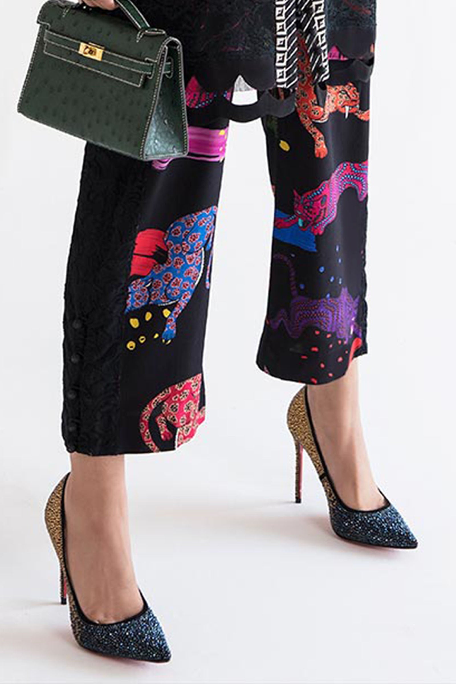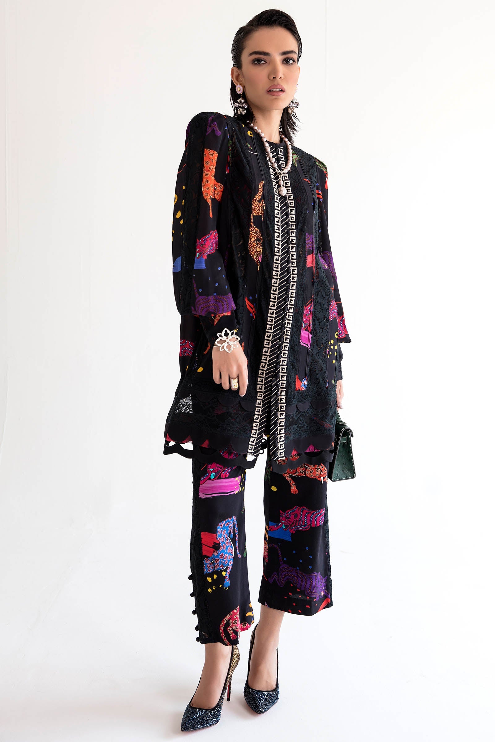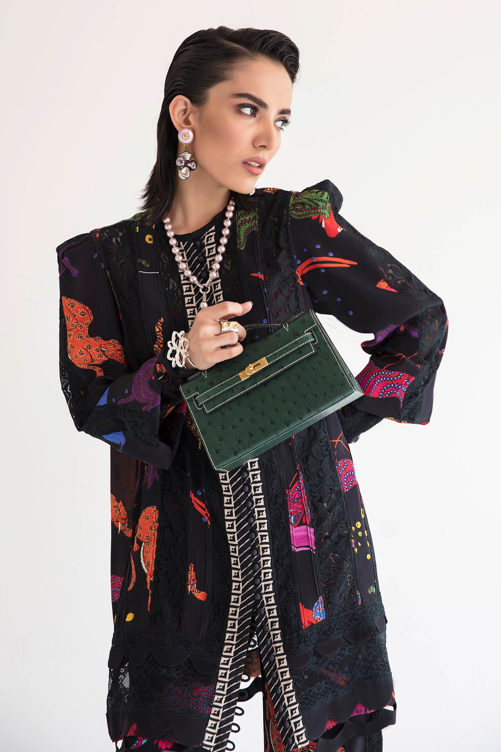 Take flight into style with 'Oriane', featuring a striking black base elegantly illustrated with vividly illustrated wild fauna. The vibrant hues of magenta, tangerine, scarlet, azure, and green bring the design to life, making it a feast for the eyes. The varrying shades of each wild character are painted beautifully, while the delicate obsidian lace insets bring lend the design a sense of playful whimsy. The obsidian canvas serves as the perfect backdrop, highlighting the bright colors and the front open style with a tessellated border adds an element of sophistication. Paired with printed pants,'Oriane' is sure to make a bold and beautiful statement whether it’s an evening soirée or an Al fresco affair.