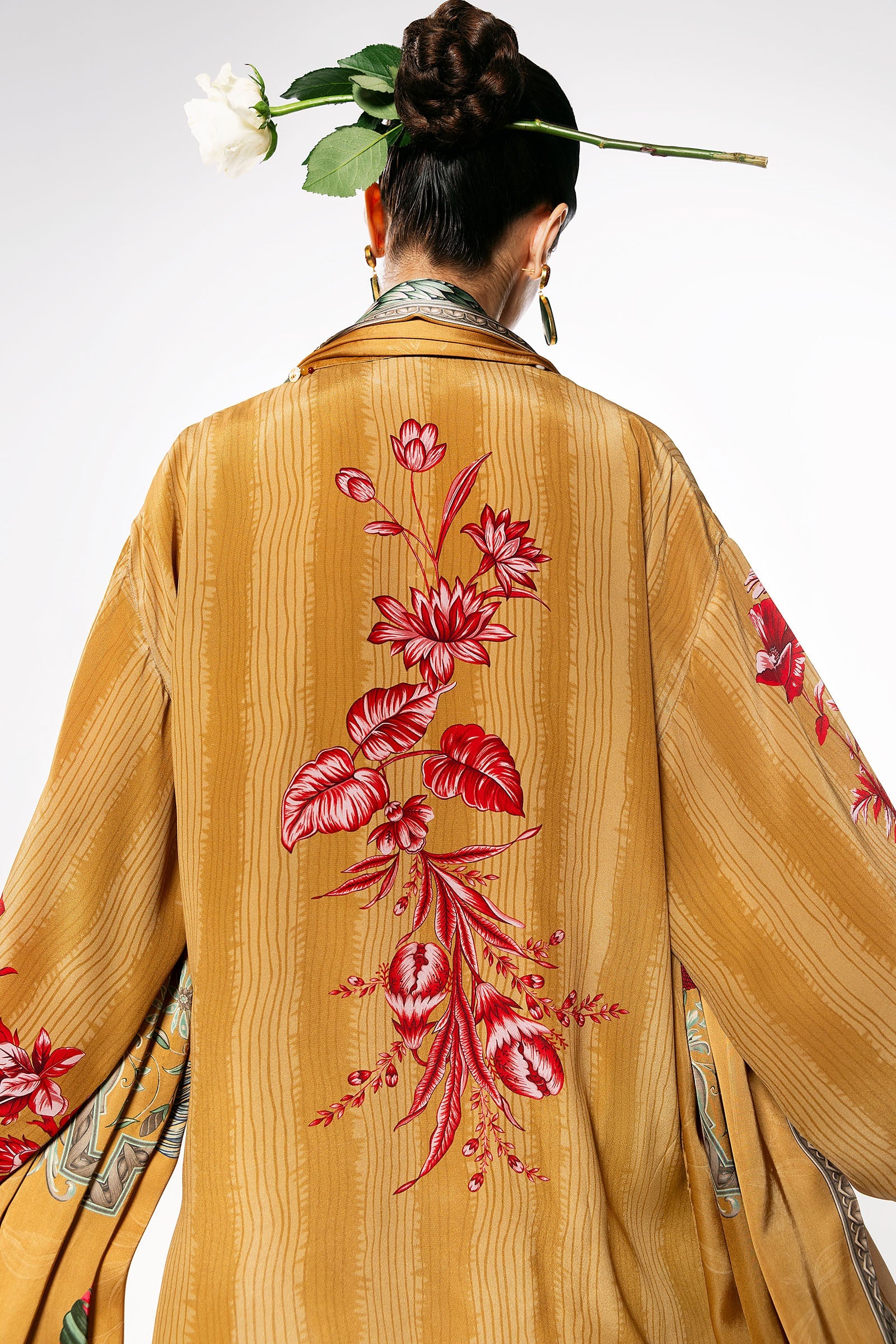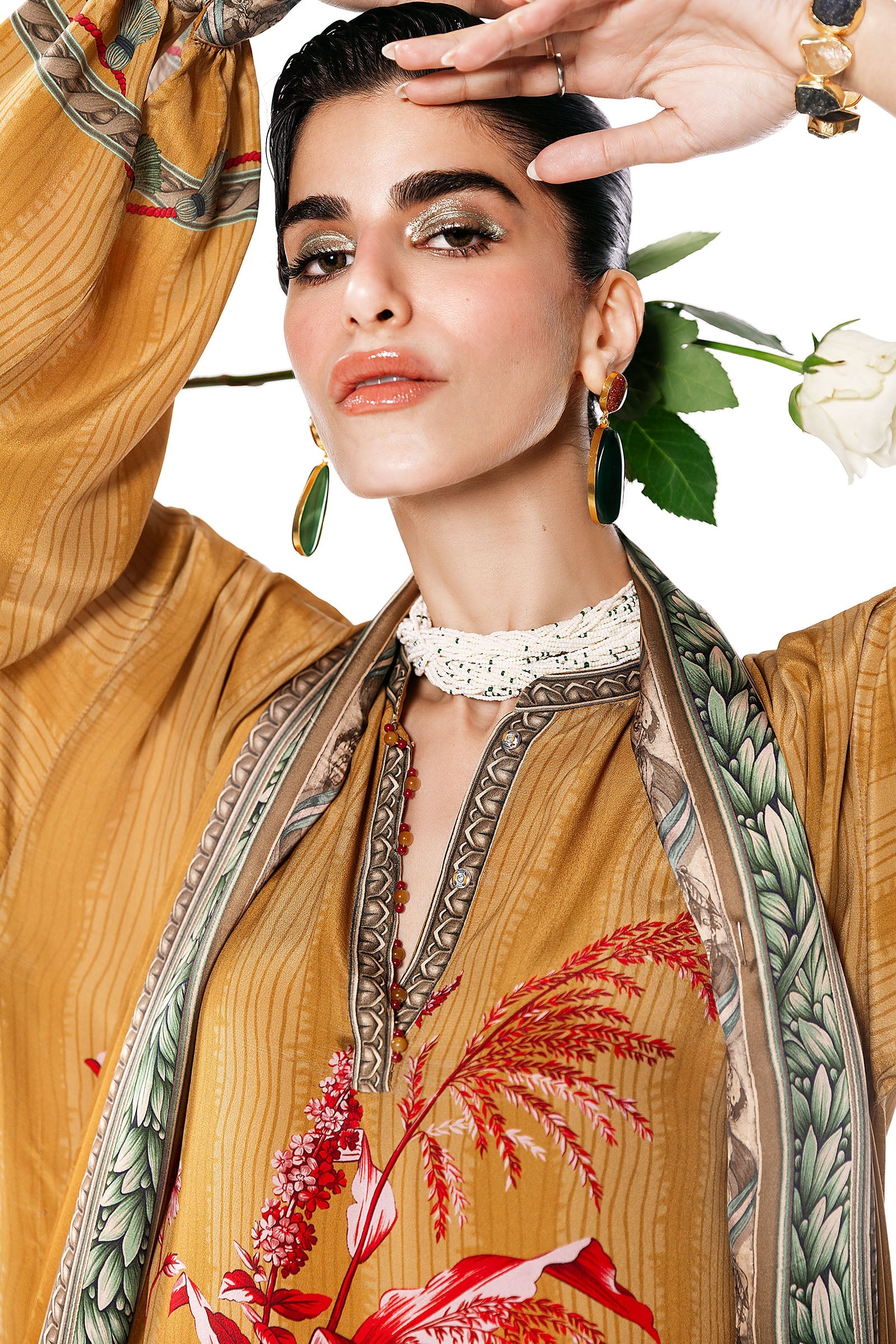 Introducing Oriane — a celebration of cultivated elegance and timeless allure, envisioned for the woman who dresses not to impress, but to enchant. Cloaked in a lustrous ochre canvas, this masterpiece comes alive with a hypnotic interplay of untamed florals and tessellated motifs in opulent crimson tones. A nod to vintage glamour, it is exquisitely accompanied by a pure silk dupatta — a rich, spice-infused composition that evokes far-flung grandeur.