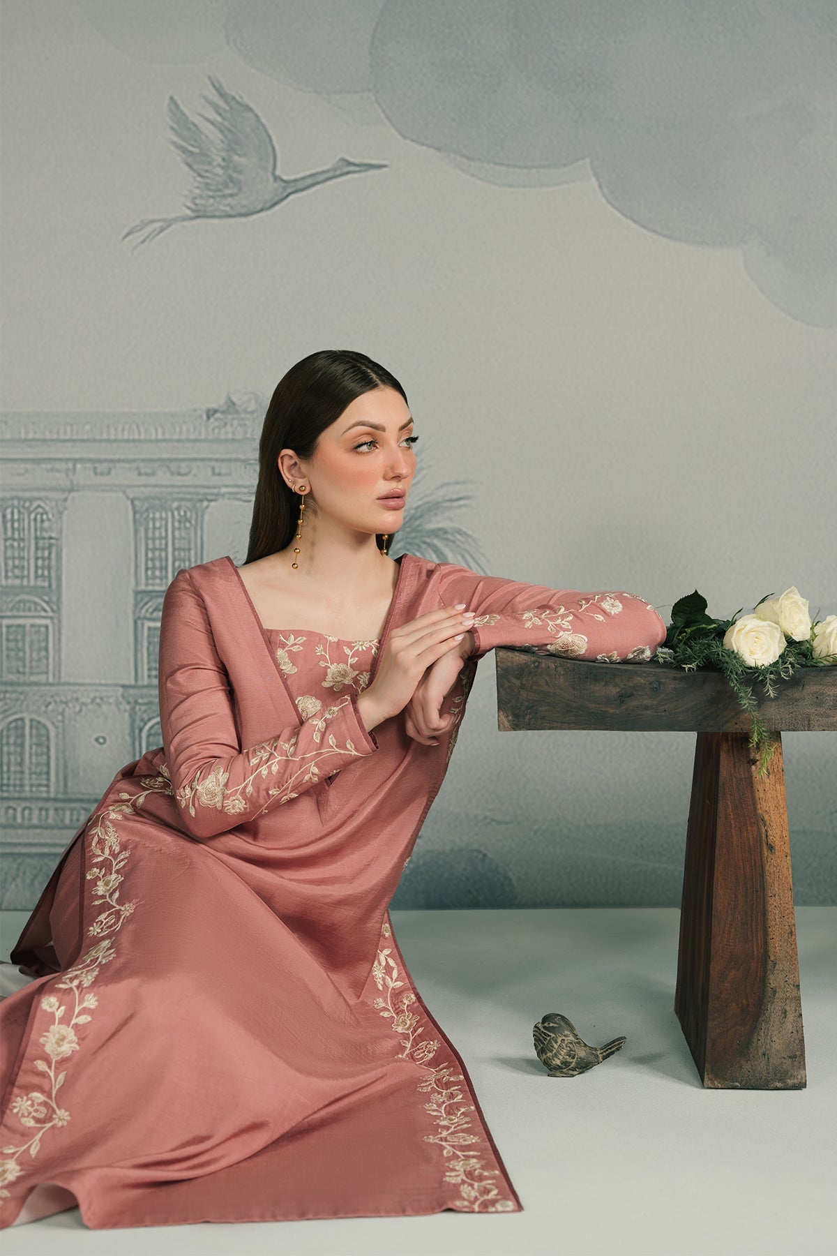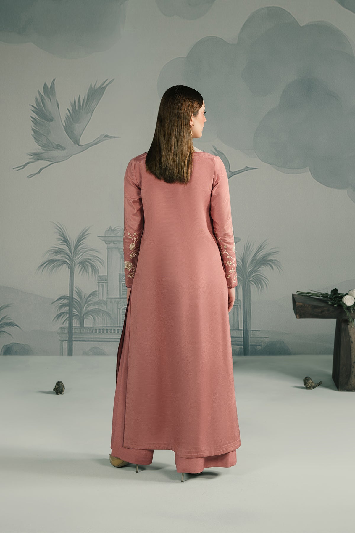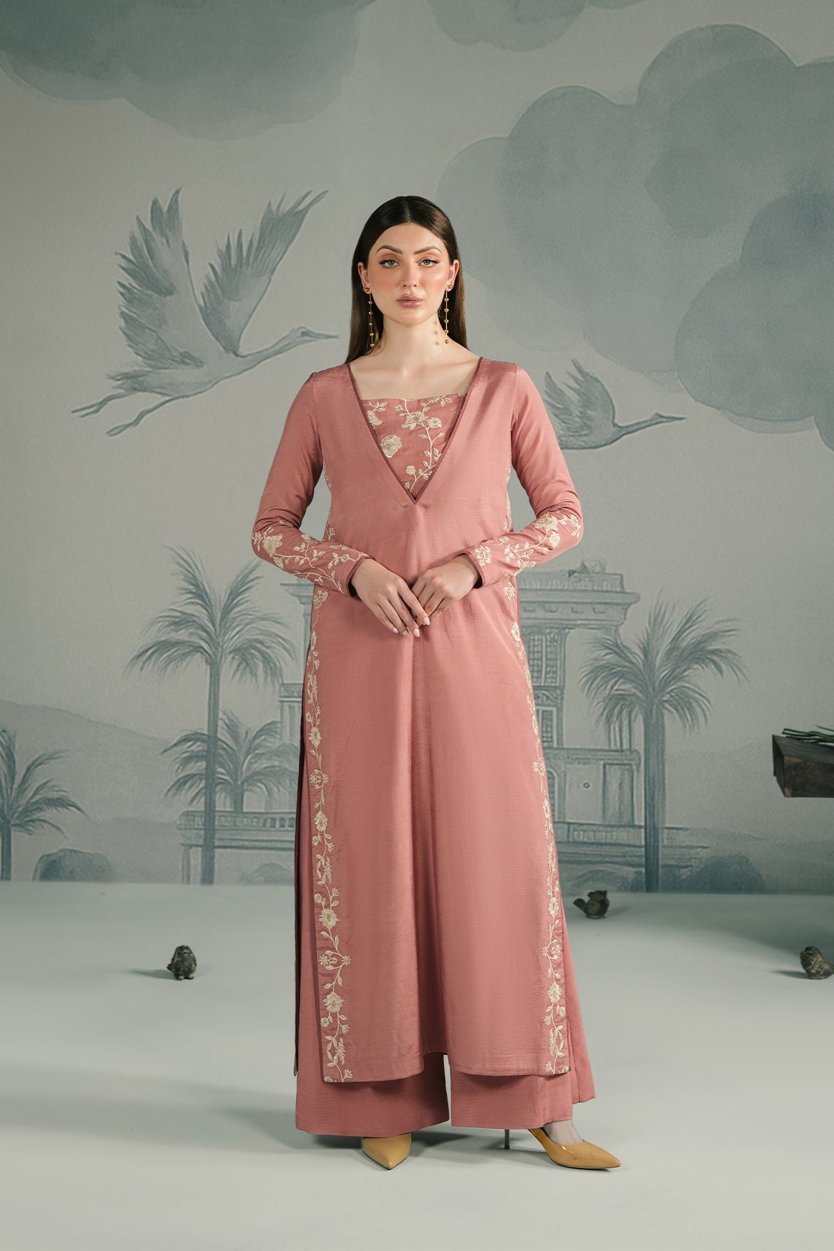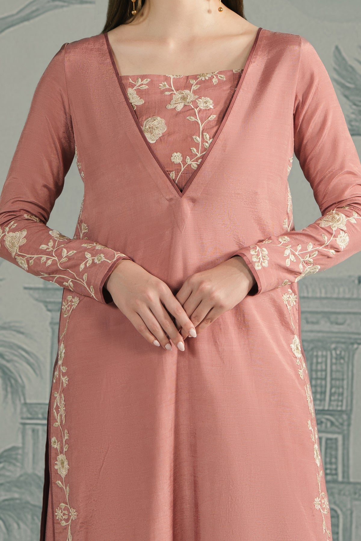 A blush raw silk long shirt, featuring a deep neckline with an embroidered inset bodice, delicately framed with ivory floral threadwork running along the panels and sleeves. Paired with wide-legged trouser in matching silk, the ensemble is completed with soft, flowing layers that balance structure with fluidity.