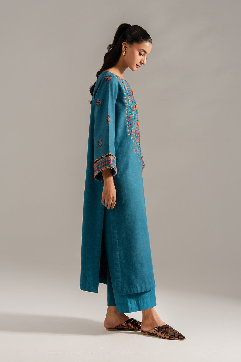 Exude refined elegance in this teal 2-piece khaddar ensemble, featuring an embroidered boat neckline with a front slit. The long shirt with intricately detailed sleeves and straight trousers offers a perfect blend of sophistication and comfort.