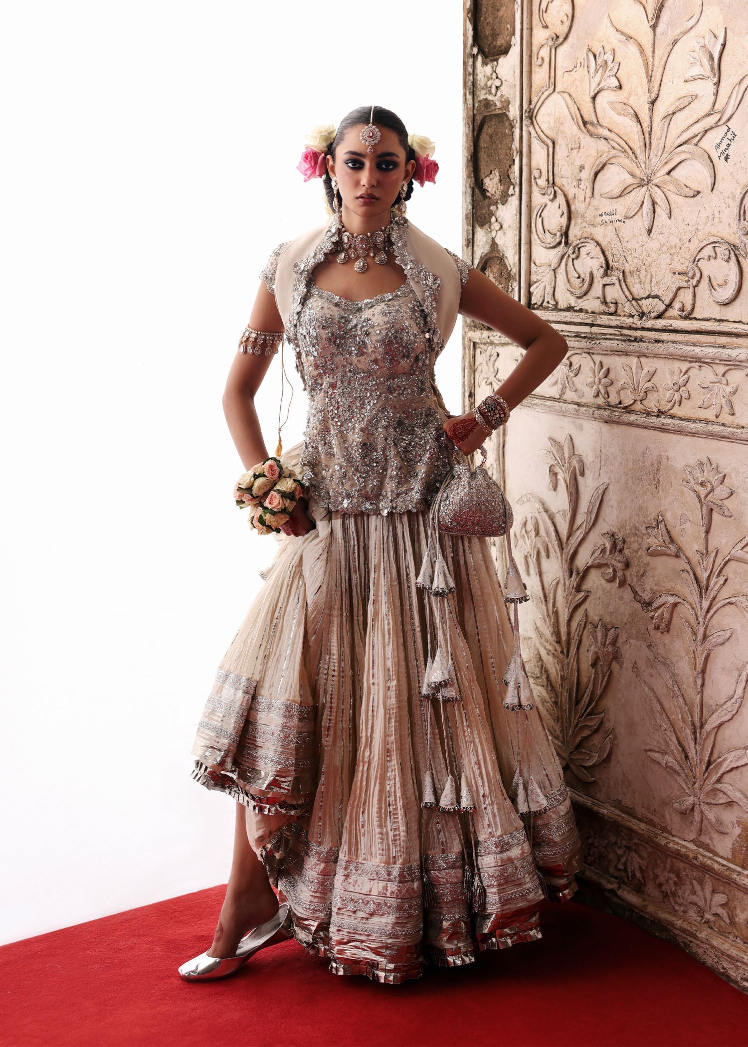 This statement piece features intricate design details, heavily embellished and luxurious fabric base known as chanderi. This glamorous and bold look is ideal for evening events. A body-fitted long choli is an elegant and trendy twist on the traditional lehenga-choli. It hugs the upper body like a blouse but extends down to the small hip line, preserving ethnic charm. There is radiance woven into every stitch. Soft scallops trail along the hem of the organza dupatta like waves, adding a playful charm and fluidity to the ensemble. Its lehenga is in crushed chanderi fabric, which adds depth and drama in texture. The extended border along the hemline adds structure and enhances the overall aesthetic of the outfit. The outfit is perfect for evening events, exuding glamour and boldness.