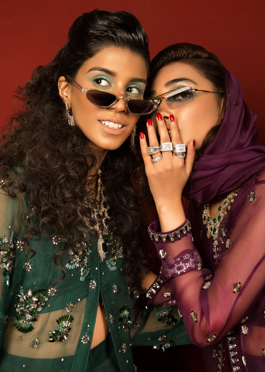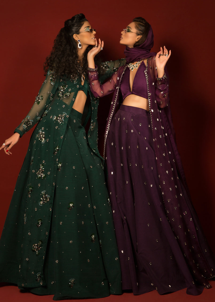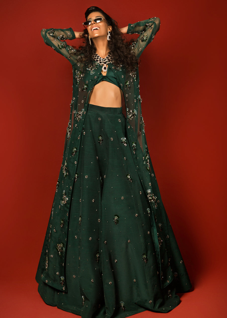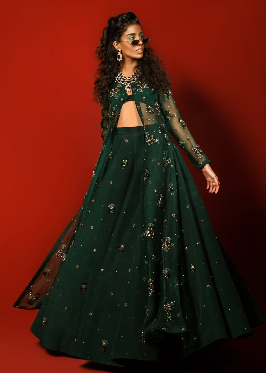 The floor length green organza gown is front open with full sleeves. A spray of floral embellishment travels across the entire gown. The gown has an embellished spray along with the floral motifs. The slip is made from dyed satin silk. The skirt is made in raw silk with a spray of the same floral embellishments as done on the gown. The green organza dupatta also has a spray of light embellishments.