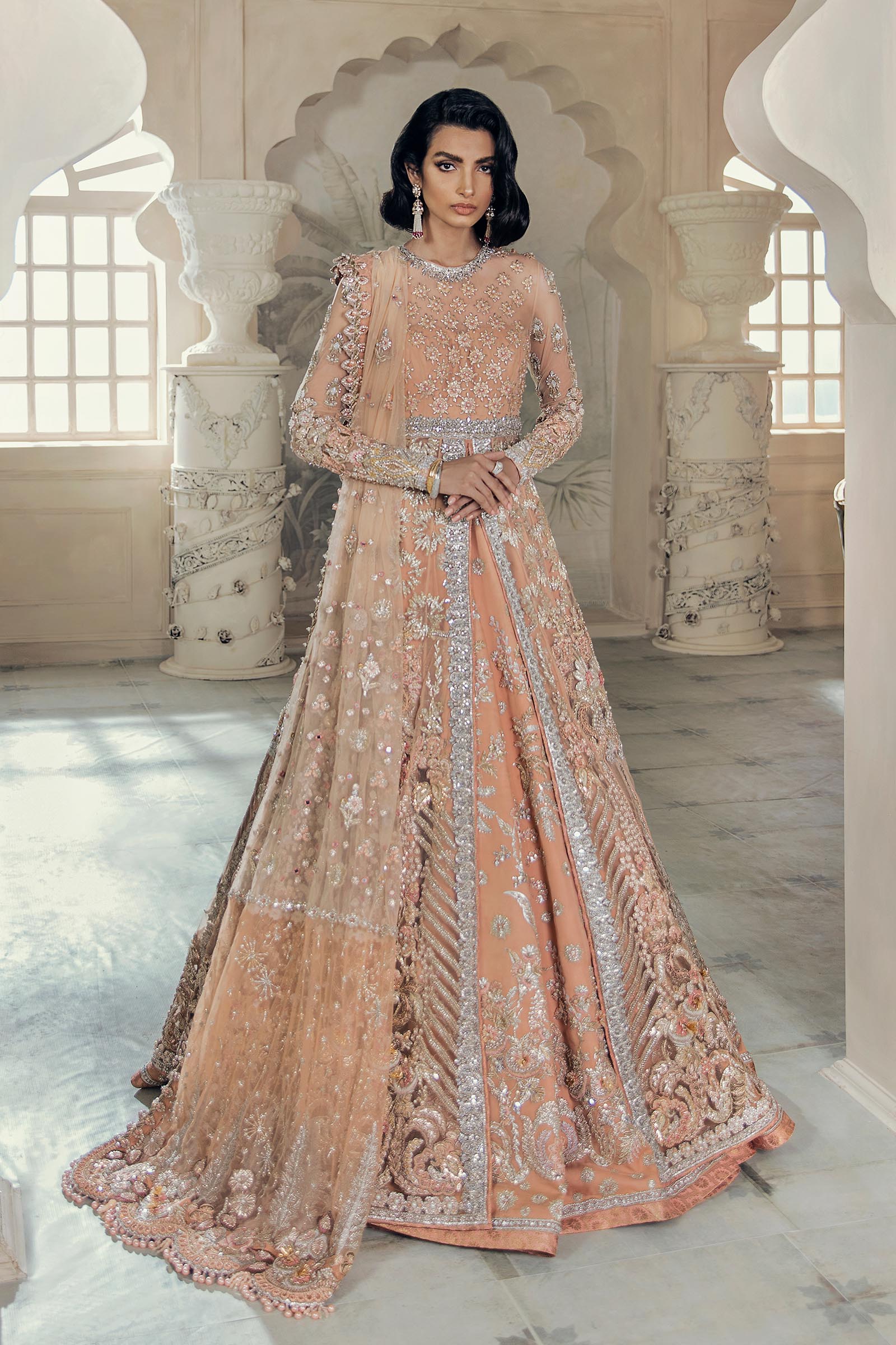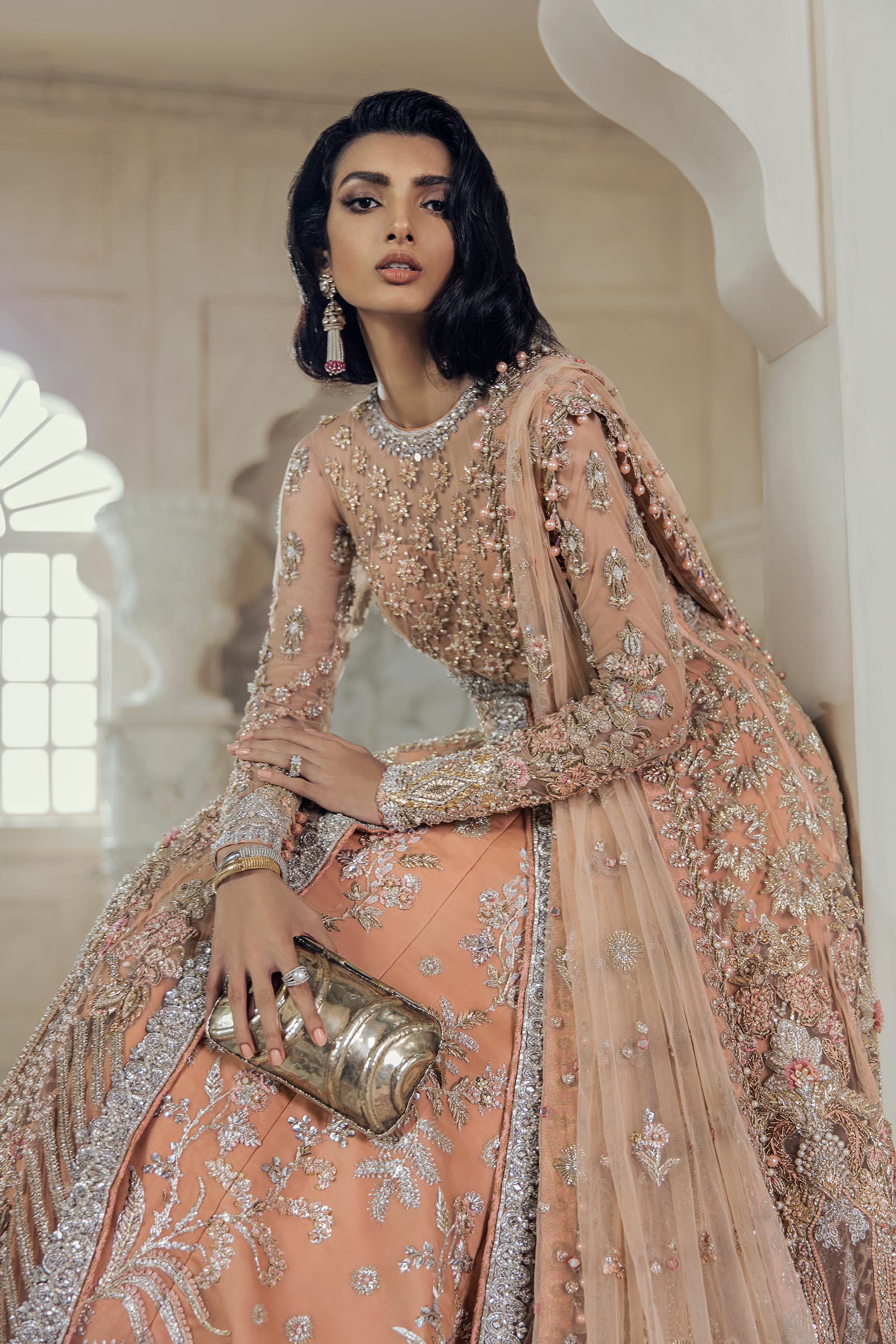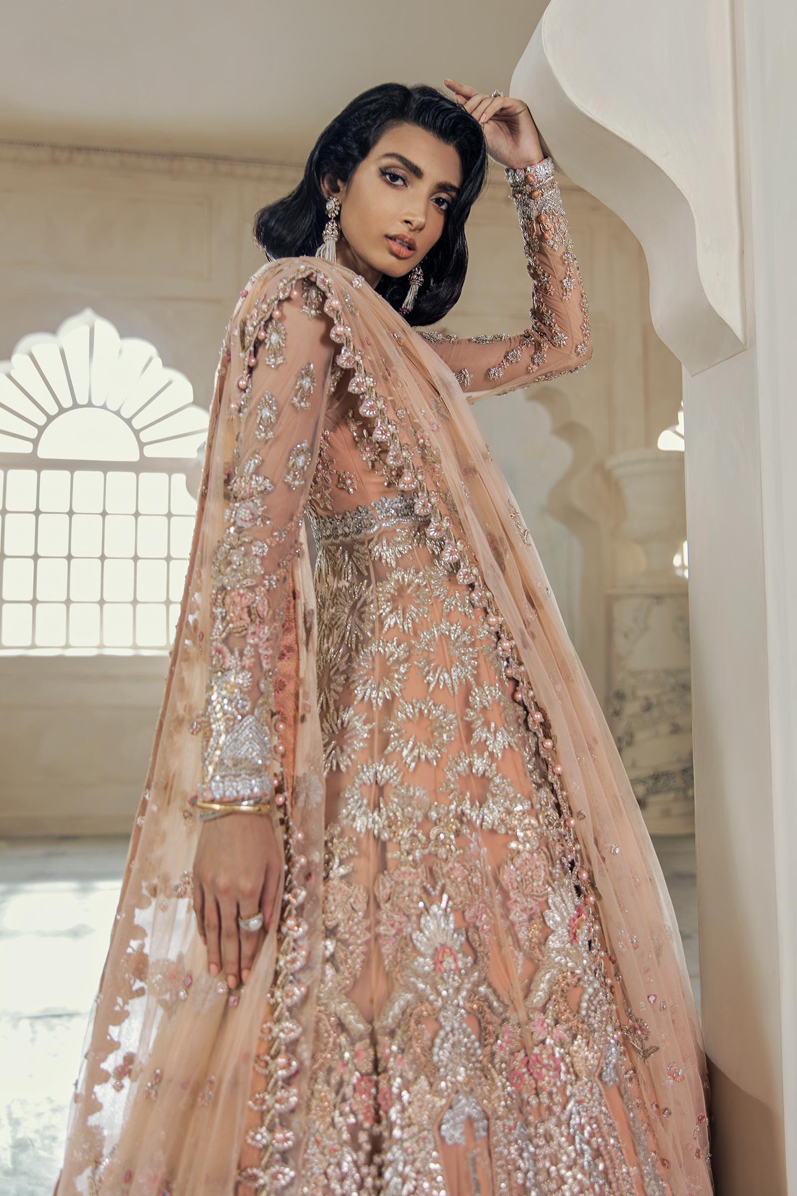 Dainty hand embellishments, soft feminine colors and the perfect blend of traditional craft and modern sensibility are the hallmarks of our bridal couture. You are requested to consult with one of our designers via WhatsApp link provided to assist you regarding complete details for your outfit's composition and care.
