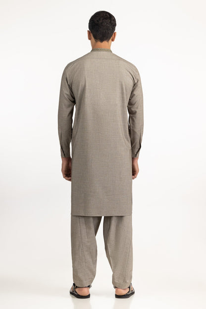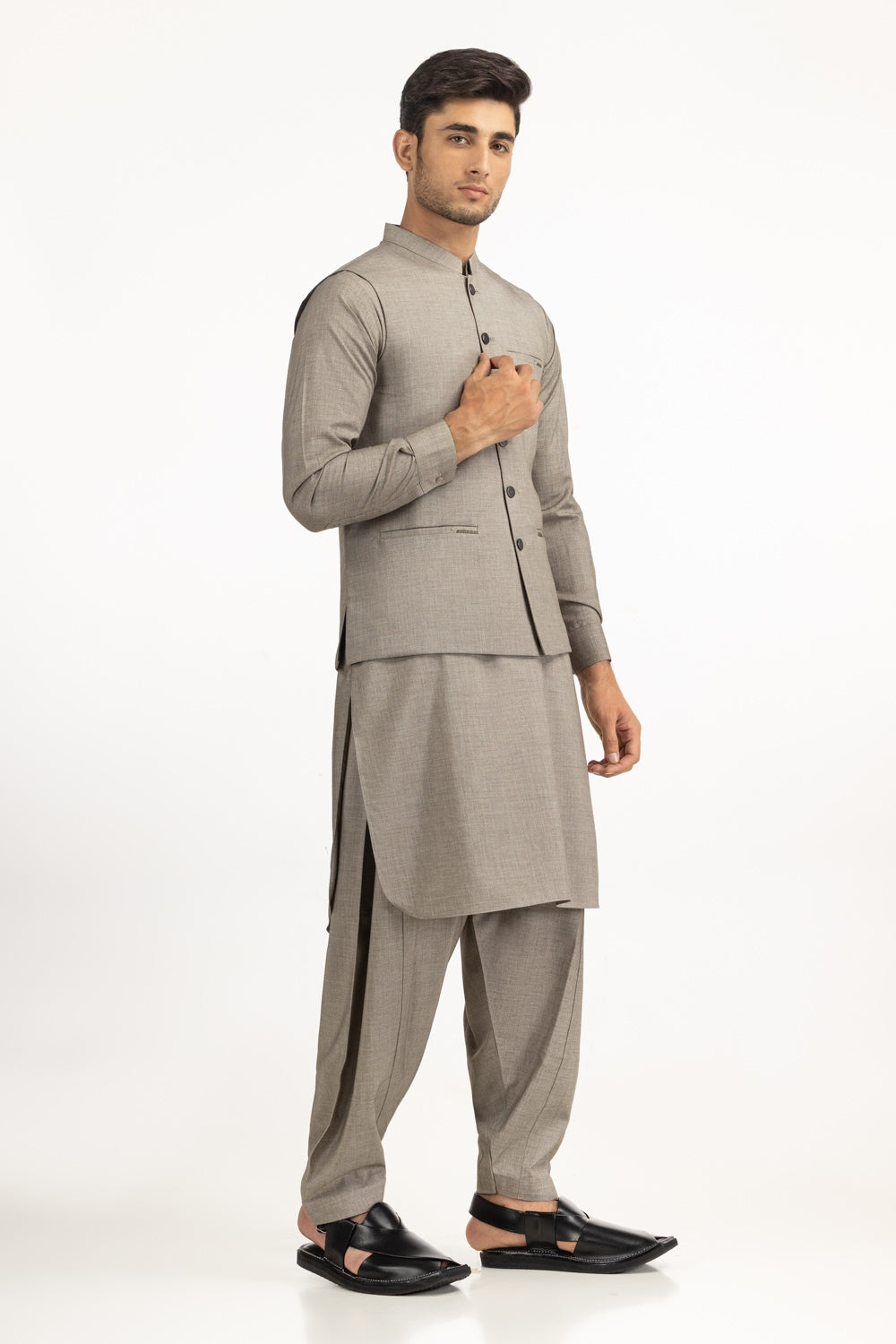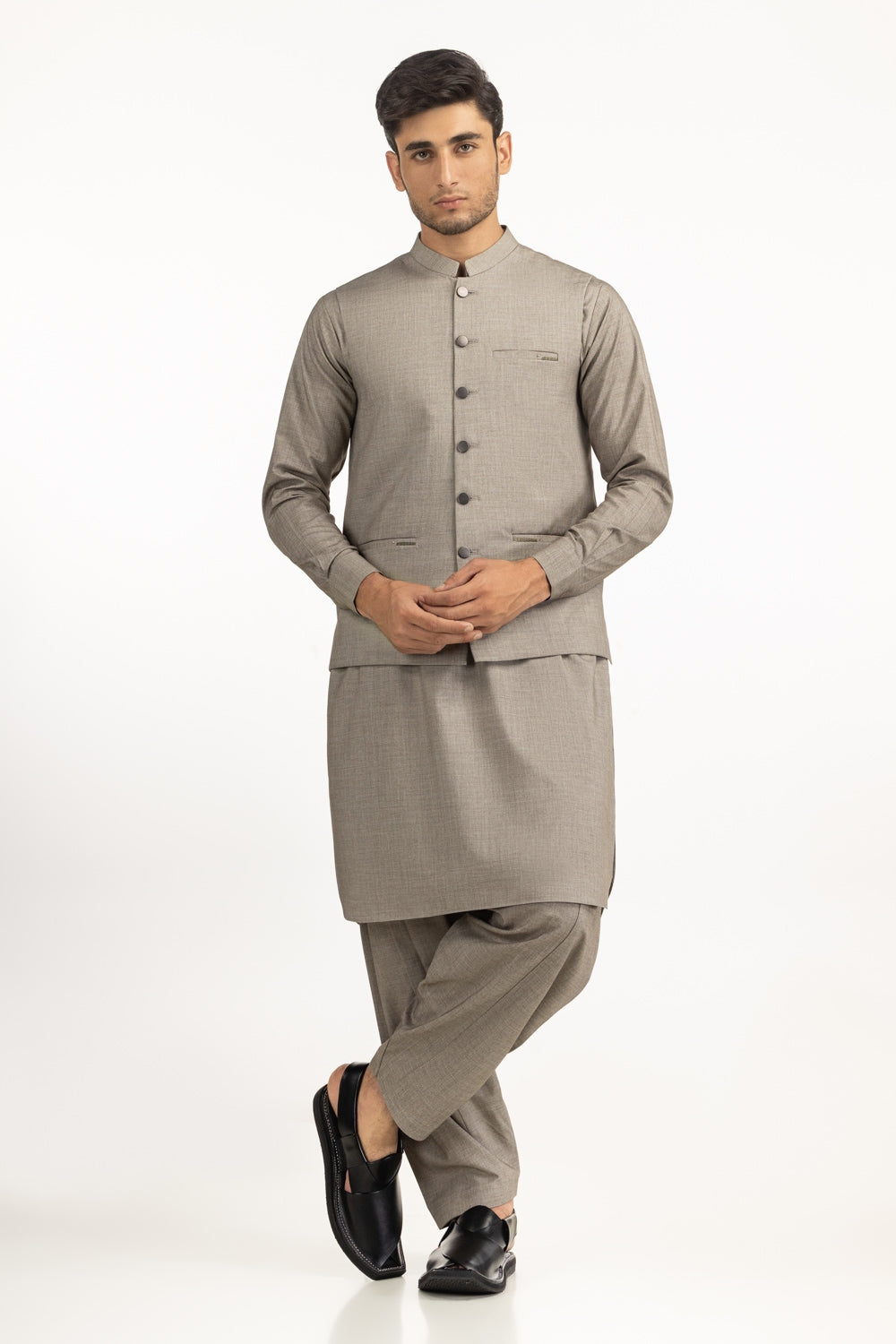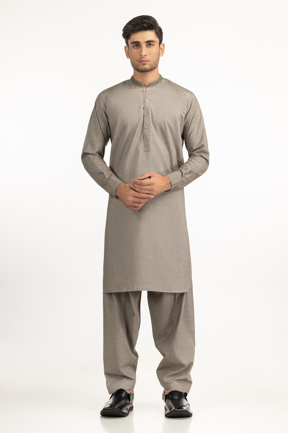 Crafted with simplicity and elegance, this three-piece Blended Fabric Formal Kameez Shalwar, paired with a waistcoat, exudes sophistication. The design features a beautiful embroidered Sherwani collar, straight hem, and cuffs on the kameez, complemented by a shalwar and delicately designed waistcoat with a hint of embroidery on Velt. This timeless garment effortlessly blends traditional aesthetics with modern sensibilities, creating a versatile and refined look