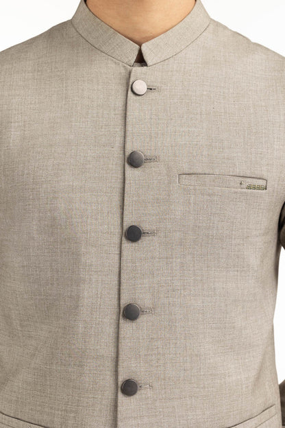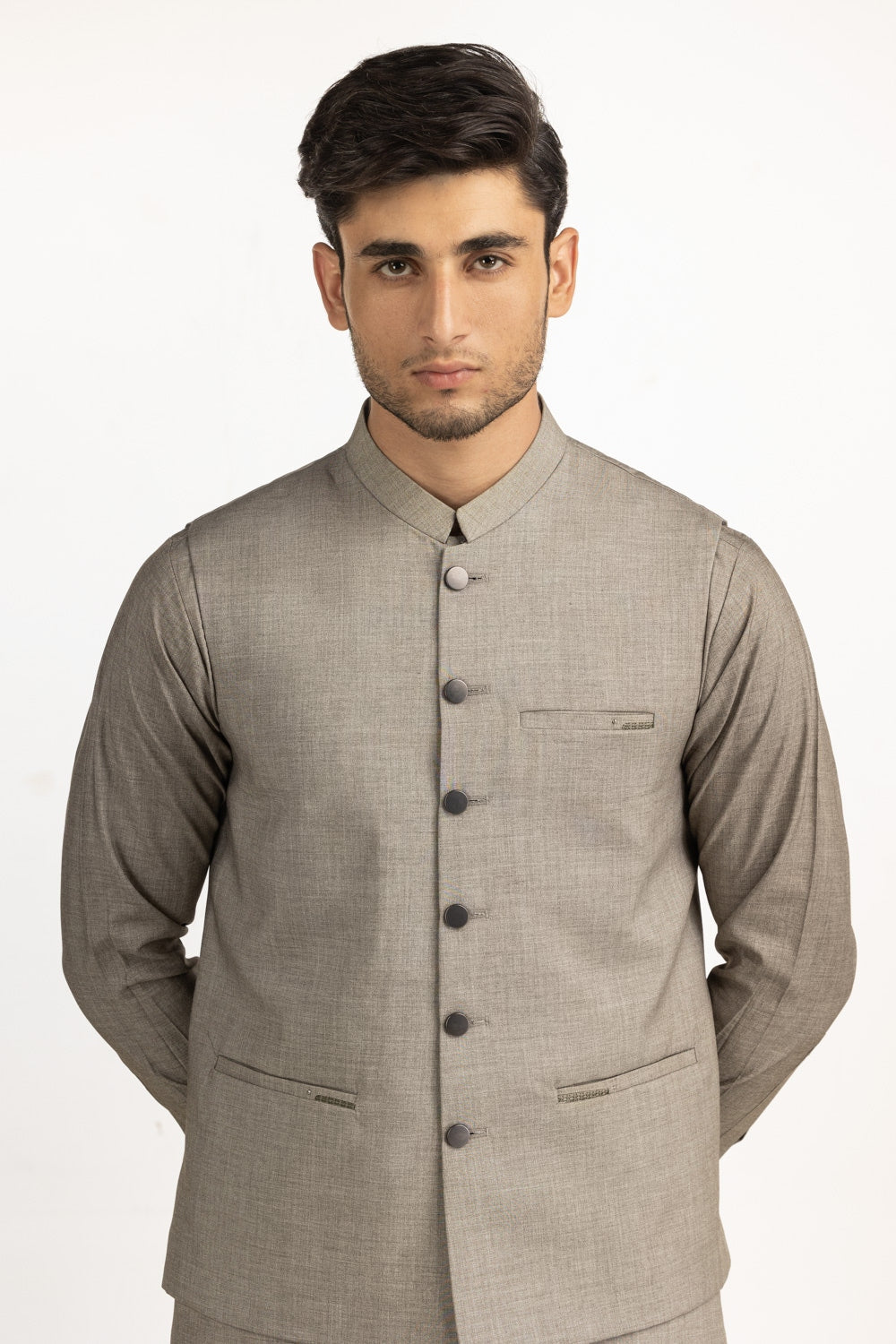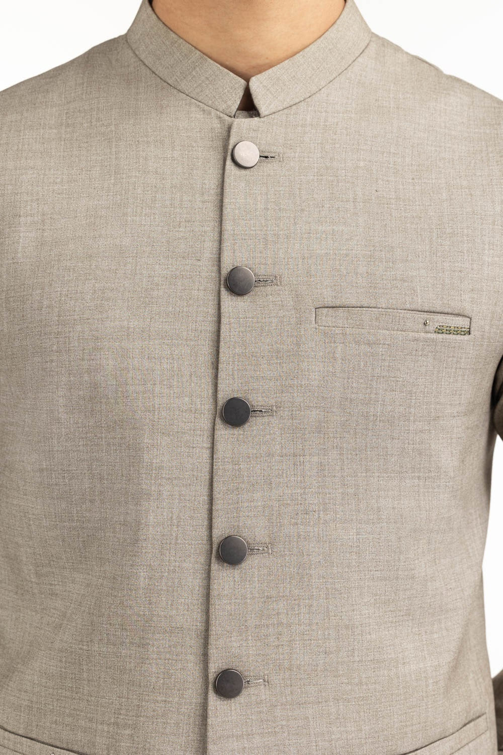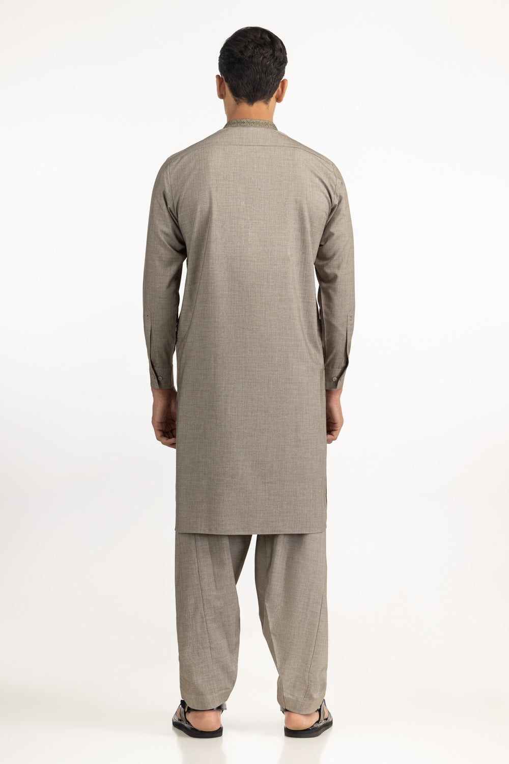 Crafted with simplicity and elegance, this three-piece Blended Fabric Formal Kameez Shalwar, paired with a waistcoat, exudes sophistication. The design features a beautiful embroidered Sherwani collar, straight hem, and cuffs on the kameez, complemented by a shalwar and delicately designed waistcoat with a hint of embroidery on Velt. This timeless garment effortlessly blends traditional aesthetics with modern sensibilities, creating a versatile and refined look