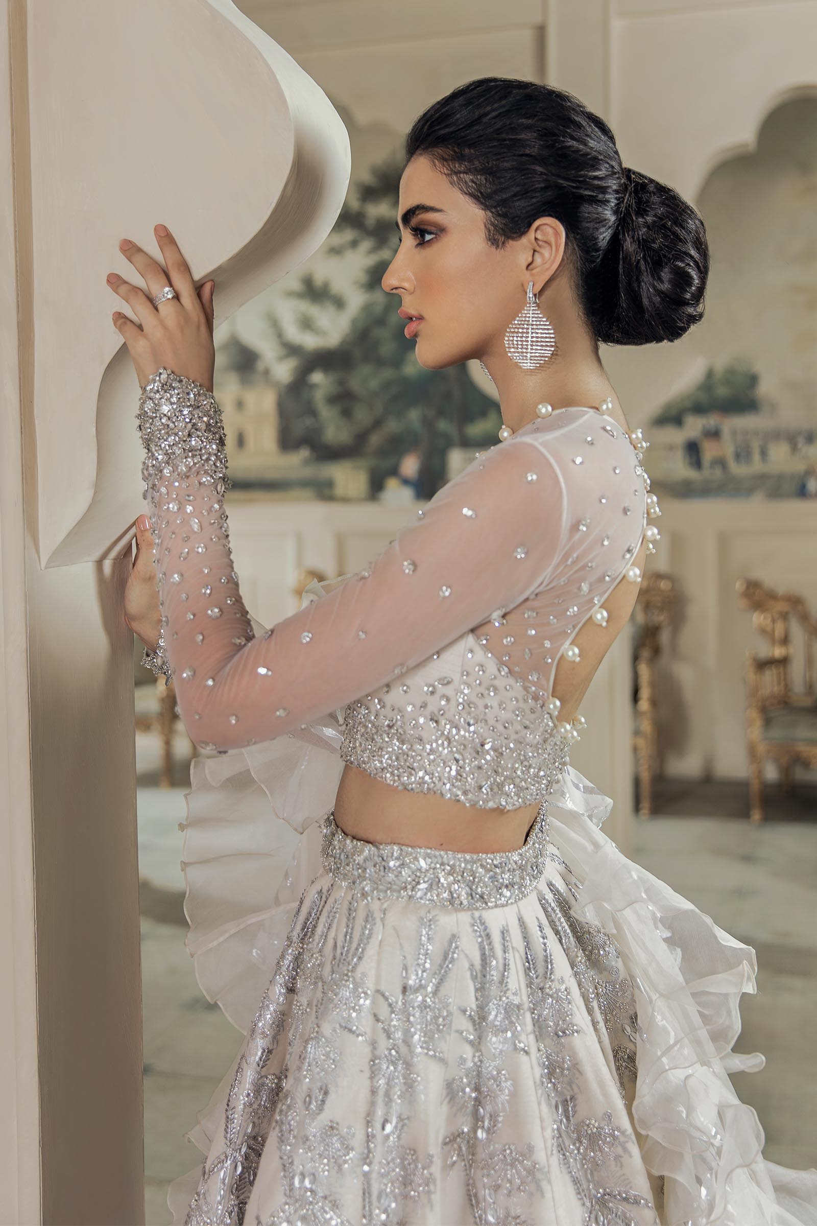 Convey the grace of a Swan in 'Irene'. A fully encrusted bustier blouse is layered under a diaphonous ruffled dupatta and paired with a beautifully handcrafted paneled lehnga featuring thousands of metallic threads shaped into cascading forms of flora on a celestial tiente canvas that flows beautifully making this a perfectly apt look for a statuesque snow queen!