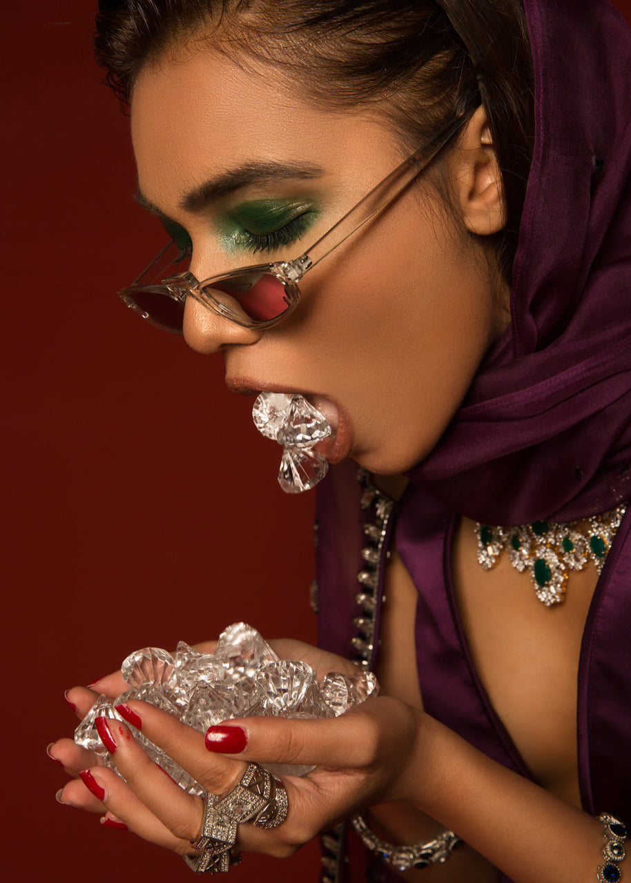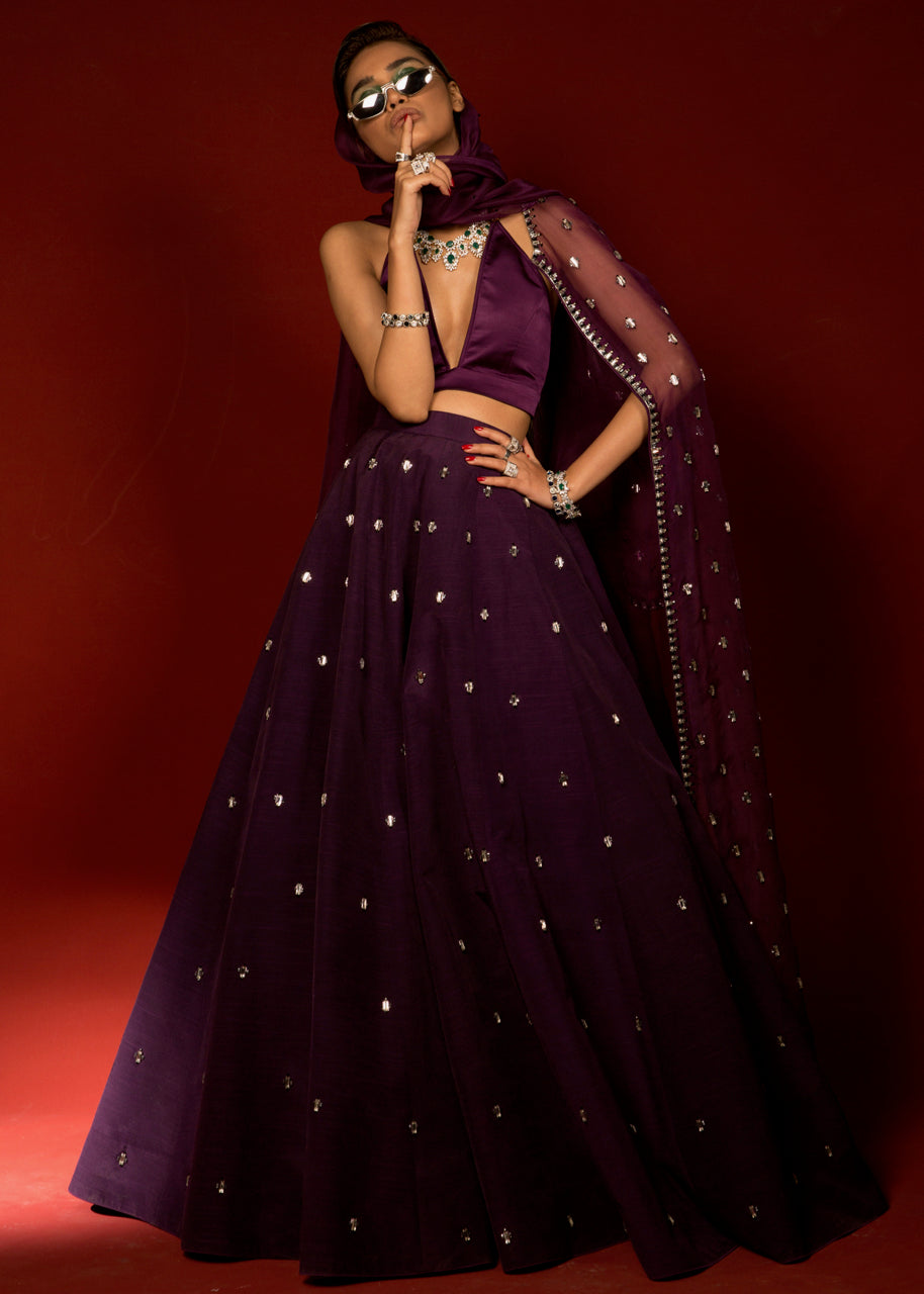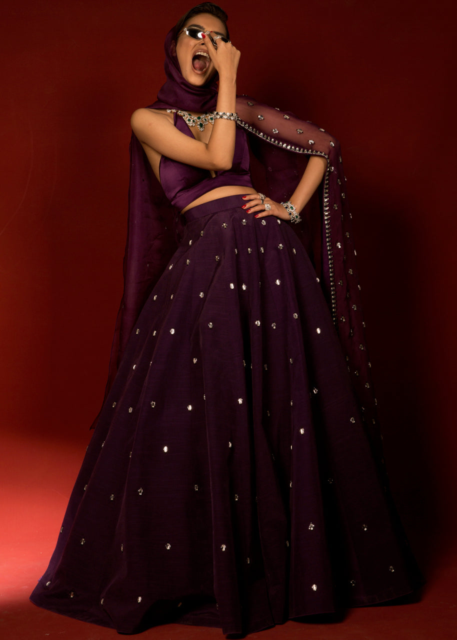 The white raw silk blouse has full sleeves with a round neck. Chunky black embellishments come up to the elbows. Black piping comes down from the centre of the neckline to the hem of the blouse. Black piping is also done to distinguish the plain border from the rest of the white raw silk skirt. The entire ensemble is finished with black piping and lined with medium silk.