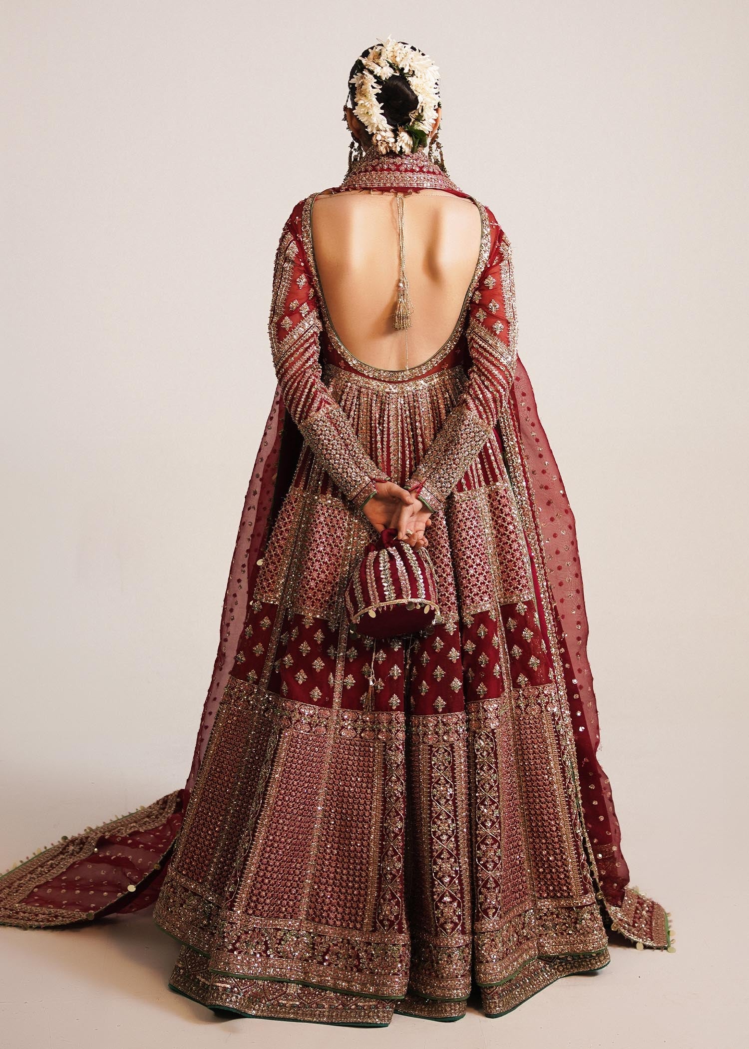 This ravishing bridal outfit is rendered in a beautiful shade of berry red composed on an organza front open peshwas with an intricate and exquisite detailed adda work of sequins, Buggle beads, resham, nakshi and dabka makes truely an artwork. Lehnga feautures all over handwork chatta and a detailed border enhanced with nakshi and stonework. To complete the look paired it with organza duppata composed of heavy chatta in the middle and heavy embellished four side border finished with an accent color of sage green gives an ethnic regality.