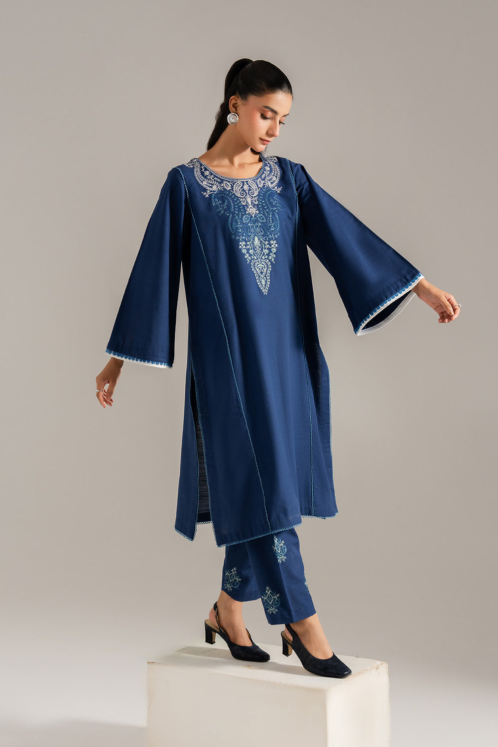 Channel understated elegance in this State Blue 2-piece khaddar set, featuring a scoop-neck paneled A-line kurta with delicate lace detailing. Paired with an embroidered skinny shalwar, it blends classic charm with contemporary sophistication.
