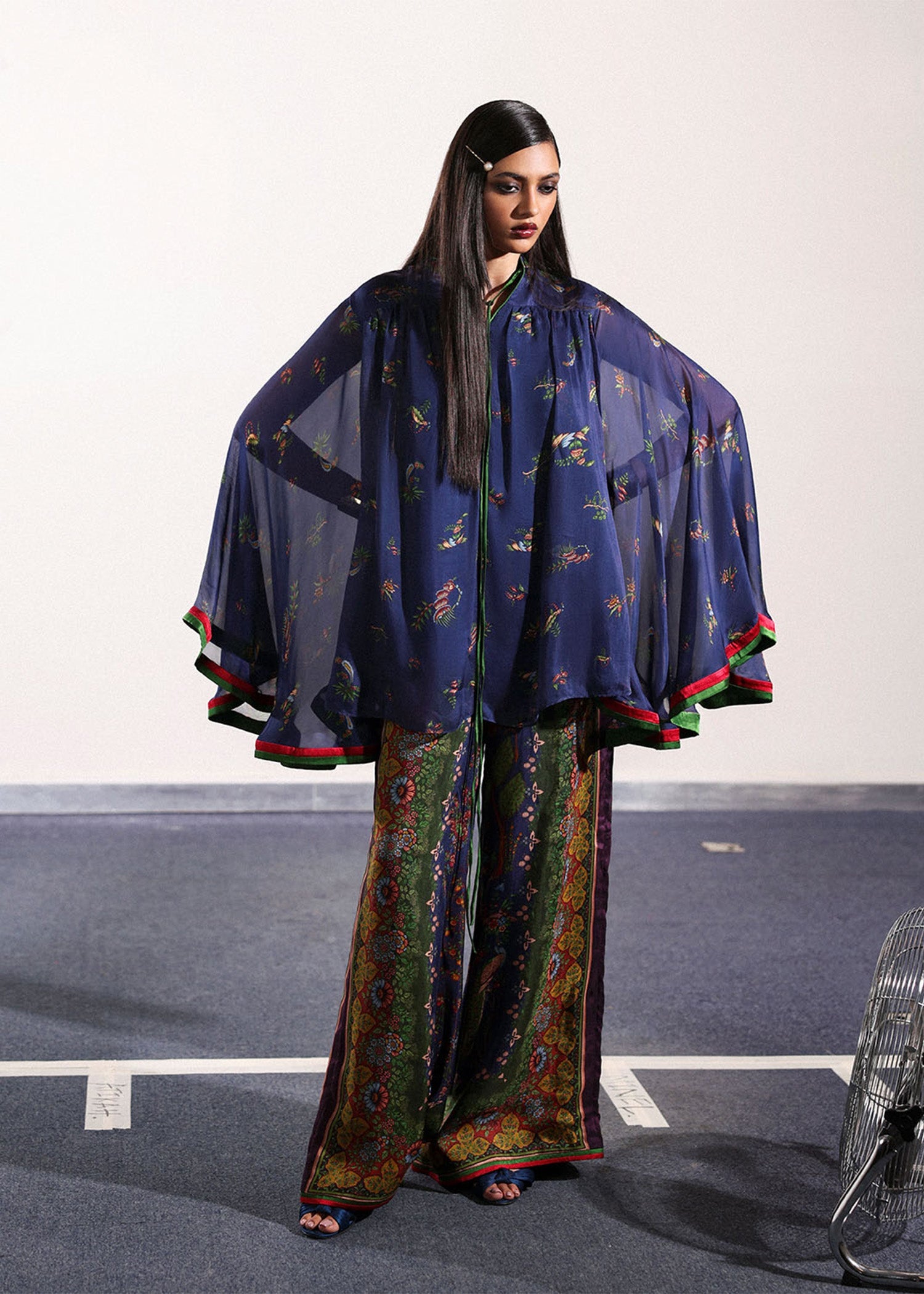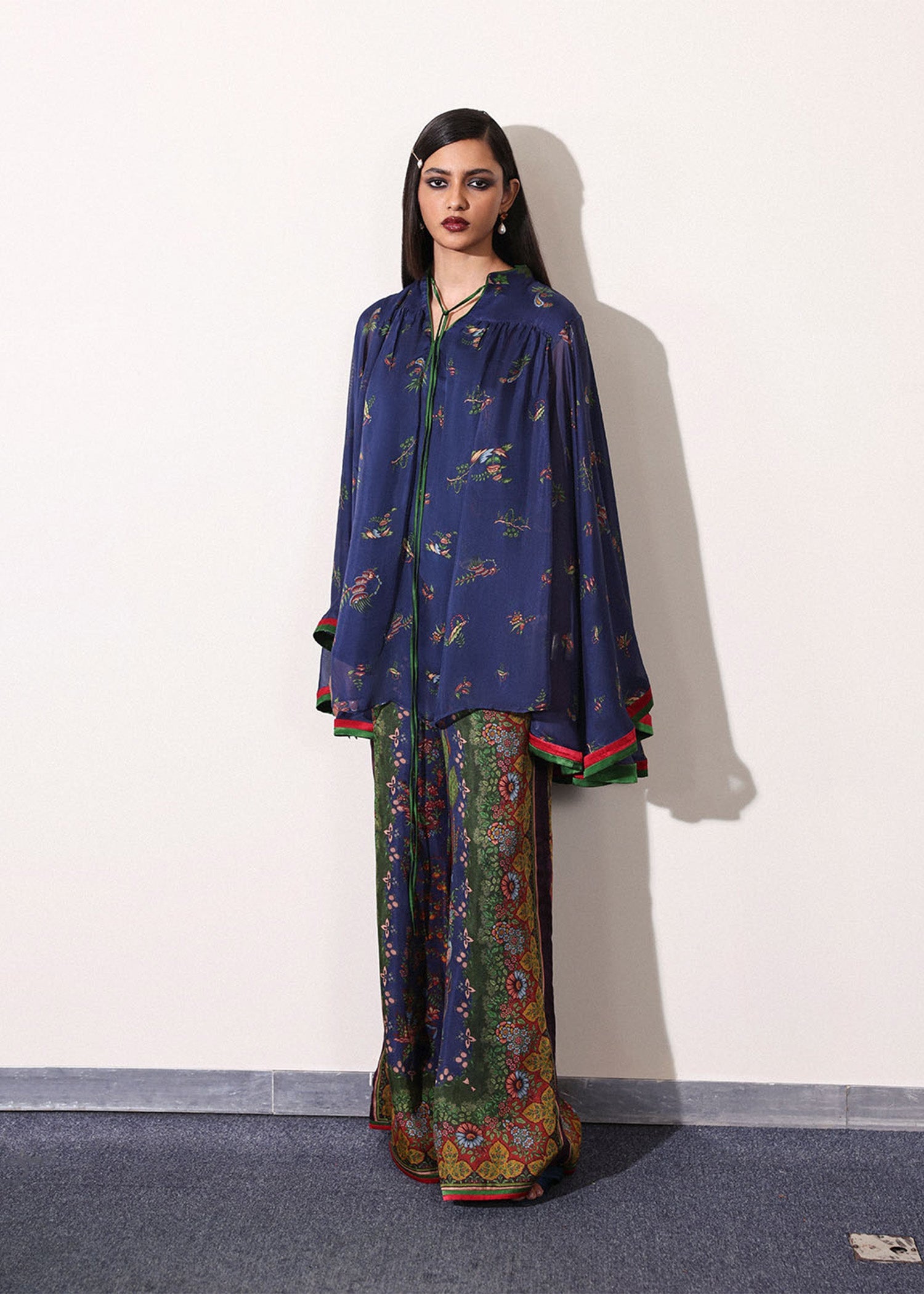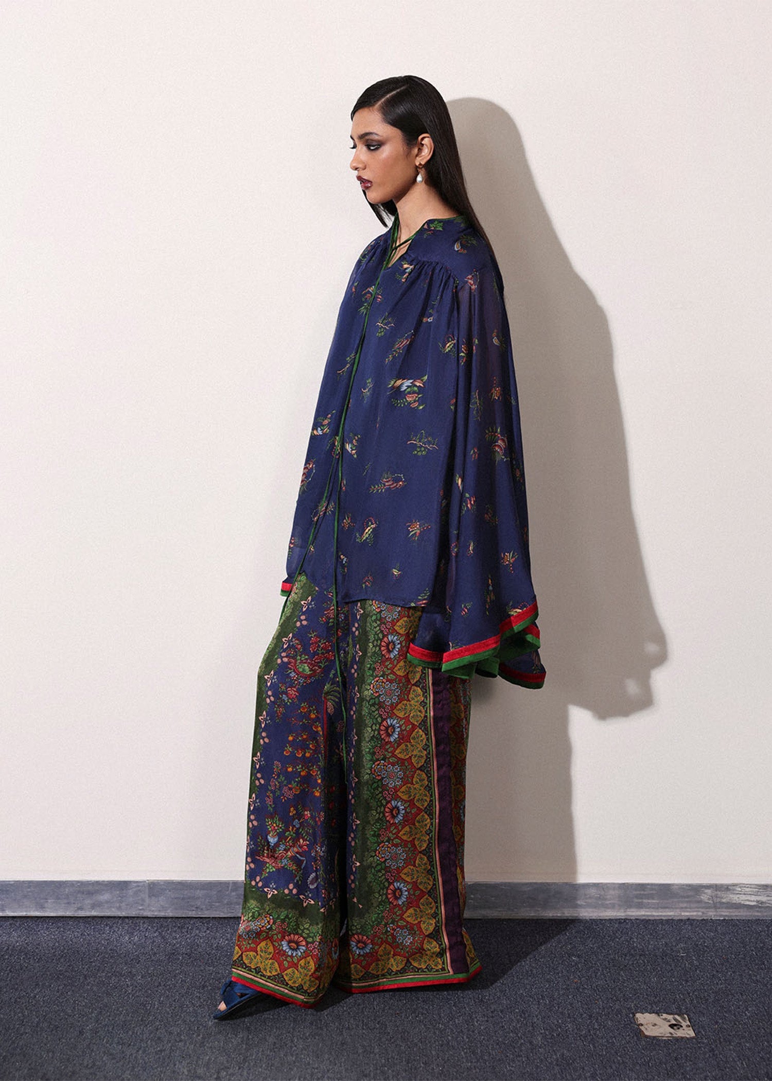 A midnight blue mid-thigh length floral printed silk shirt with red and green satin silk trims on full-circle sleeves and green satin tassel detailing on the neckline. Paired with multicolored floral printed wide-leg pants for a bold, effortless statement.