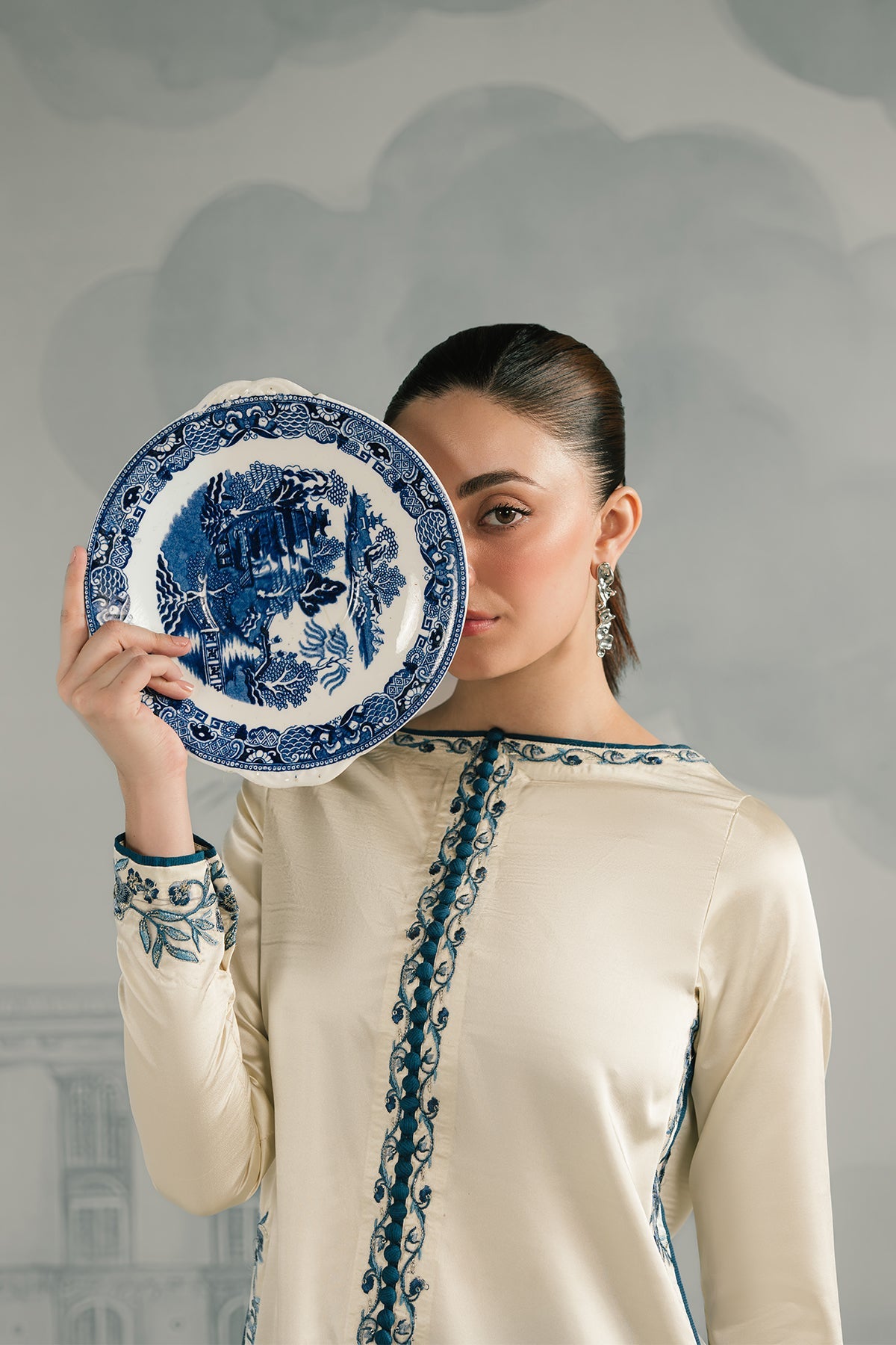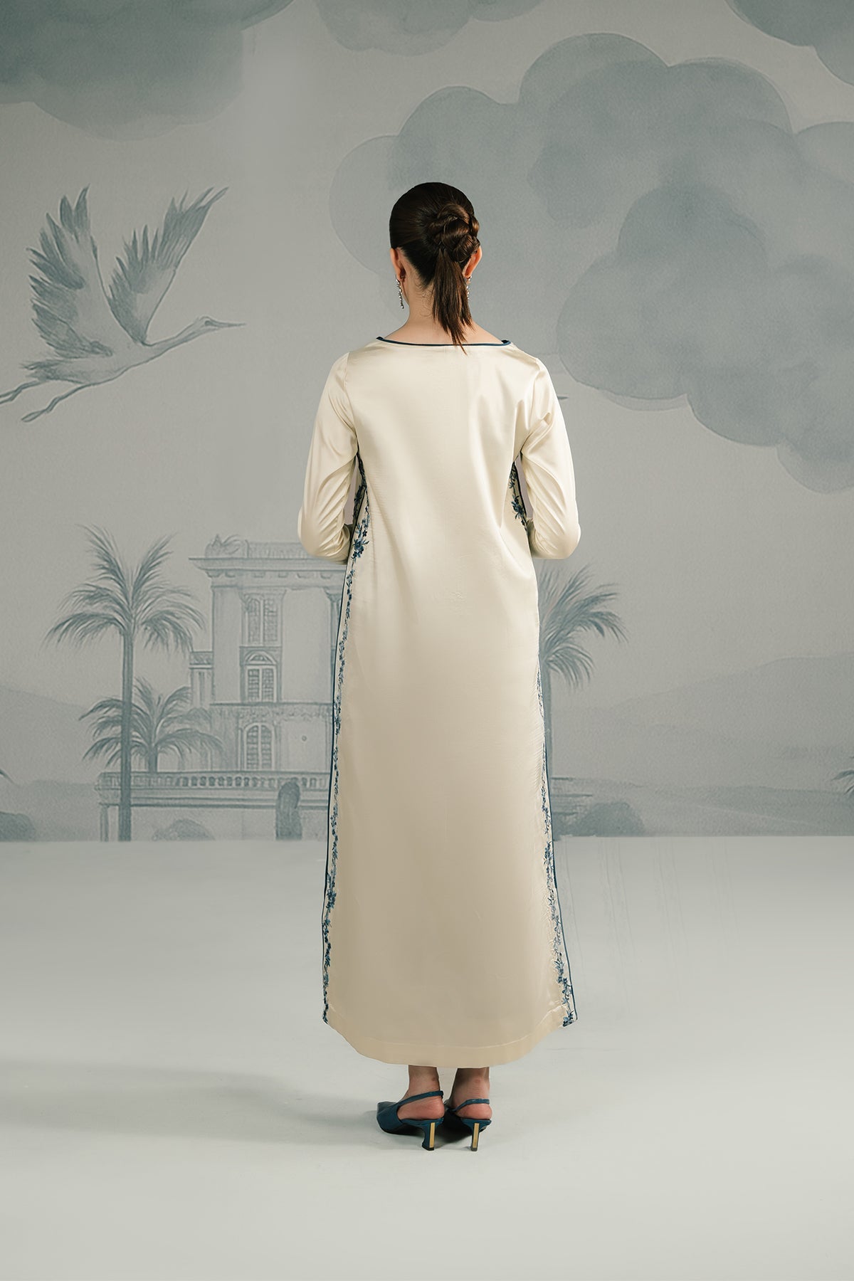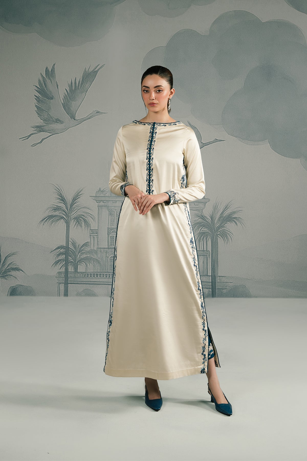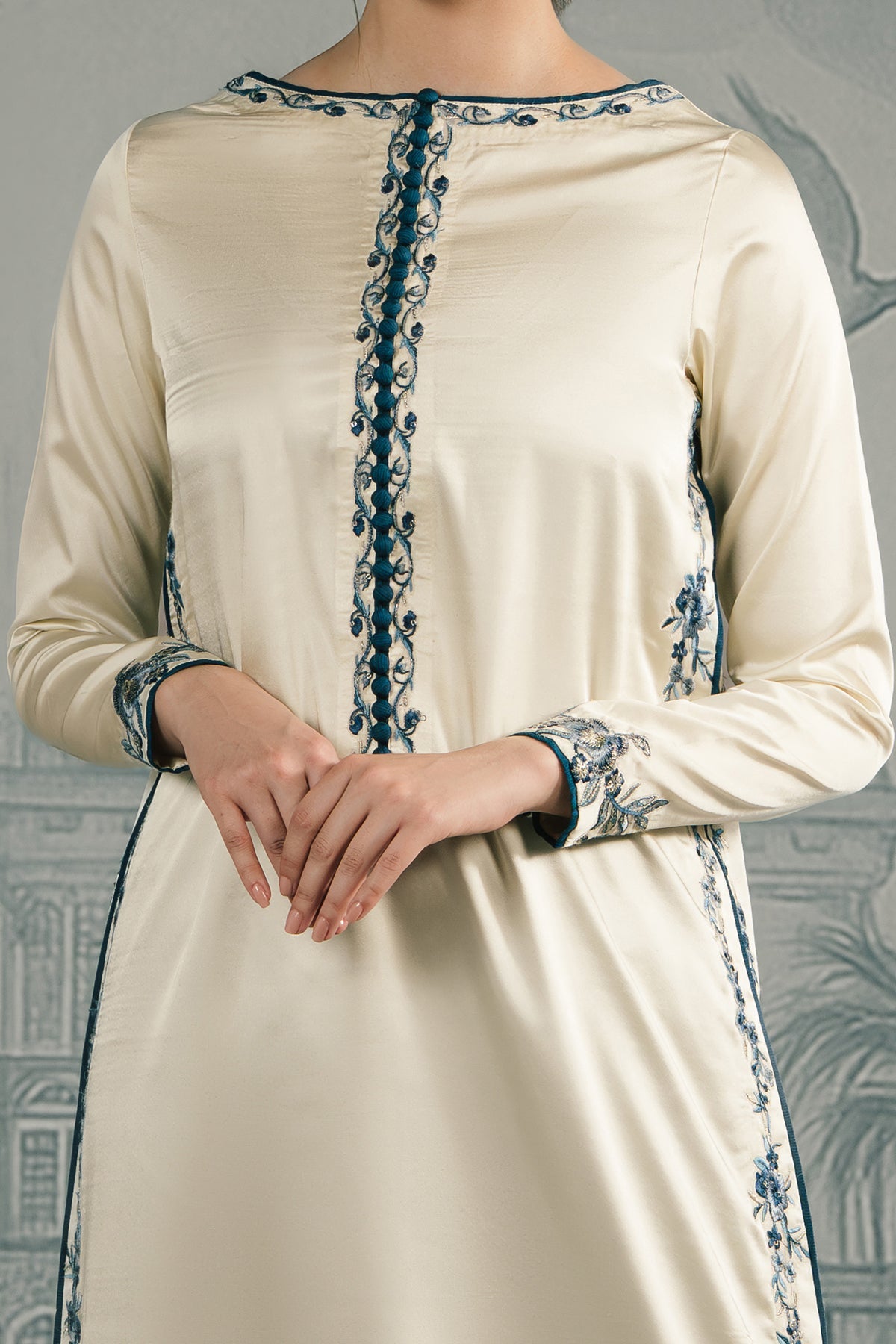 An ivory raw silk long shirt in a sleek straight cut, accentuated with sapphire blue embroidered detailing along the neckline, sleeves and side panels. Paired with matching trouser for a clean, elongated silhouette, the ensemble reflects understated elegance β minimal in design yet majestic in presence.