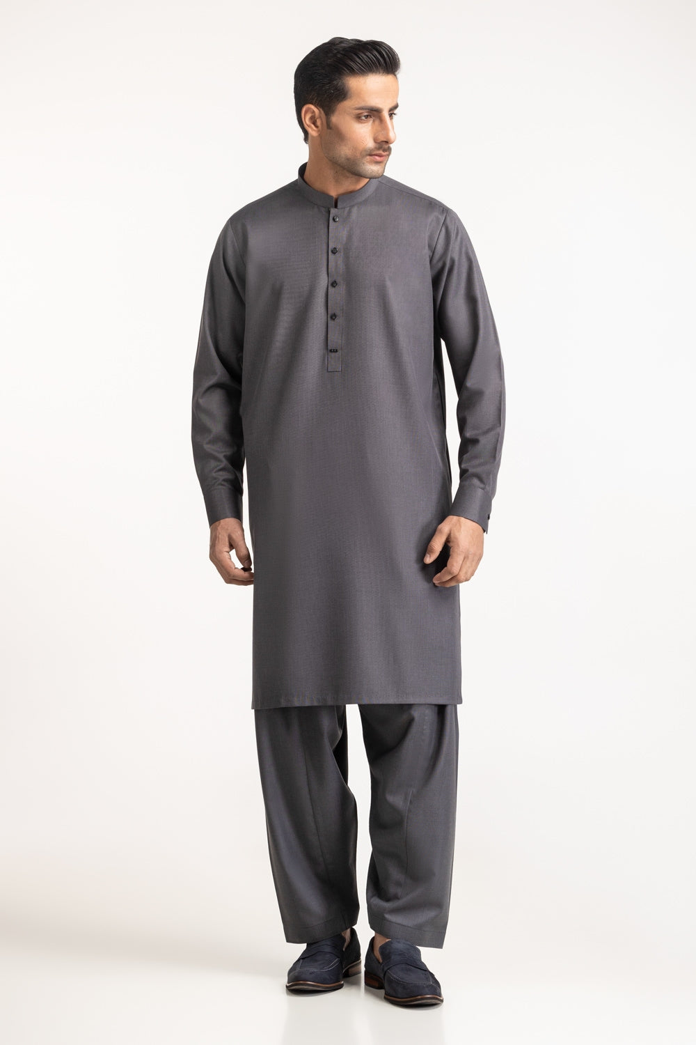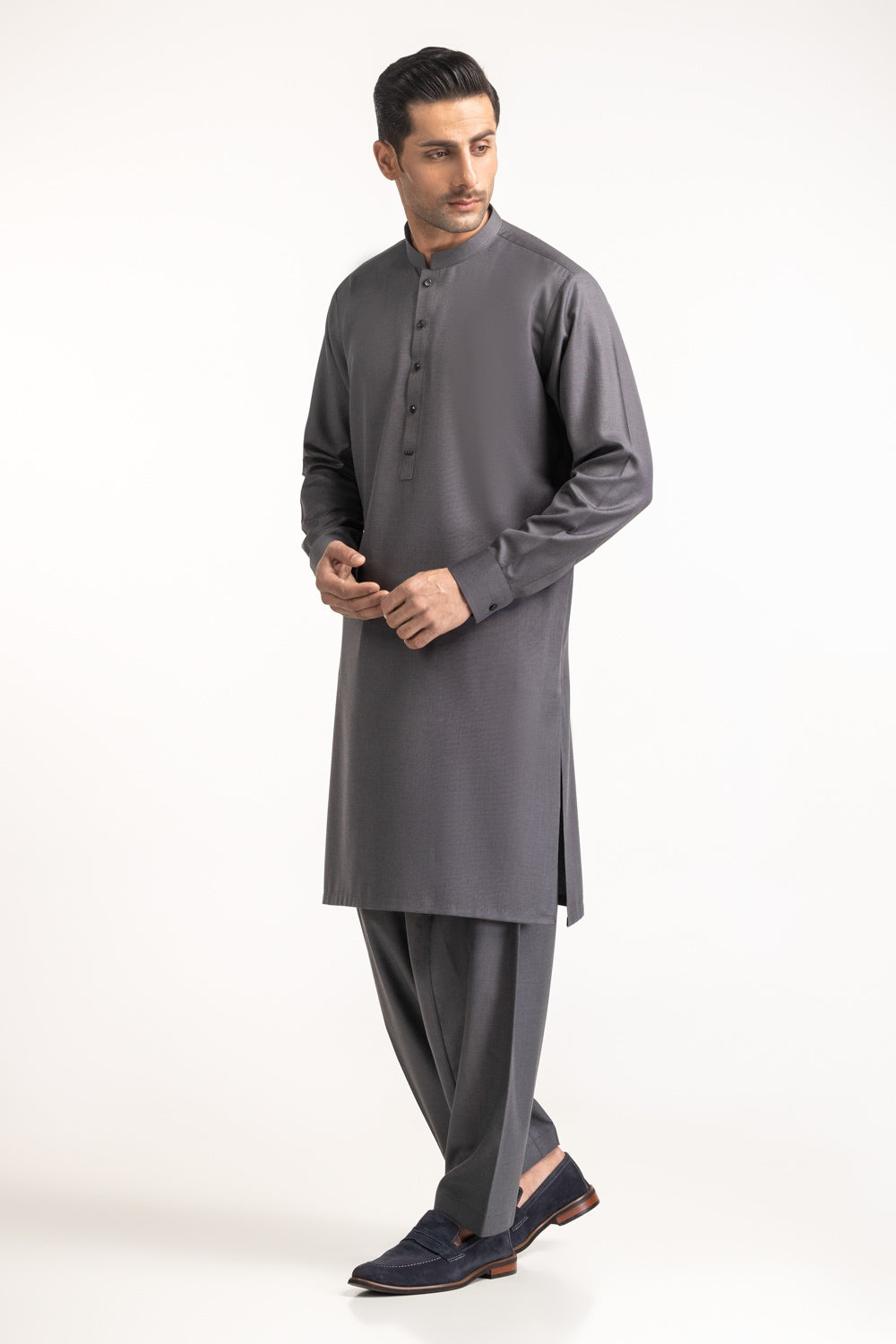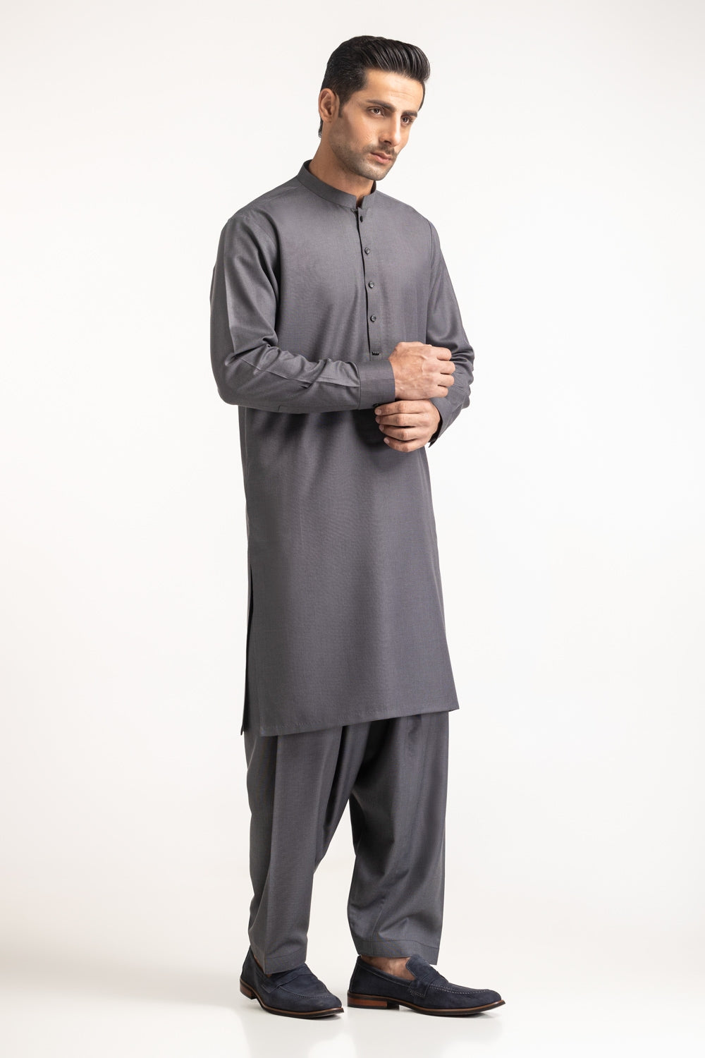 Crafted with simplicity and elegance, this three-piece Taupe Blended Fabric Formal Kameez Shalwar, paired with a waistcoat, exudes sophistication
