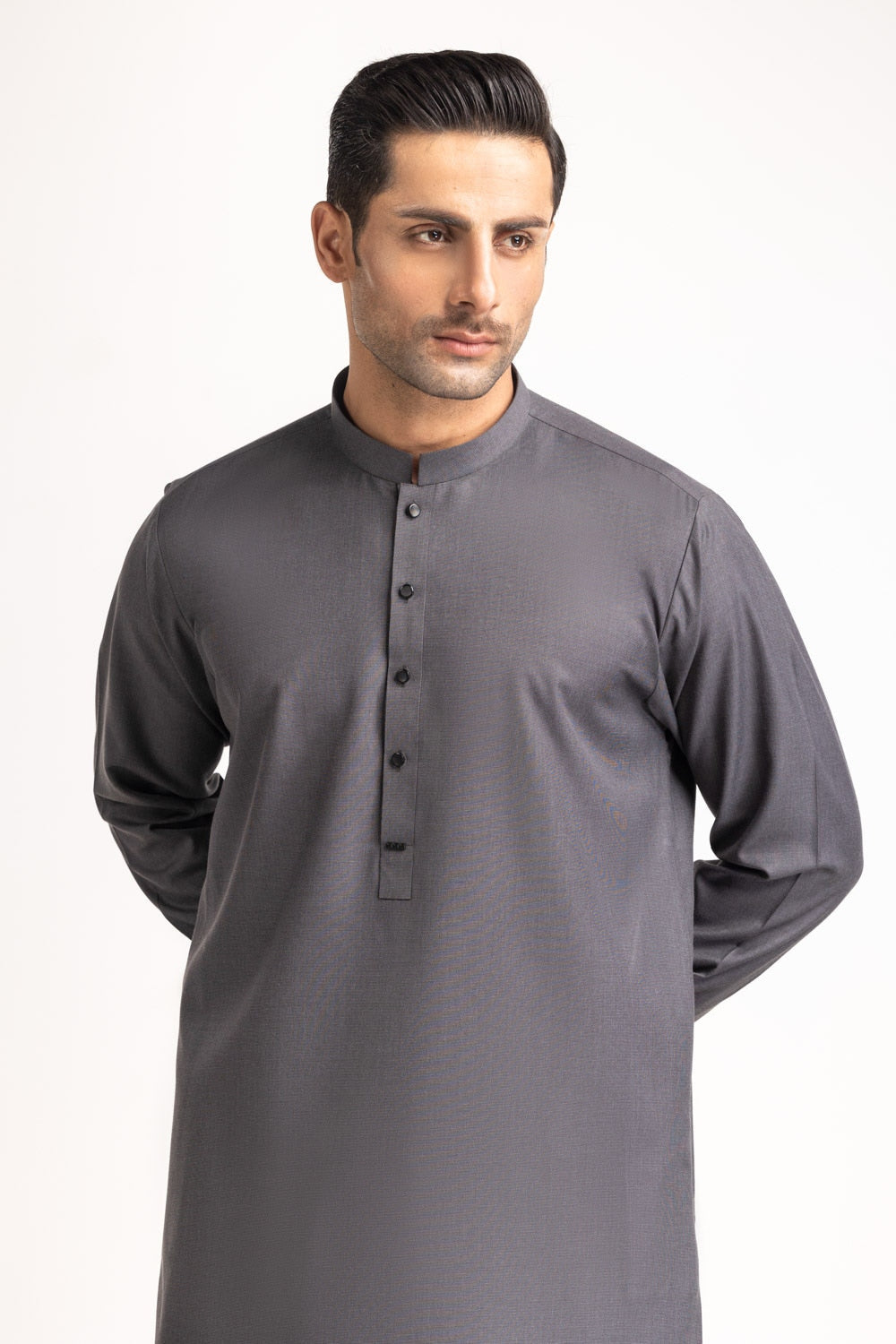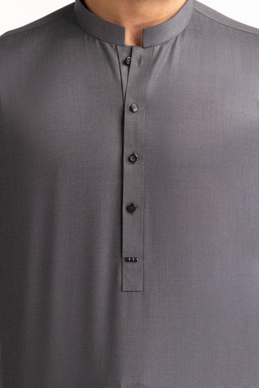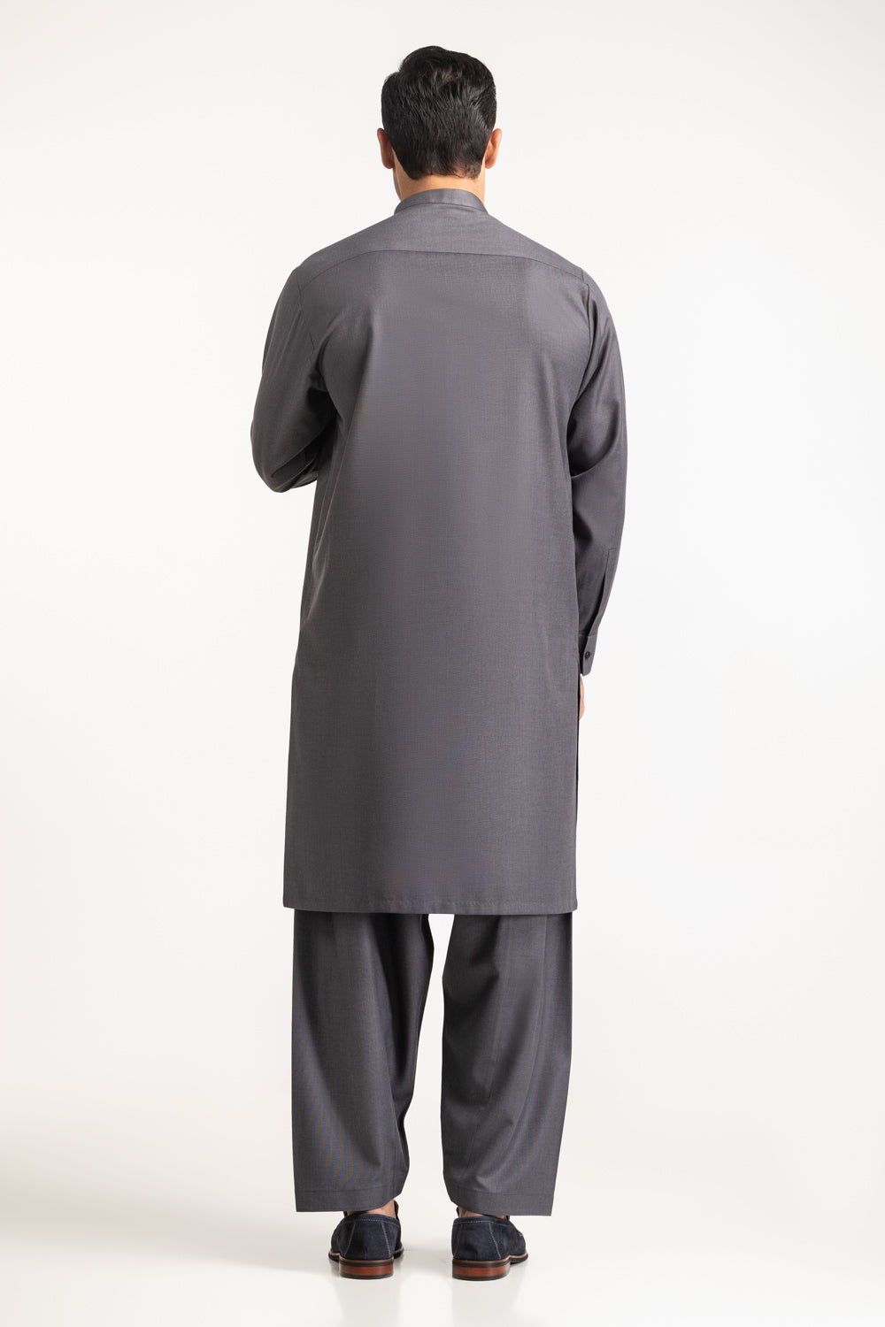 Crafted with simplicity and elegance, this three-piece Taupe Blended Fabric Formal Kameez Shalwar, paired with a waistcoat, exudes sophistication
