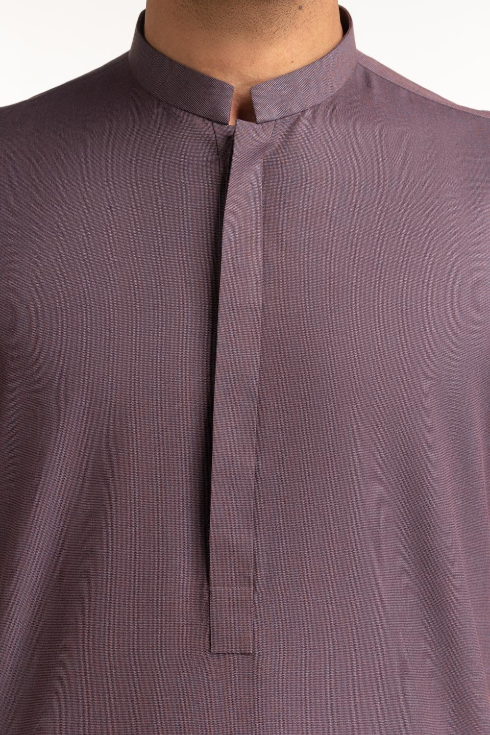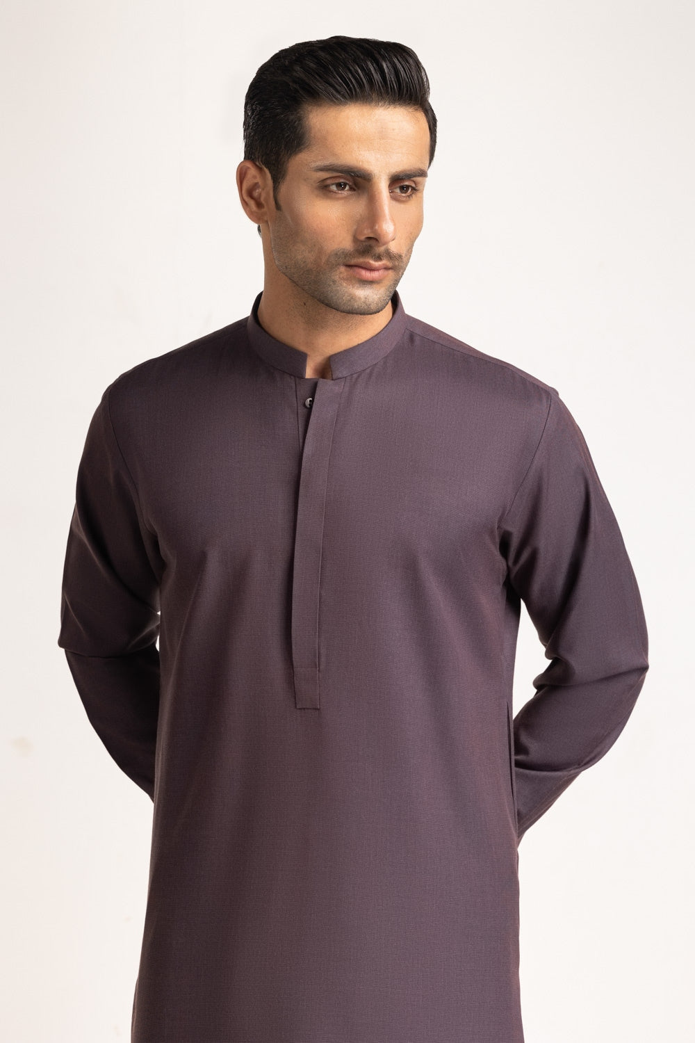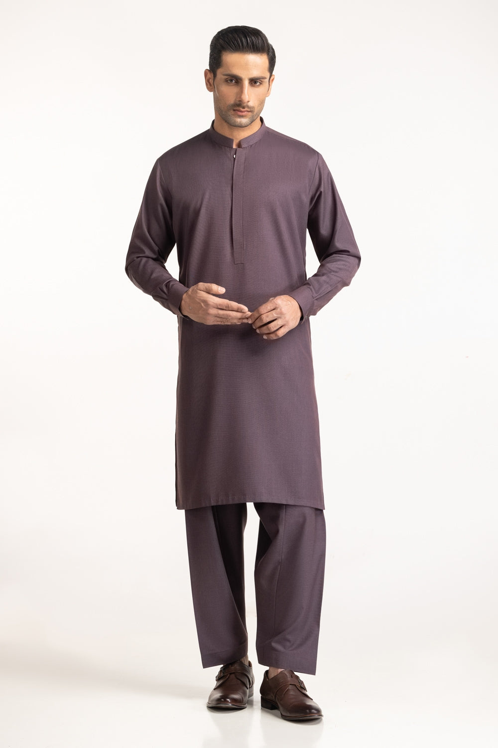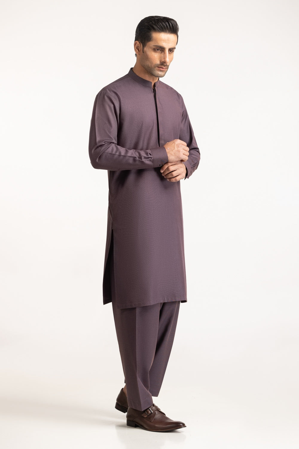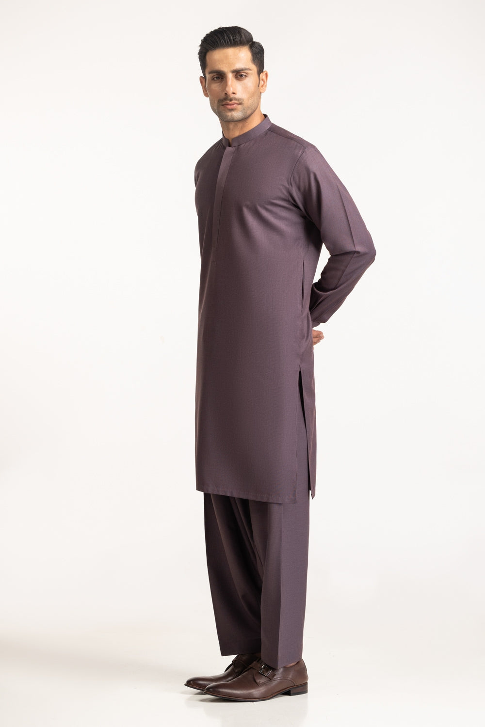 Crafted with simplicity and elegance, this three-piece Taupe Blended Fabric Formal Kameez Shalwar, paired with a waistcoat, exudes sophistication
