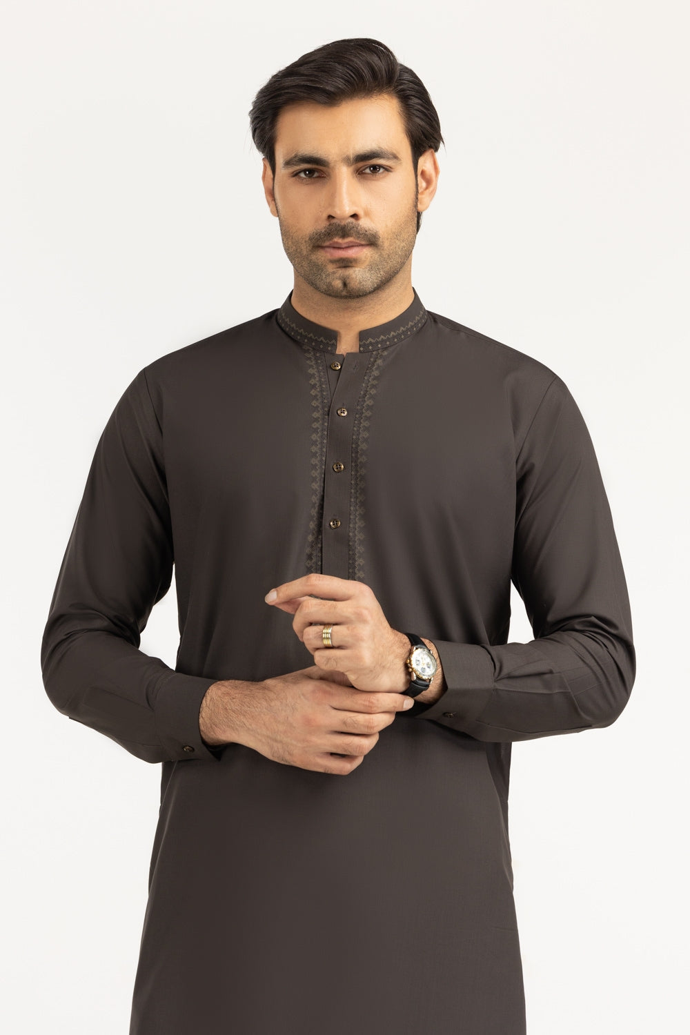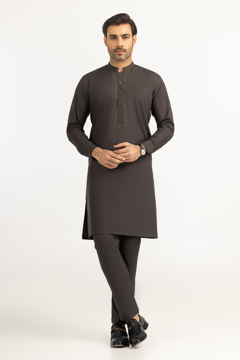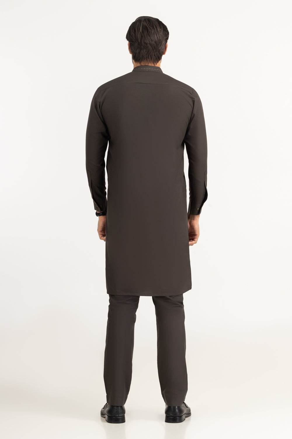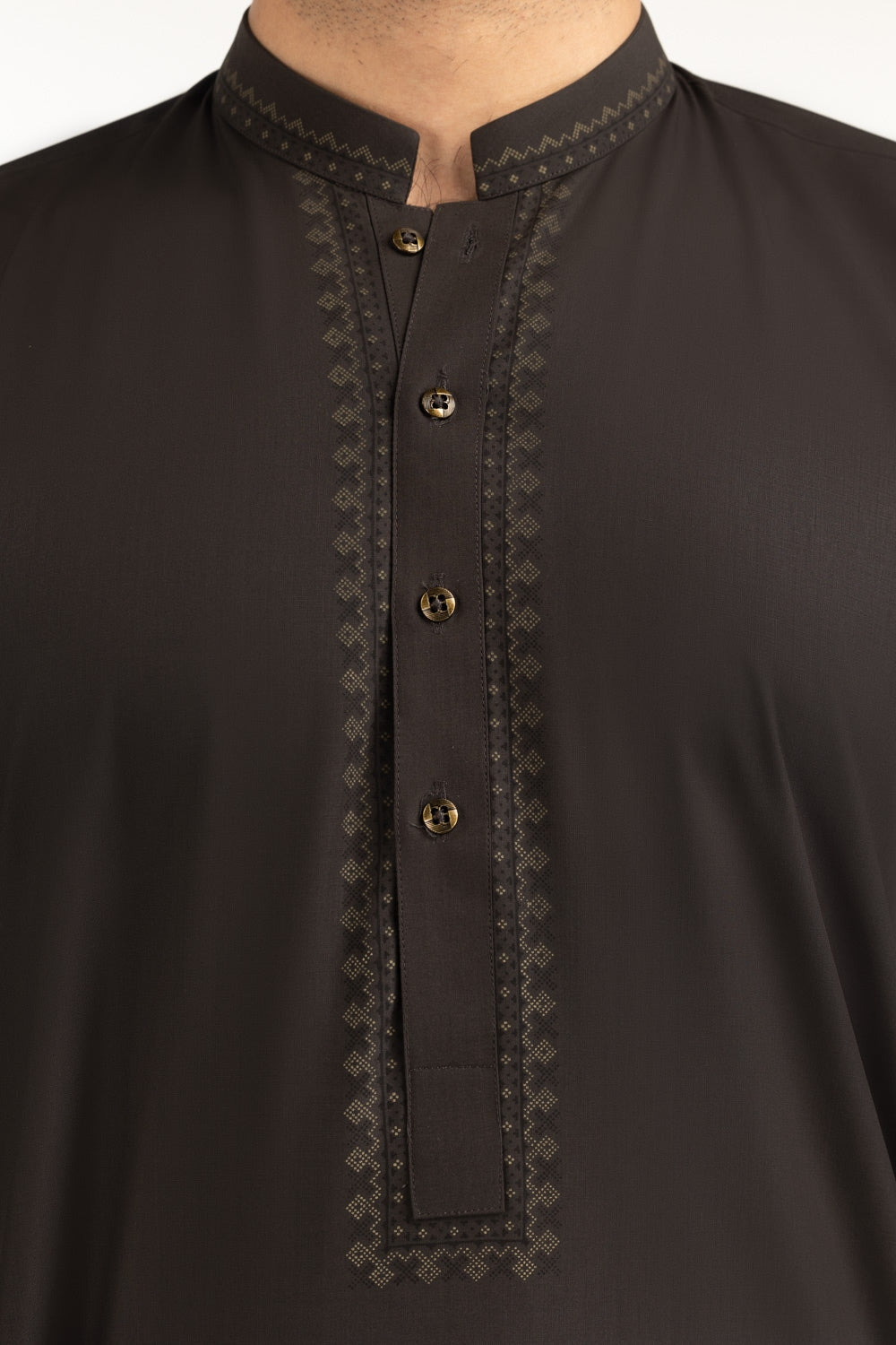 Crafted with simplicity and elegance, this three-piece Taupe Blended Fabric Formal Kameez Shalwar, paired with a waistcoat, exudes sophistication