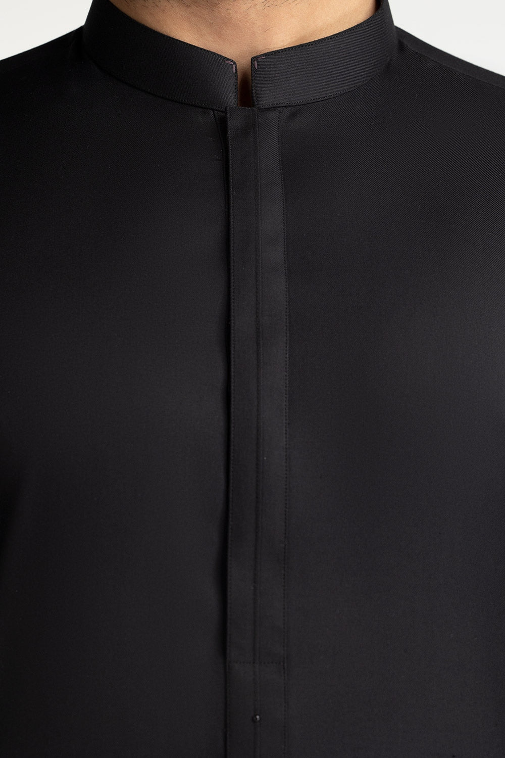 Crafted with simplicity and elegance, this Black Blended Casual Kameez Shalwar features a sherwani collar and straight hem, effortlessly blending traditional aesthetics with modern sensibilities to create a timeless and versatile garment