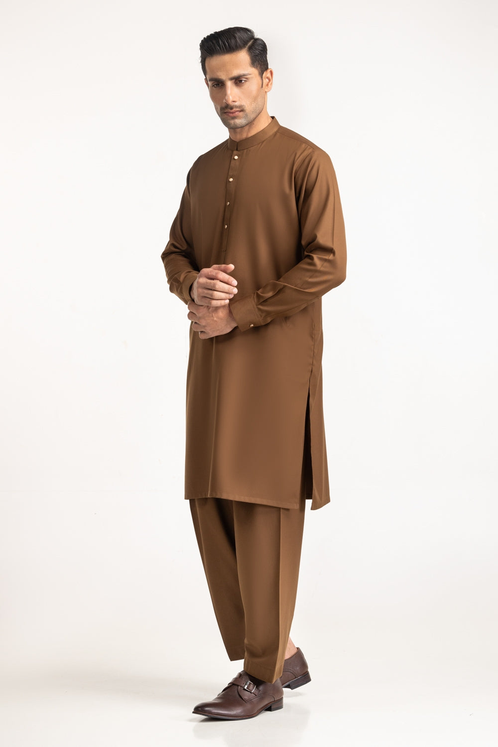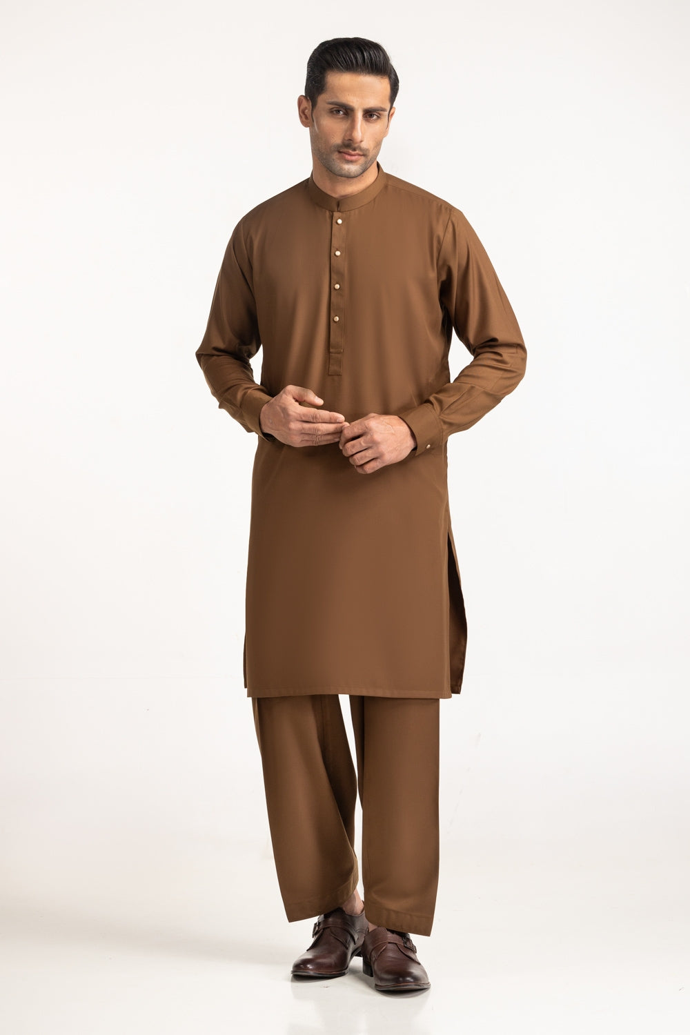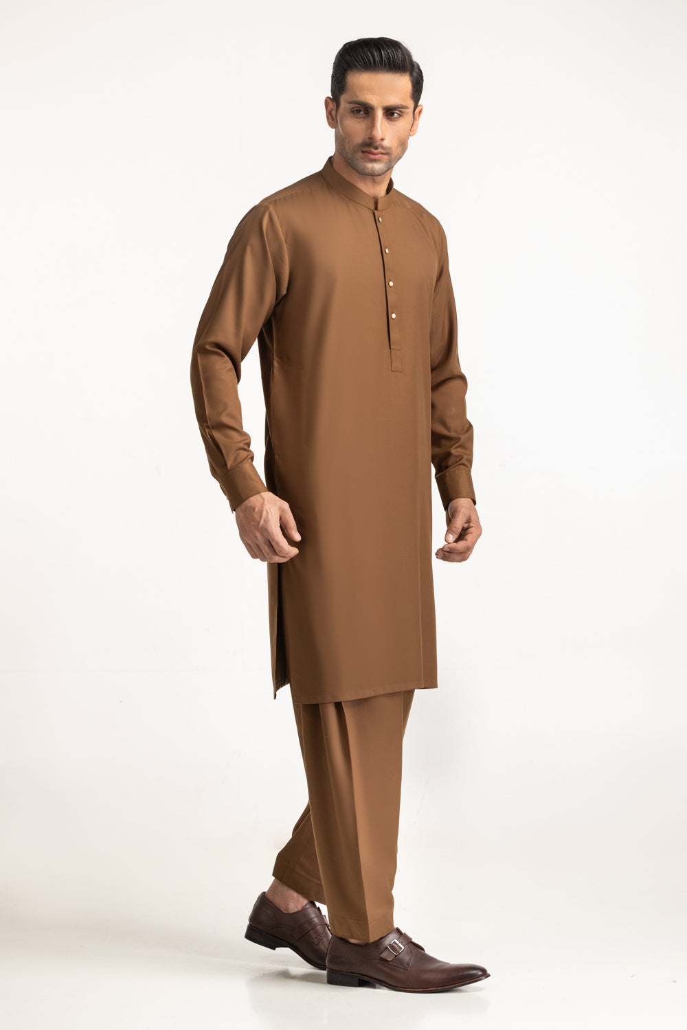 Crafted with simplicity and elegance, this three-piece Taupe Blended Fabric Formal Kameez Shalwar, paired with a waistcoat, exudes sophistication