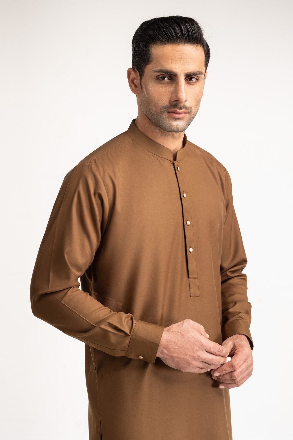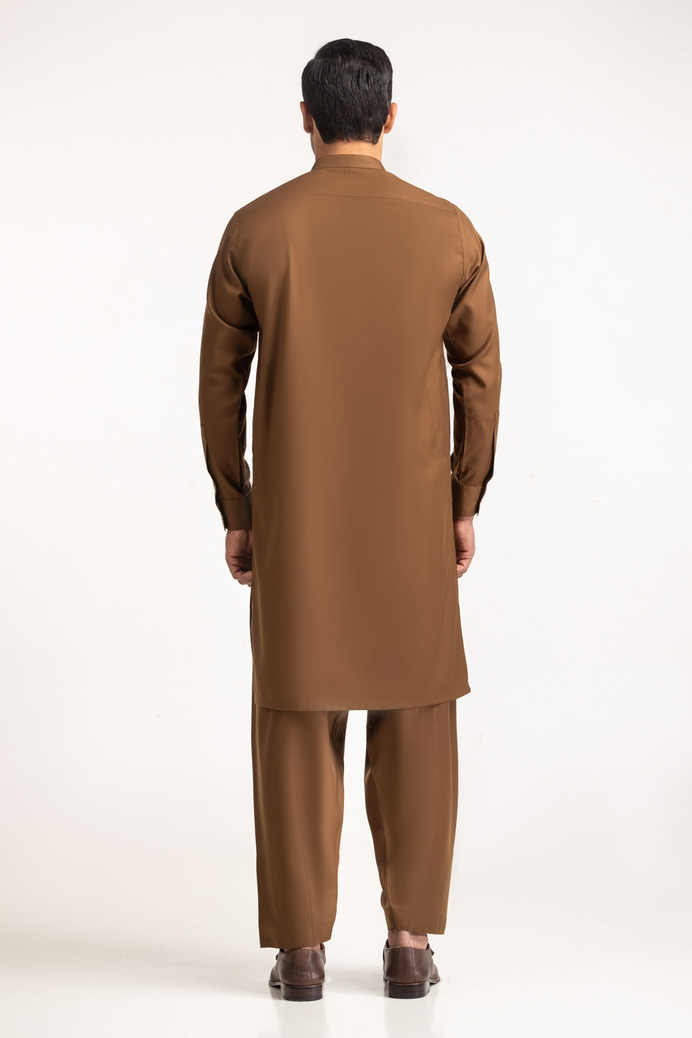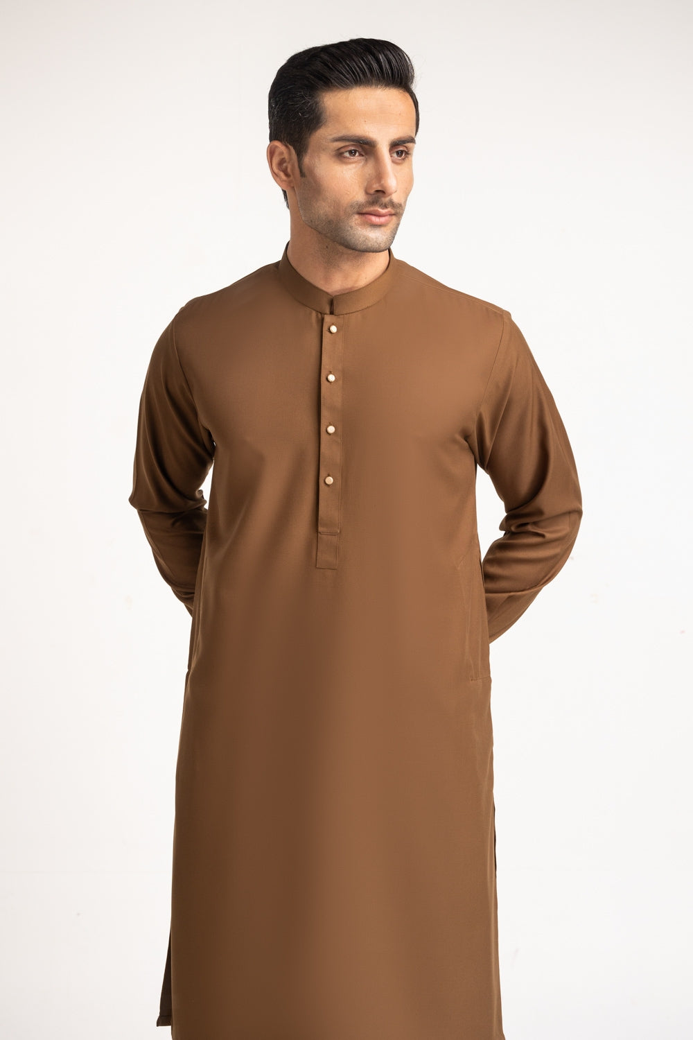 Crafted with simplicity and elegance, this three-piece Taupe Blended Fabric Formal Kameez Shalwar, paired with a waistcoat, exudes sophistication