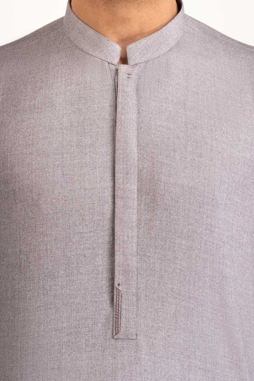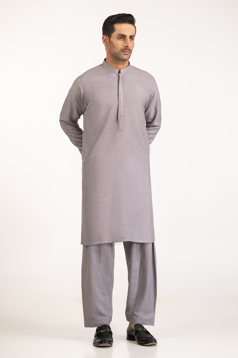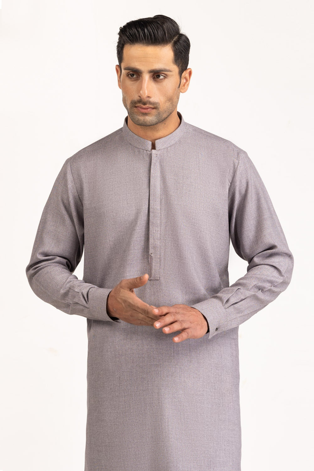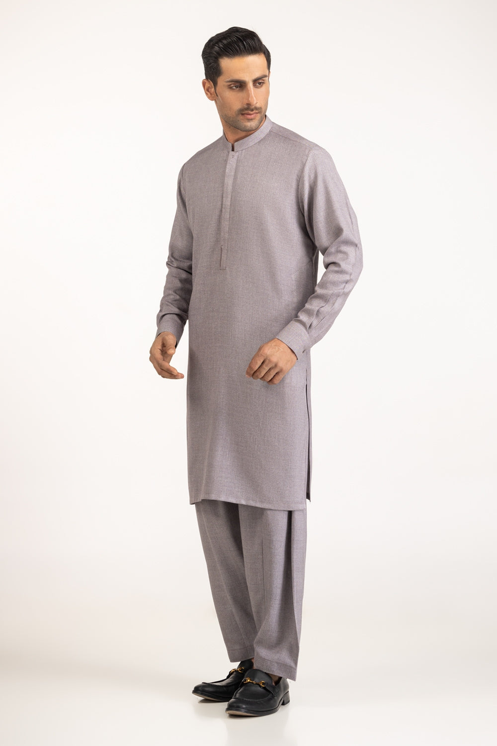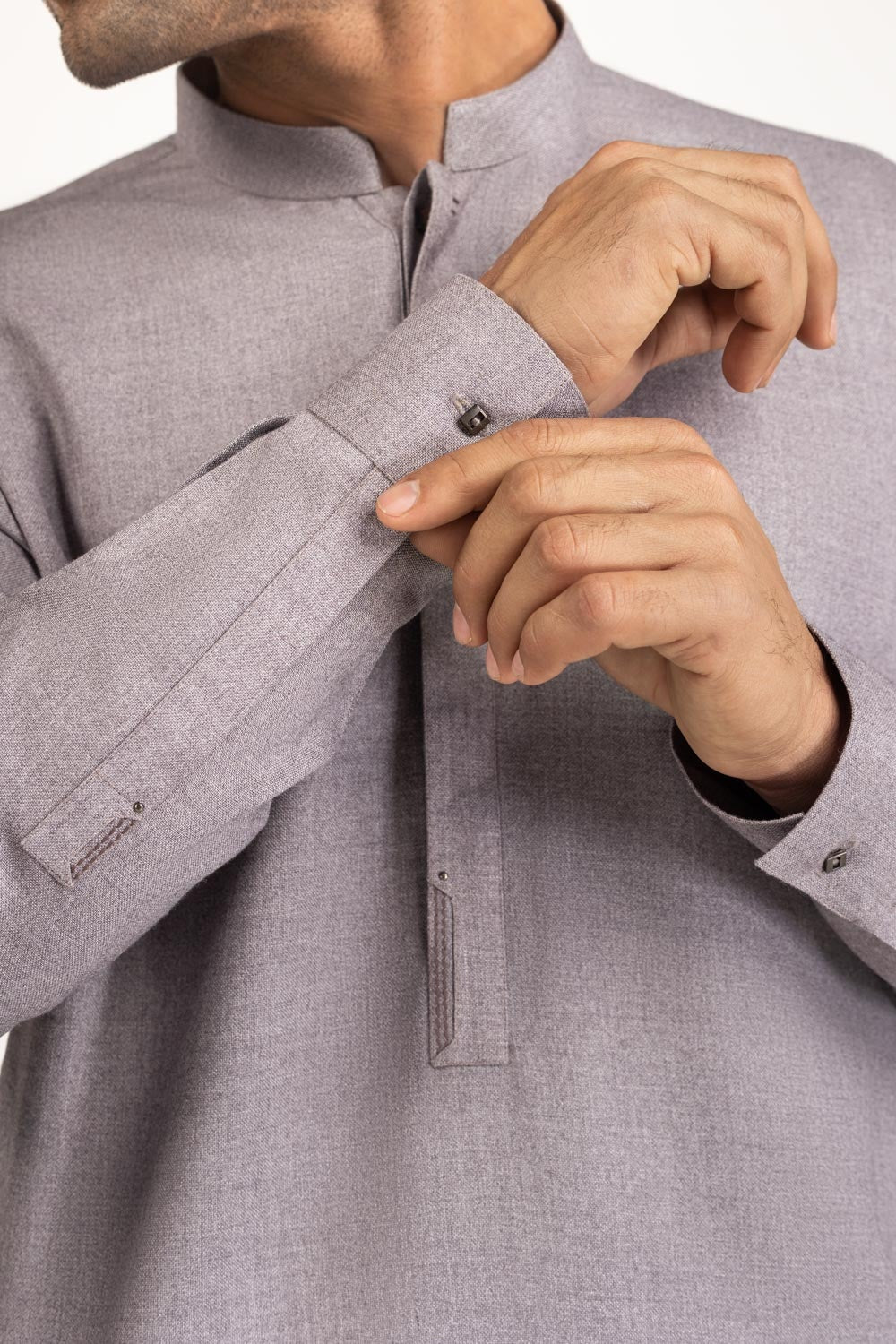 Crafted with simplicity and elegance, this three-piece Taupe Blended Fabric Formal Kameez Shalwar, paired with a waistcoat, exudes sophistication