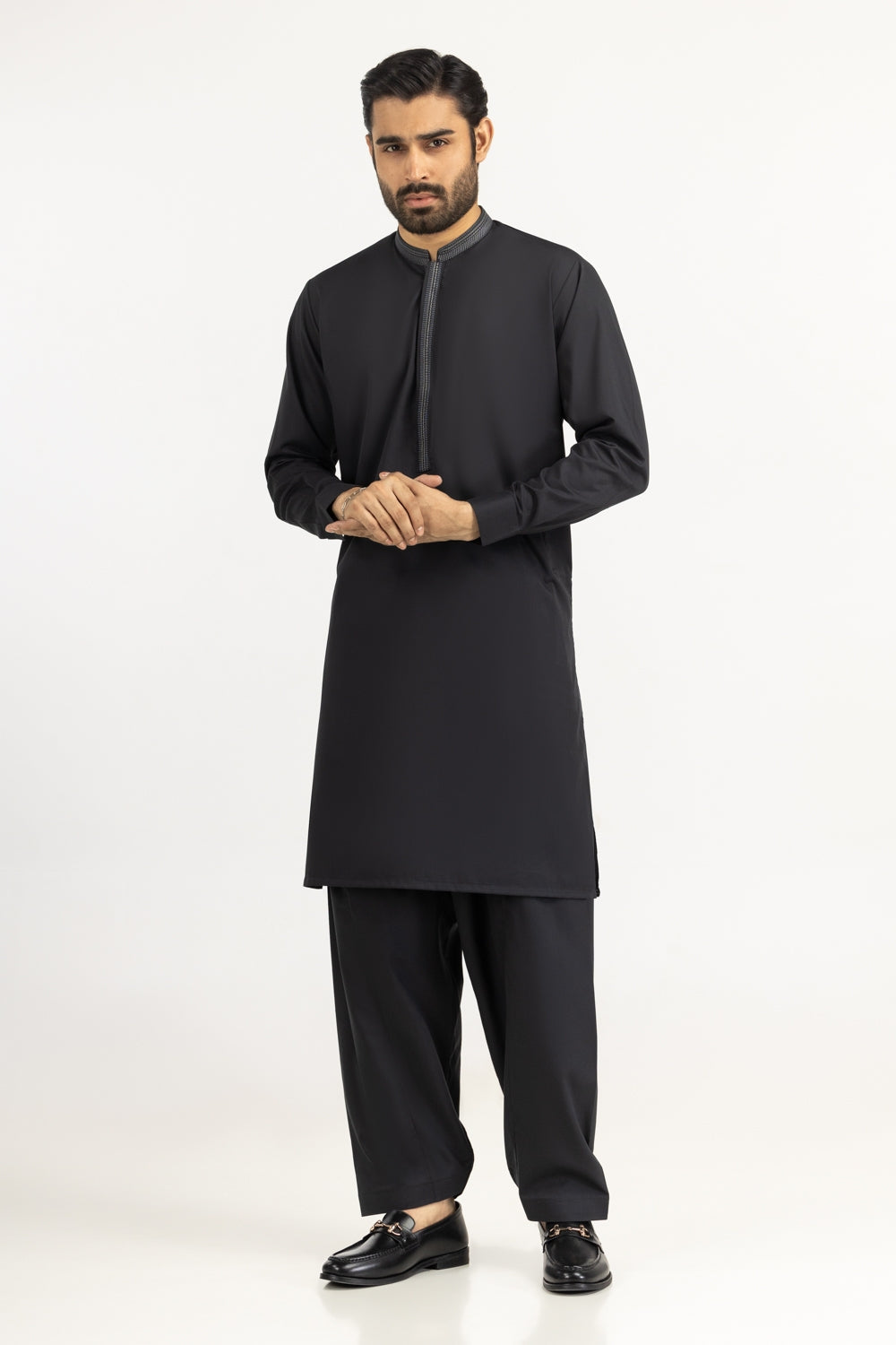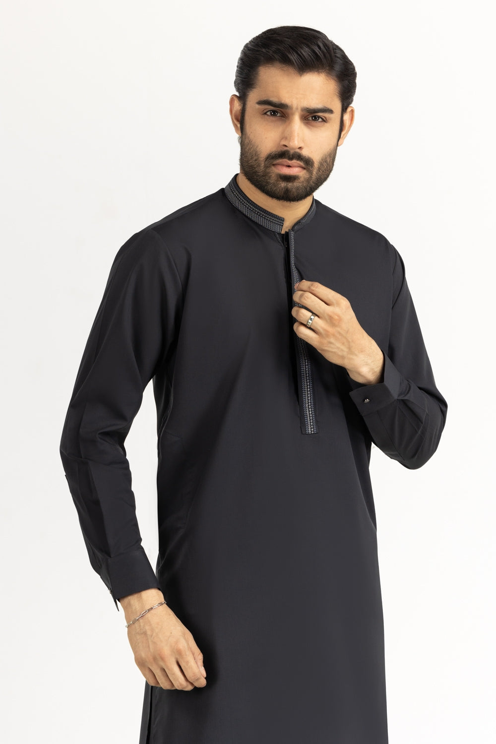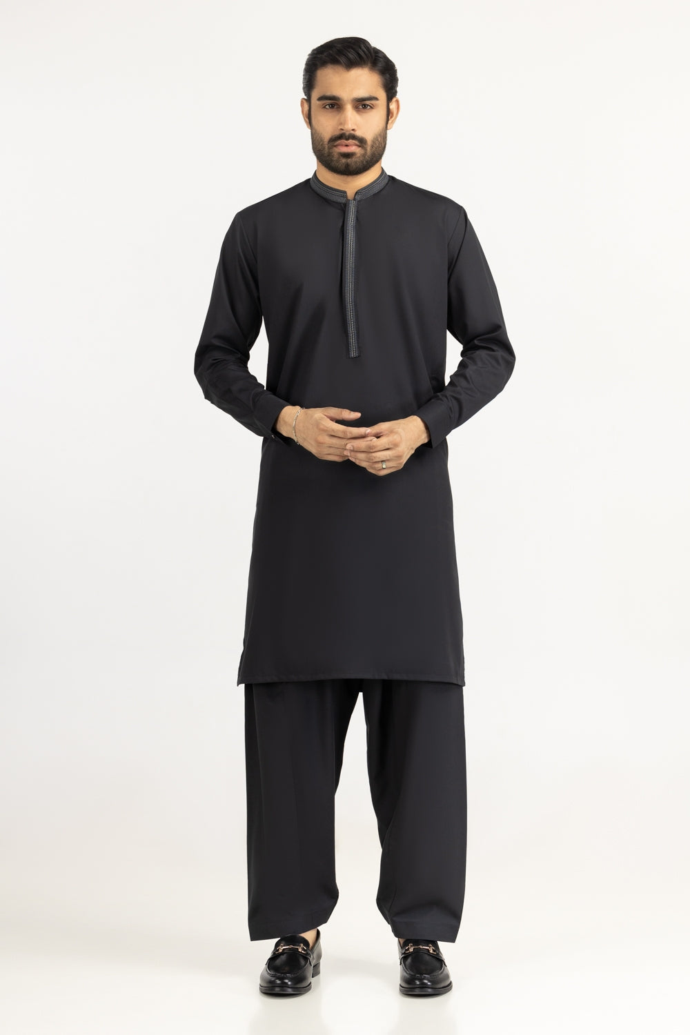 Crafted with simplicity and elegance, this three-piece Taupe Blended Fabric Formal Kameez Shalwar, paired with a waistcoat, exudes sophistication