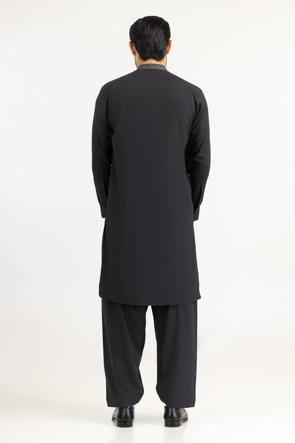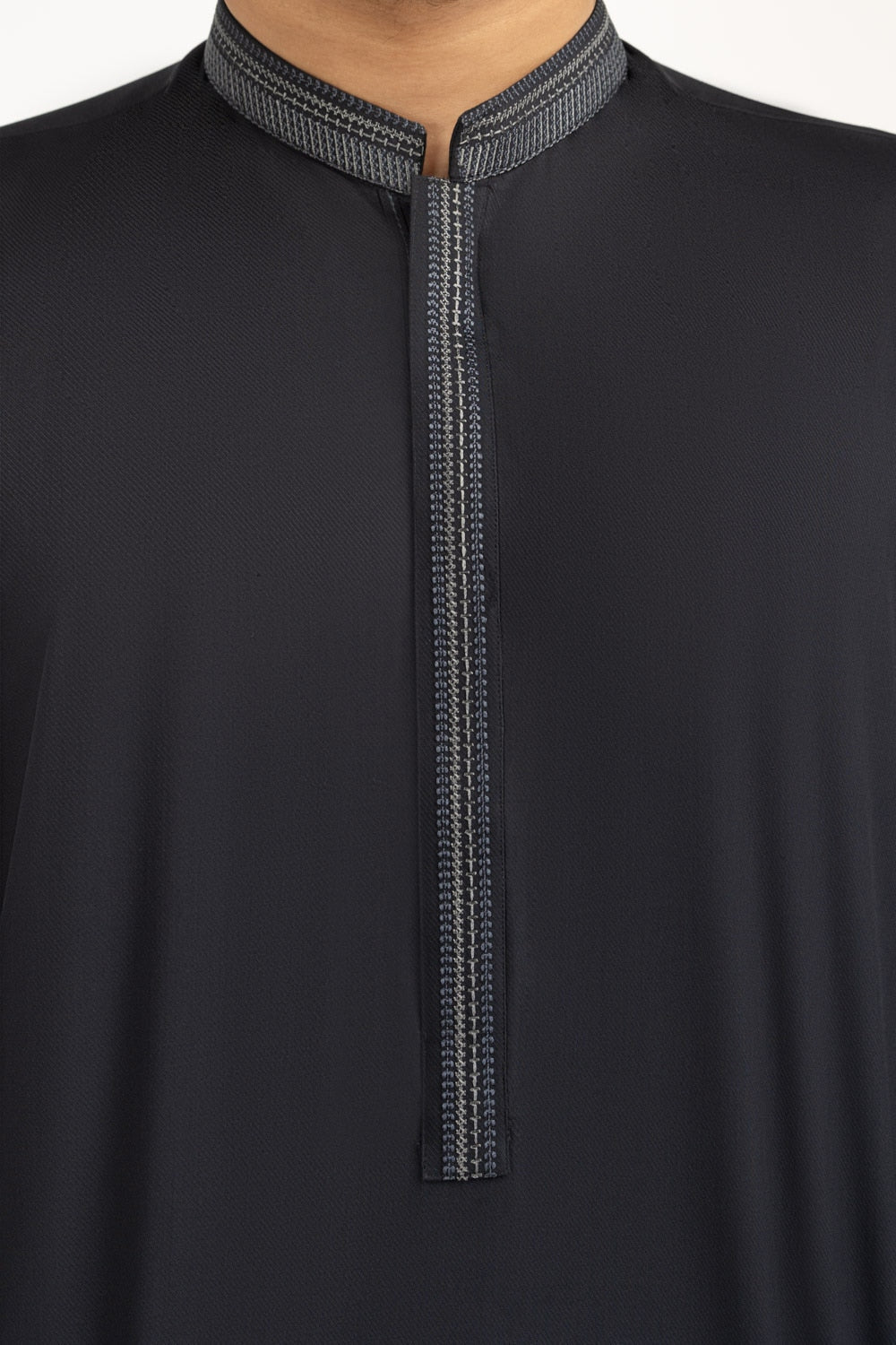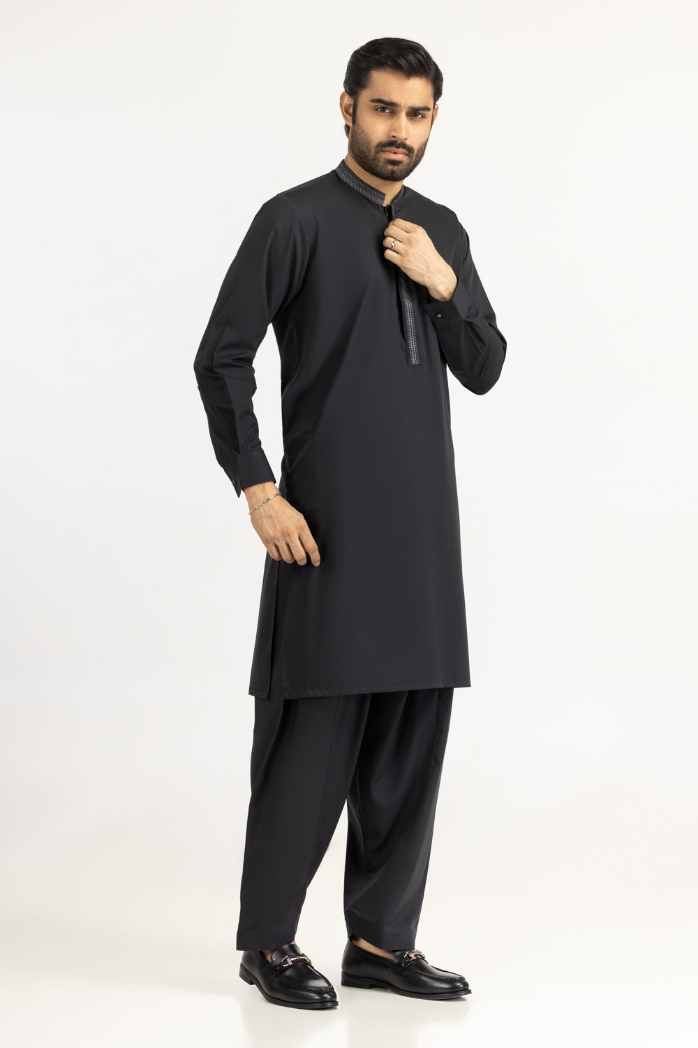 Crafted with simplicity and elegance, this three-piece Taupe Blended Fabric Formal Kameez Shalwar, paired with a waistcoat, exudes sophistication