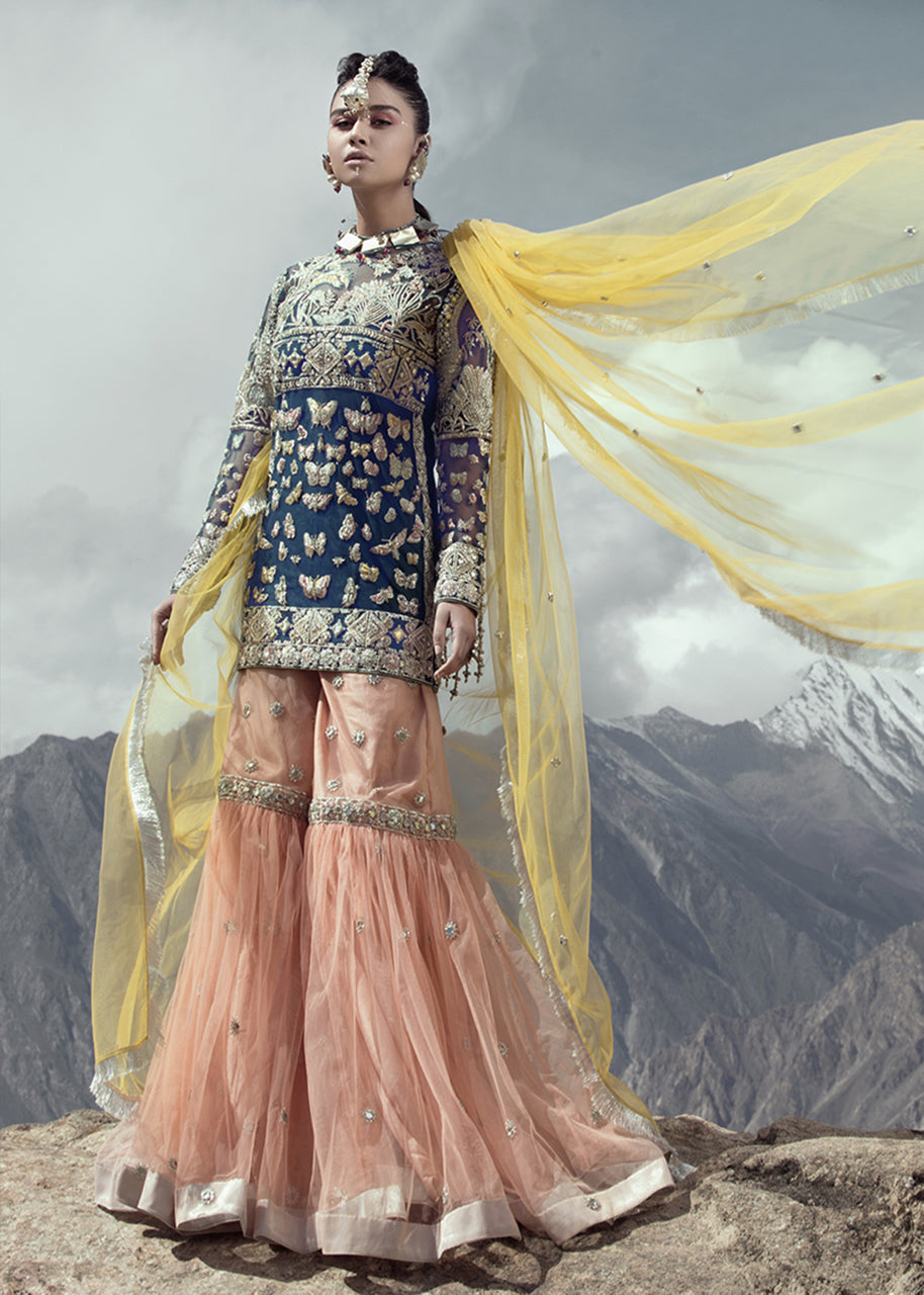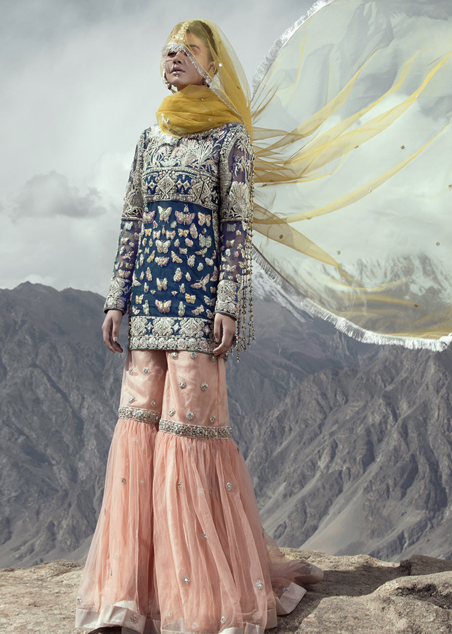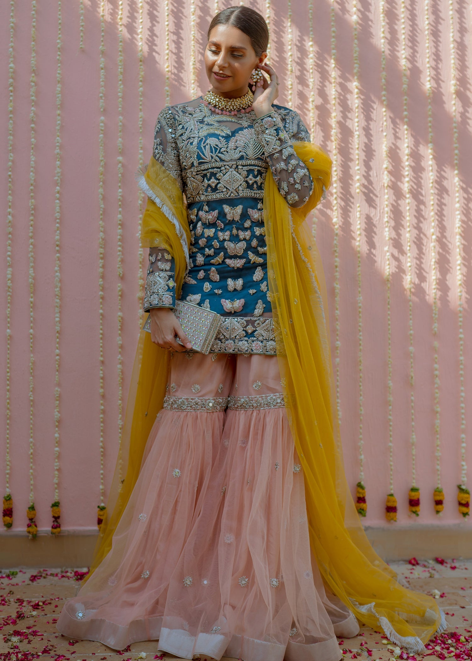 The blue butterfly net shirt is handcrafted with silver embellishment while the butterflies are scattered from the waist to the hem of the shirt. the shirt is finished in accent color in satin with medium silk lining. The pants are made in rose gold net. The gharara pants have a spray of mirror motifs.