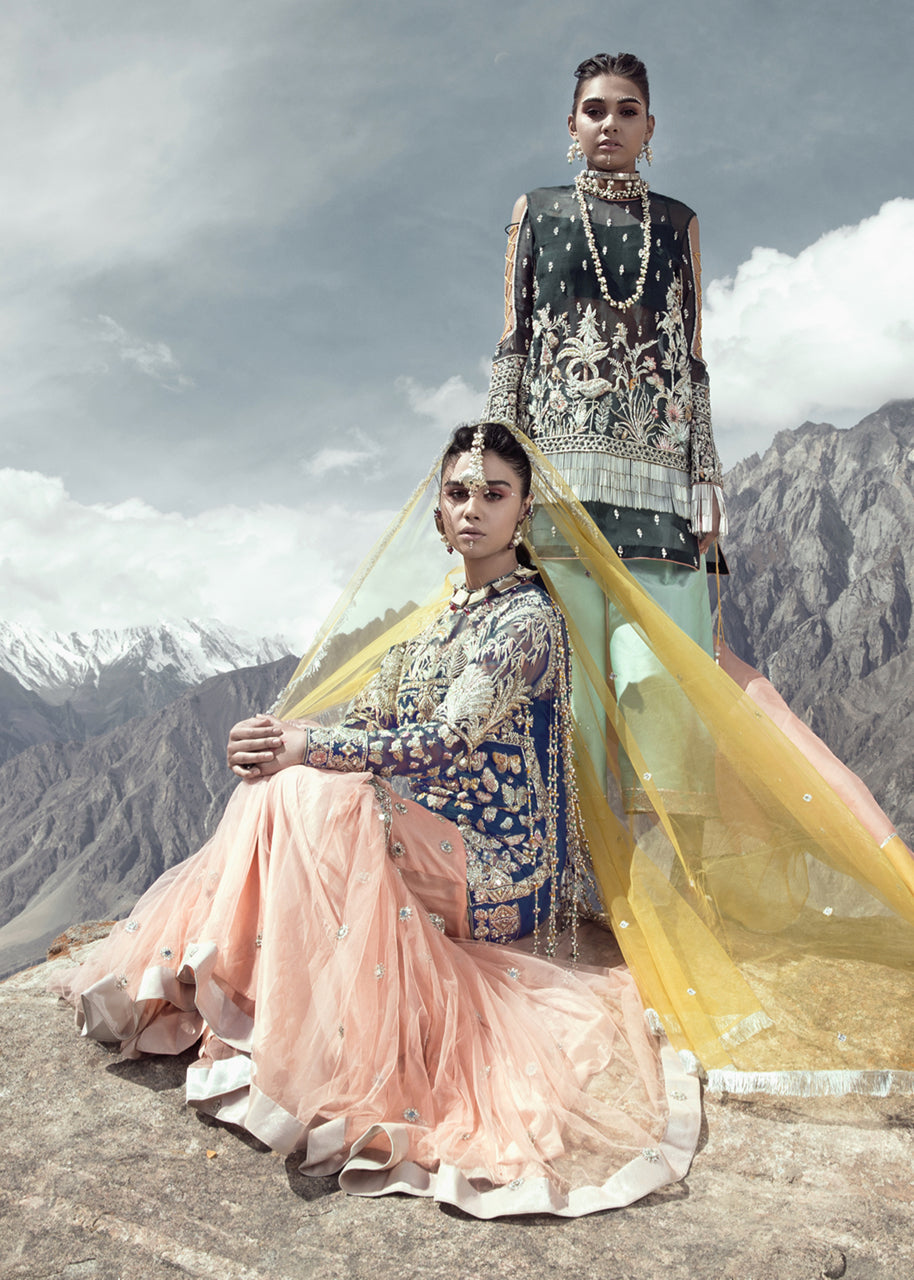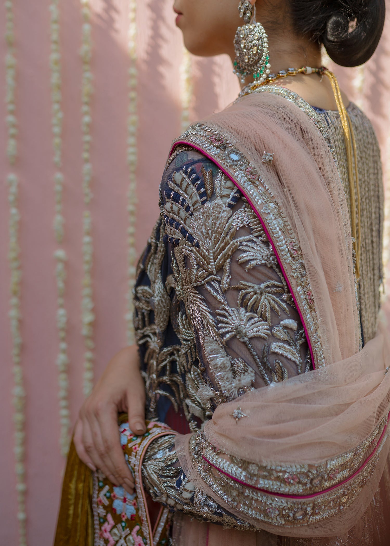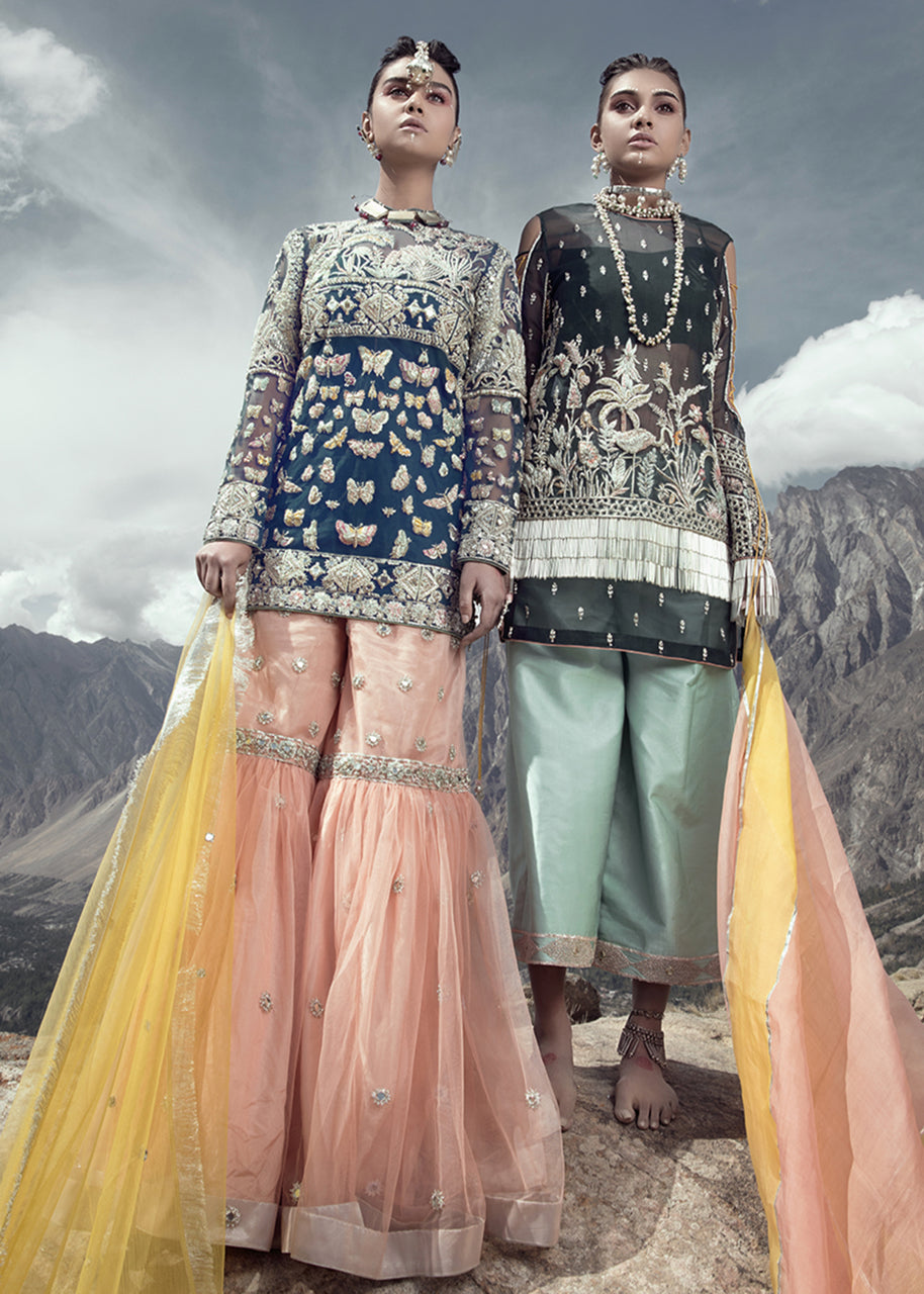 The blue butterfly net shirt is handcrafted with silver embellishment while the butterflies are scattered from the waist to the hem of the shirt. the shirt is finished in accent color in satin with medium silk lining. The pants are made in rose gold net. The gharara pants have a spray of mirror motifs.