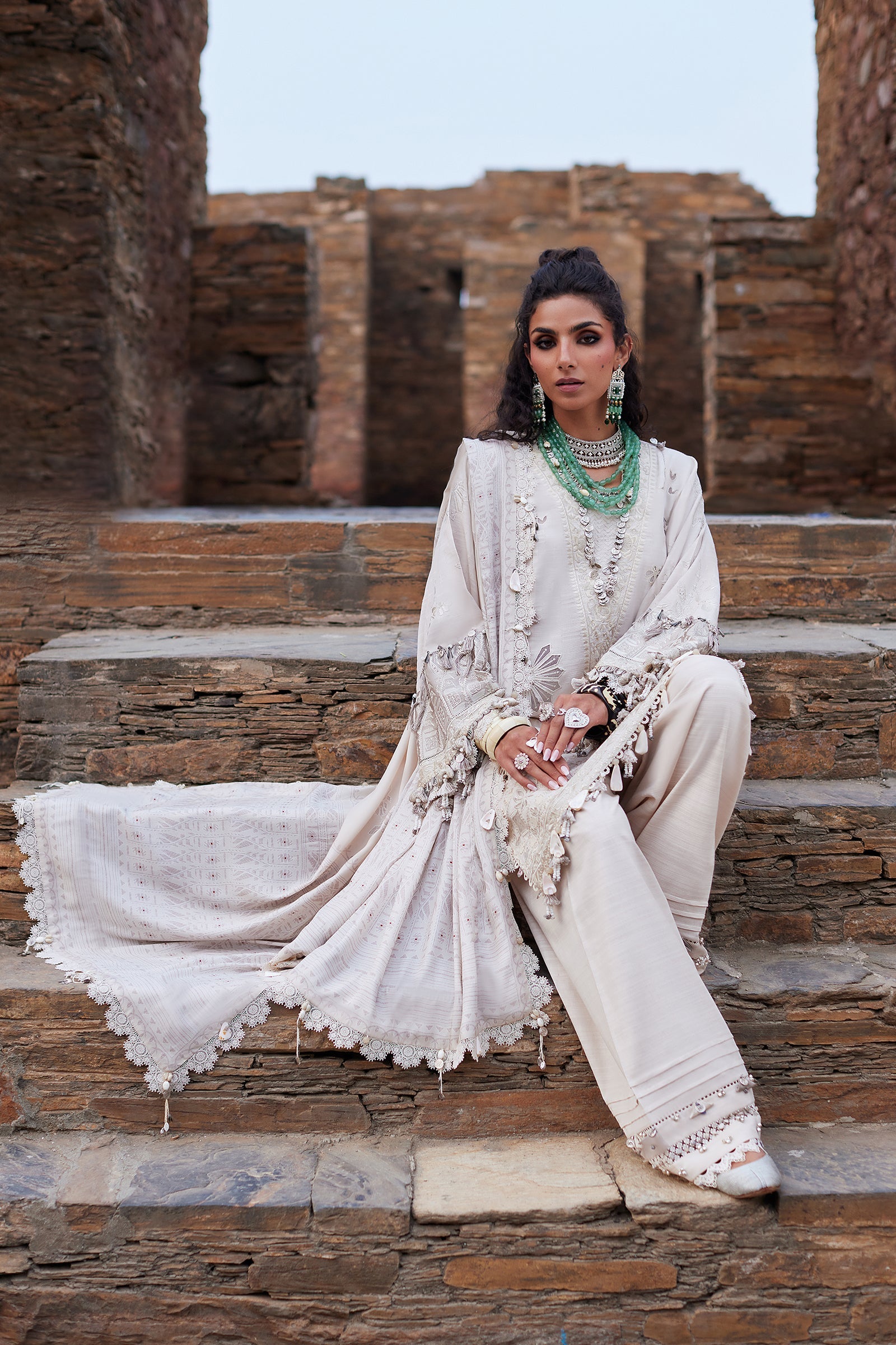 Completing this opulent ensemble is a luxurious karandi dupatta, richly adorned with a striking tribal pattern that embodies the rustic allure of nomadic winters. Feminine yet unapologetically bold, "Thalina" is the epitome of understated glamour, making it a statement choice for exclusive winter brunches and intimate gatherings. Celebrating the timeless enchantment of winter, this ensemble exudes sophistication, tribal artistry, and a distinctly feminine charm, setting a new benchmark in luxurious elegance.