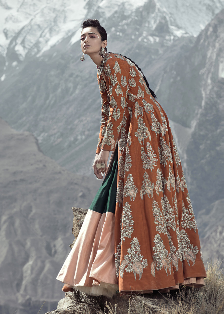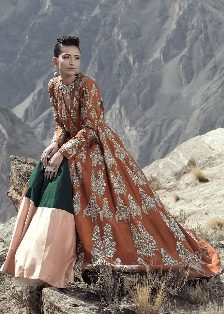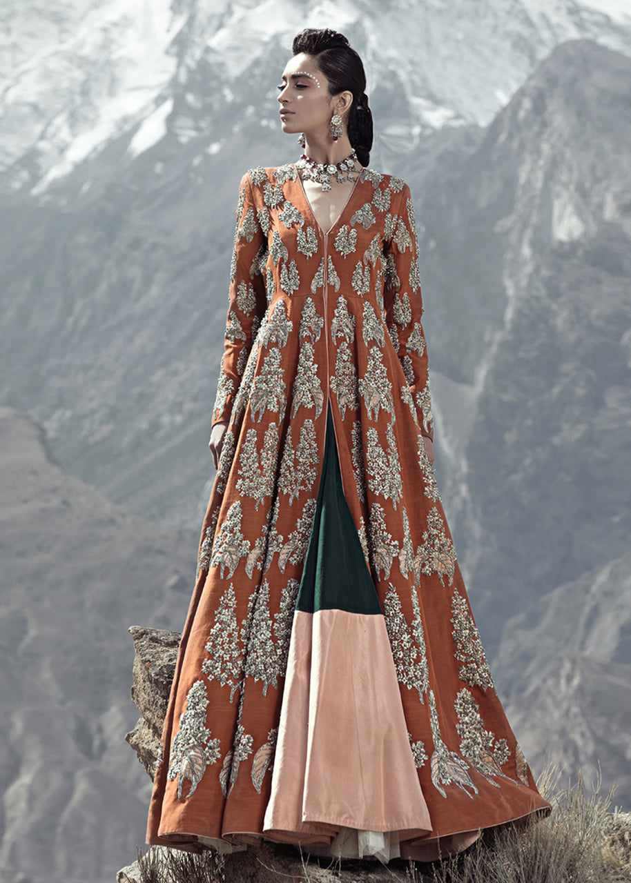 The floor length rust colored gown is made in raw silk. Chunky silver embellishments start from the shoulders and gradually increase in size going down to the hem. The gown is first patched with satin silk and then the motifs are embellished. The gown has a v neck with full sleeves while it closes to the waist with the help of hooks.