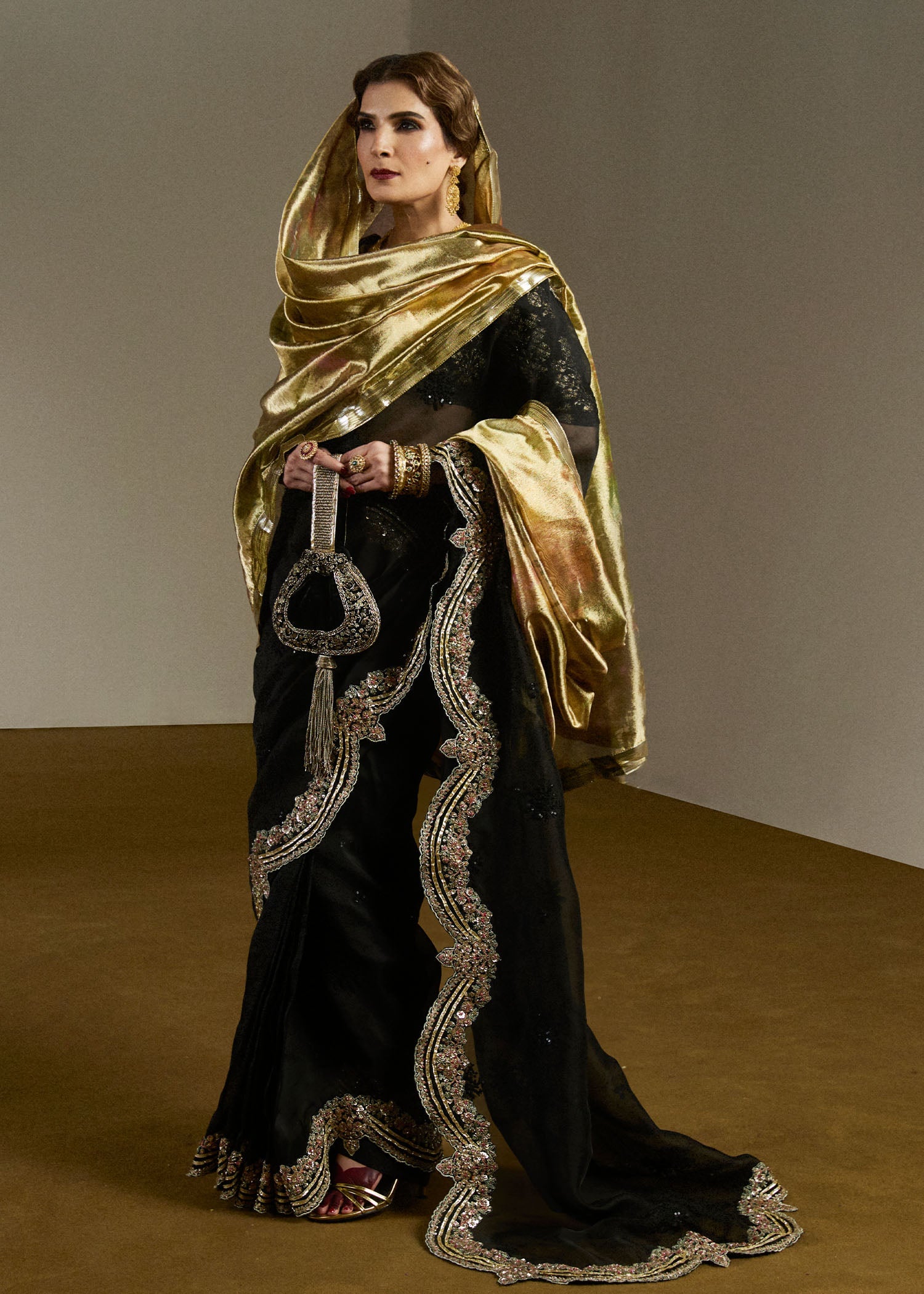 Step into elegance with our classic raven black saree, exquisitely hand-embellished with scalloped details that add a touch of sophistication. This timeless piece drapes beautifully, embodying grace and allure, making it a must-have for any wardrobe. Paired with a stunning shimmery golden V-neck blouse crafted from quilted chanderi silk, this ensemble radiates opulence. The heavy adorned tassels at the back create a captivating movement, ensuring you turn heads from every angle.